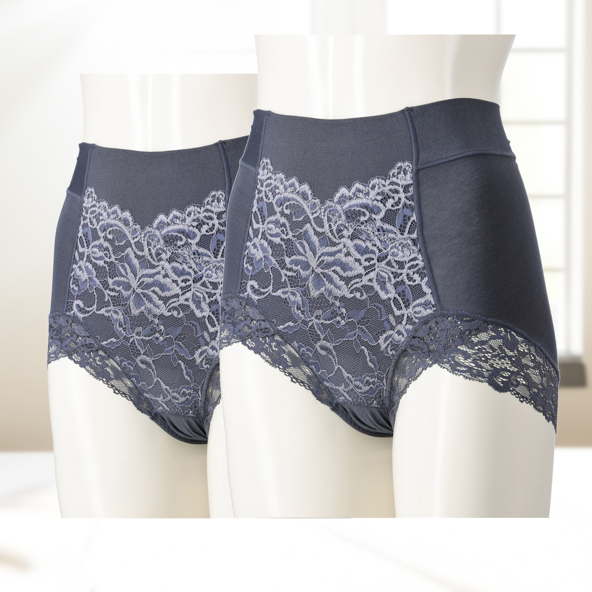 フロントはレースと身生地の間にパワーネットを内蔵した三重構造でお腹をシェイプ。内蔵パワーネットは、ウエスト上辺とそけい部を外して締め付け感を軽減。下辺は縫い付けずフリーな穿き心地で、肌側はナイロン綿ベア天竺素材で優しい肌触りです