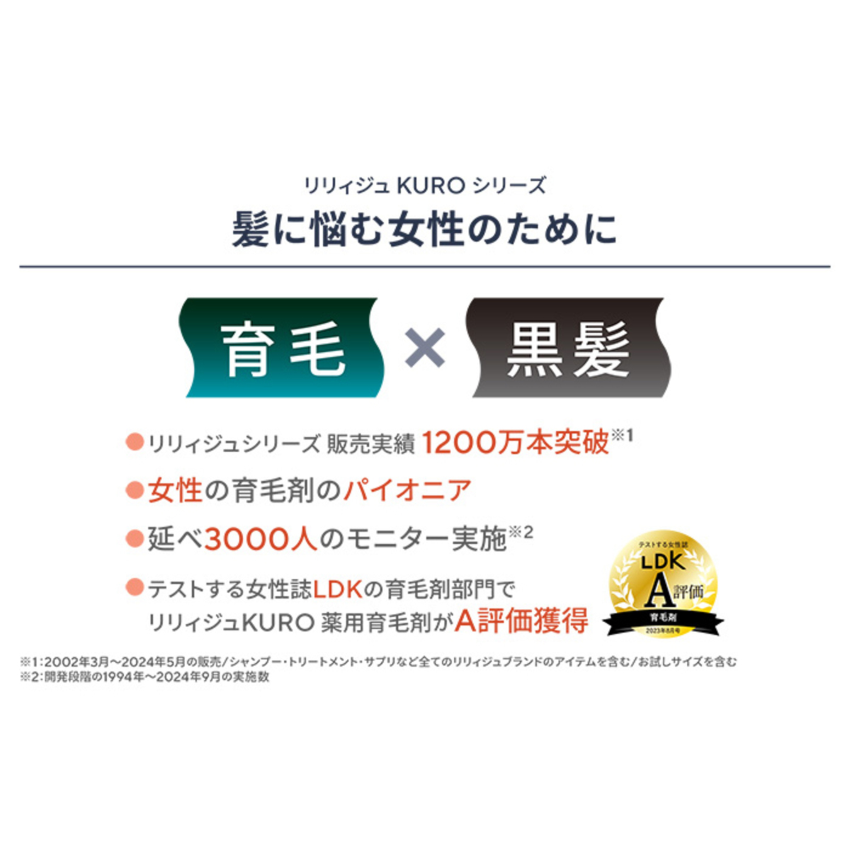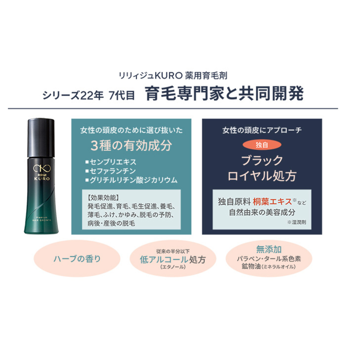 リリージュは知っていたのですがKUROは初めて使いました、他の育毛剤よりお求め易いお値段で使用感もいい感じです 続けて行くにはお値段大事ですね白髪も減るといいなぁと思っています
