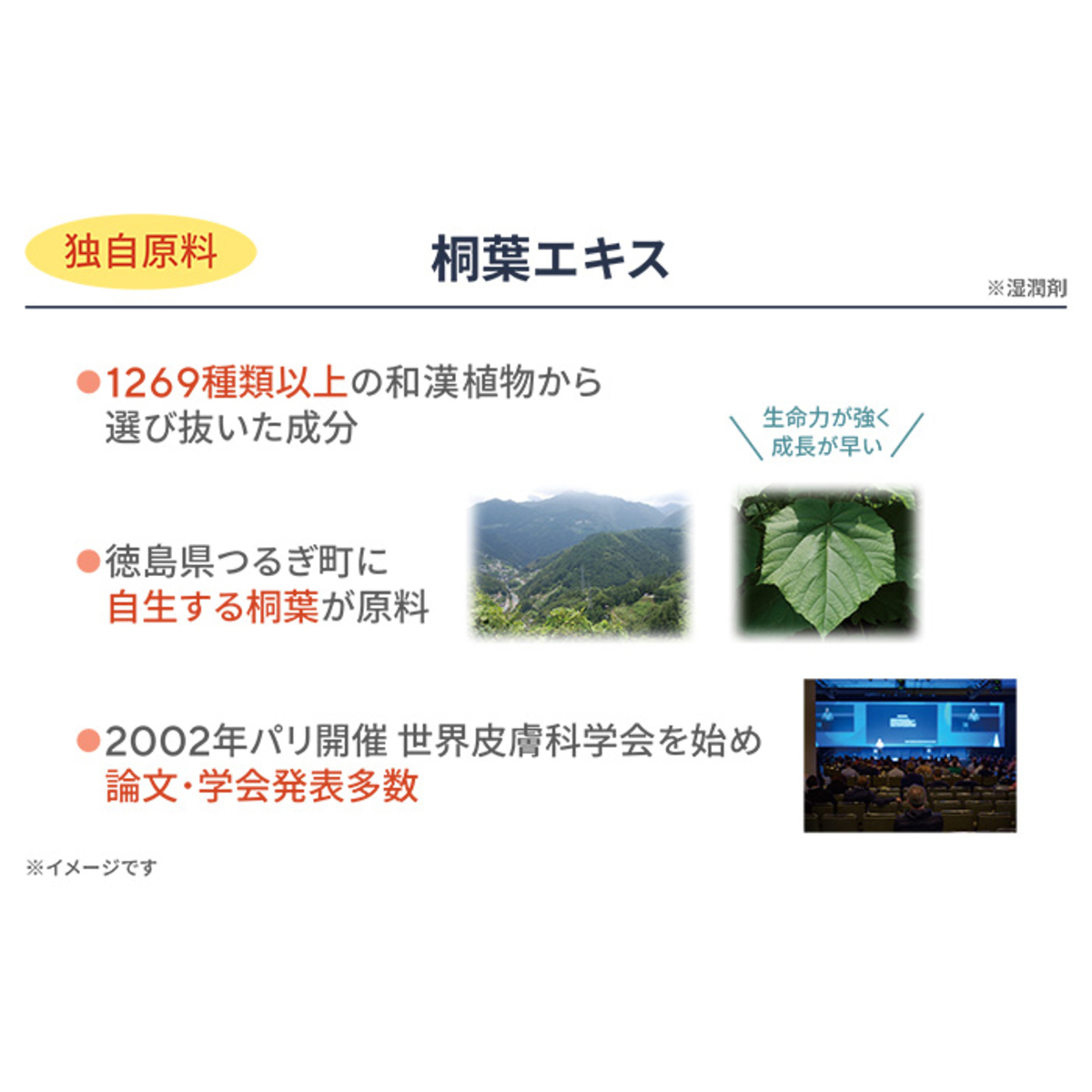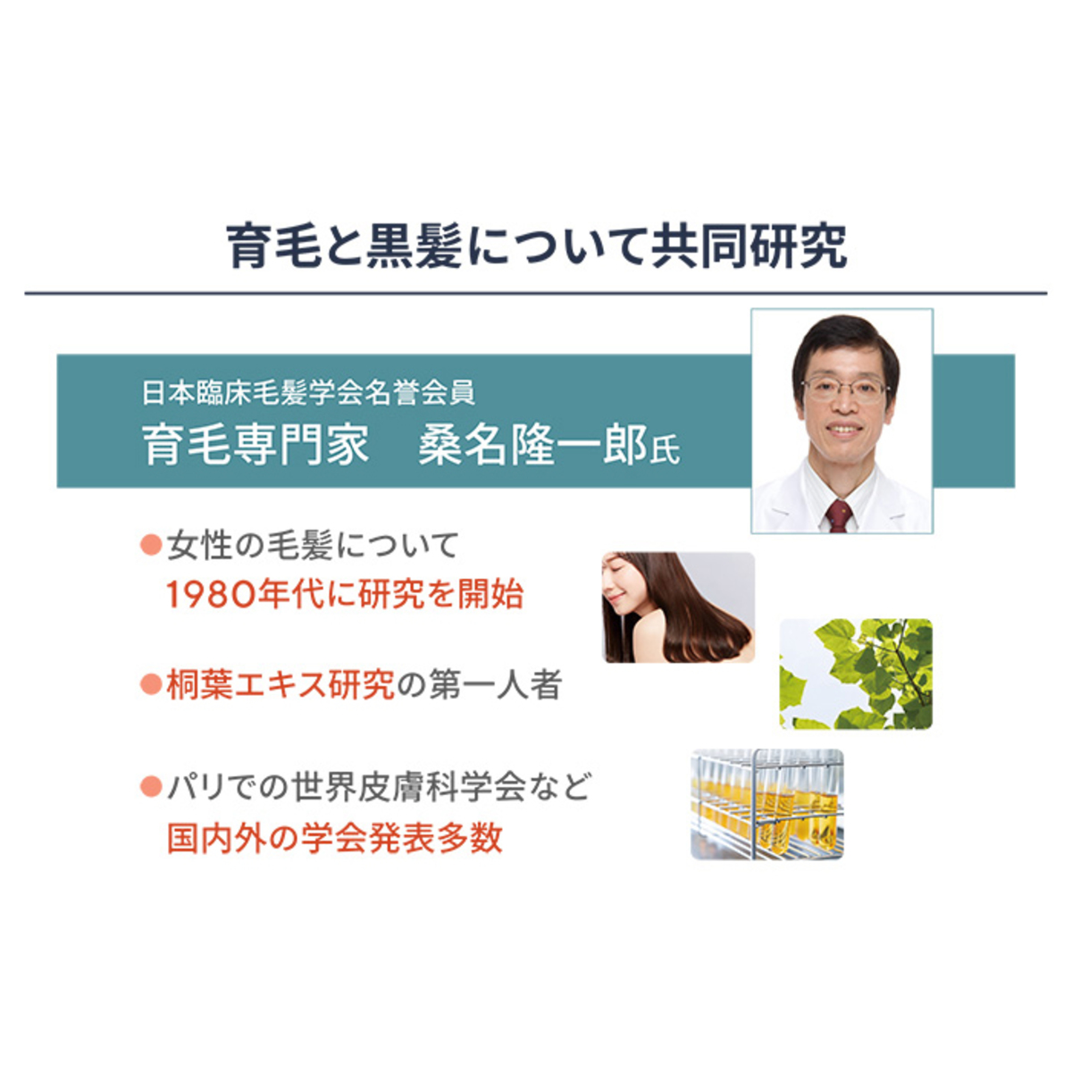 桐葉エキス、オランダカラシエキス、ヘマチン(ヘマチン液)、アシタバエキス、マヨラナエキス(*)をブレンドしたブラックロイヤル処方。桐葉エキスは1269種類の和漢植物を育毛専門家と検証して選び抜いた独自原料です