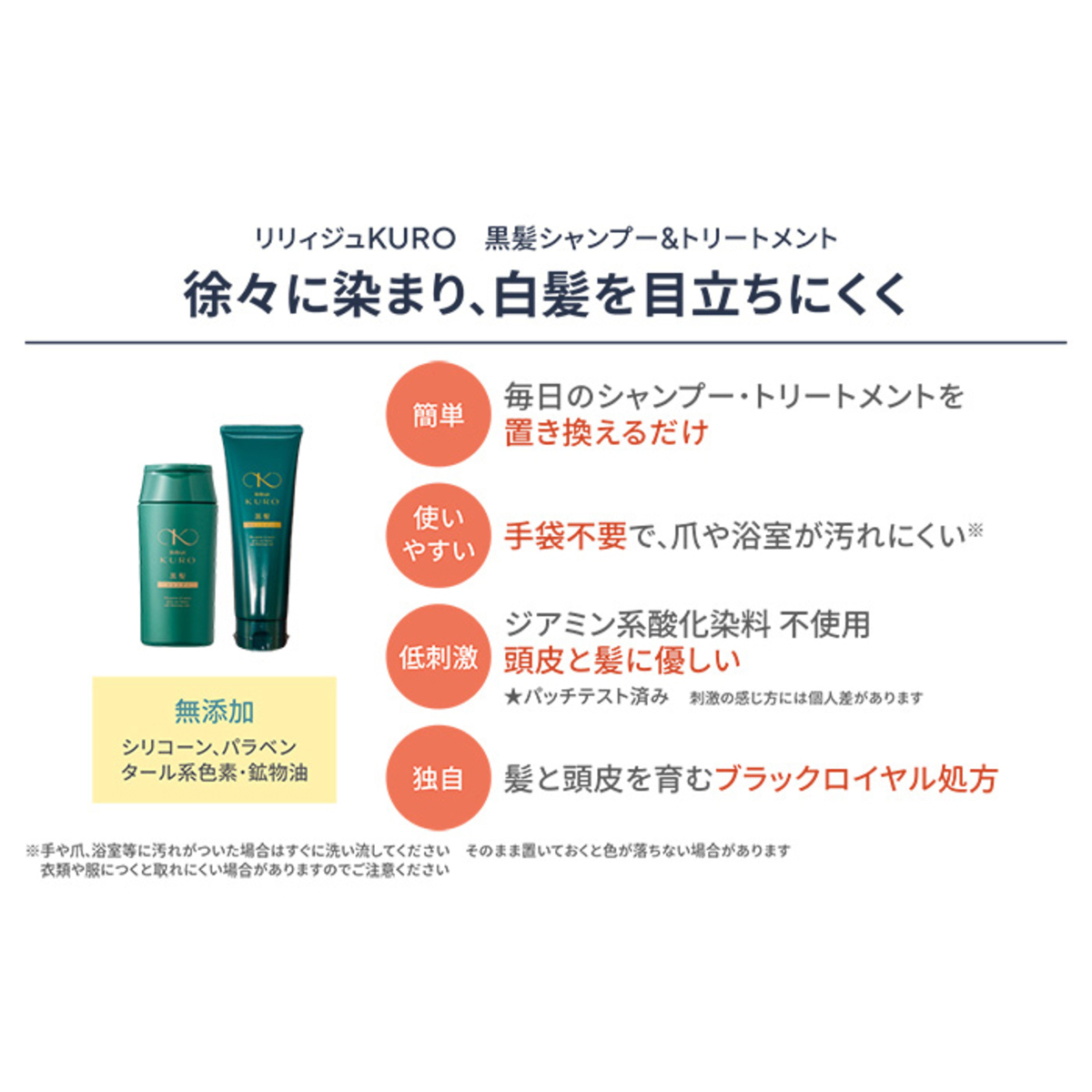 [商品内容] ・黒髪シャンプー(リリィジュBL SH1)250ml ・黒髪トリートメント(リリィジュBL T1)250ml ・黒髪シャンプー 10ml・黒髪トリートメント 10g パウチ ※プレゼント [使用方法] <シャンプ> 髪をよくぬらしたあと、適量をぬれた手にとり、軽く泡立たせながら毛髪になじませ、洗髪してください。その後、色のついた水が出なくなるまでしっかりすすいでください <トリートメント> シャンプー後、髪の水気をきってから、適量をぬれた手に取ってください。髪全体に塗布し、もみこむようによくなじませてから、色のついた水が出なくなるまでしっかりすすいでください [注意事項] ※アレルギー体質の方、肌が敏感な方はご使用前に必ずパッチテストを行ってください ※お肌や頭皮に異常が生じていないかよく注意して使用してください ※お肌や頭皮に合わないとき即ち次のような場合には、ご使用をおやめください。そのまま使用を続けますと、症状を悪化させることがありますので、皮膚科専門医等にご相談されることをおすすめします (1)使用中、赤み、はれ、かゆみ、刺激、色抜け(白斑等)や黒ずみ(製品による汚れを除く)等の異常があらわれた場合 (2)使用したお肌や頭皮に、直射日光があたって上記のような異常があらわれた場合 ※傷、はれもの、湿疹等、異常のあるときはお使いにならないでください ※目に入ったときは、直ちに洗い流してください。目に異物感が残る場合は、眼科医にご相談ください ※皮膚、爪、浴室等についた場合はすぐに洗い流してください。そのまま置いておくと色が落ちない場合がございます ※パーマ、その他の染毛剤等とあわせてご使用される場合、髪の状態によっては思い通りの色に仕上がらない場合がございます ※衣服や布等につくと取れにくい場合がございますので、ご注意ください ※髪が濡れた状態では衣服や帽子、タオル、枕カバー等に色移りすることがありますので、ご注意ください ※使用後は必ずしっかり蓋をしめてください ※乳幼児の手の届かないところに保管してください ※極端に高温または低温の場所、直射日光のあたる場所に保管しないでください 【日本製】 [成分] リリィジュ KURO 黒髪シャンプー: 水、ラウレス-6カルボン酸Na、コカミドDEA、ココイルメチルタウリンNa、ラウレス-4カルボン酸Na、コカミドプロピルベタイン、ココアンホ酢酸Na、フェノキシエタノール、ソルビトール、ポリクオタニウム-10、ジステアリン酸PEG-150、クエン酸、塩化Na、安息香酸Na、塩基性青99、アルギニン、ペンテト酸5Na、塩基性赤76、サリチル酸、BG、塩基性茶16、サルビアヒスパニカ種子油、オリーブ果実油、エタノール、グリセリン、炭、PG、加水分解ケラチン(羊毛)、 トシルバリンNa、BHT、キリ葉エキス、ヘマチン、マヨラナ葉エキス、プラセンタ脂質、ジステアリルジモニウムクロリド、アシタバ葉/茎エキス、クオタニウム-33、オランダガラシ葉/茎エキス、コレステロール、アルニカ花エキス、オドリコソウ花/葉/茎エキス、ゴボウ根エキス、セイヨウアカマツ球果エキス、セイヨウキズタ葉/茎エキス、ニンニク根エキス、ローズマリー葉エキス、ローマカミツレ花エキス、セラミドNG、イソプロパノール、セラミドNP、セラミドAP リリィジュ KURO 黒髪トリートメント: 水、パルミチン酸エチルヘキシル、ソルビトール、セタノール、ステアルトリモニウムブロミド、ステアリルアルコール、ベンジルアルコール、ラノリン、BG、フェノキシエタノール、DPG、イソプロパノール、ステアリン酸グリセリル、ドデカン、セテス-30、 ミリストイルメチル-β-アラニン(フィトステリル/デシルテトラデシル)、トリ(カプリル酸/カプリン酸)グリセリル、ダイマージリノール酸ダイマージリノレイル、リン酸2Na、安息香酸Na、塩基性青99、リン酸Na、ステアリン酸PEG-45、塩基性茶16、オリーブ果実油、サルビアヒスパニカ種子油、塩基性赤76、塩基性茶17、エタノール、アボカド油、ステアルジモニウムヒドロキシプロピル加水分解ケラチン(羊毛)、PG、加水分解ケラチン(羊毛)、トシルバリンNa、 トコフェロール、キリ葉エキス、アルガニアスピノサ核油、ヘマチン、マヨラナ葉エキス、プラセンタ脂質、ジステアリルジモニウムクロリド、アシタバ葉/茎エキス、クオタニウム-33、オランダガラシ葉/茎エキス、コレステロール、オプンチアフィクスインジカ種子油、バオバブ種子油、セラミドNG、セラミドNP、セラミドAP、パルミチン酸アスコルビル、アミリスバルサミフェラ樹皮油、アルテミシアパレンス花/葉/茎油、他