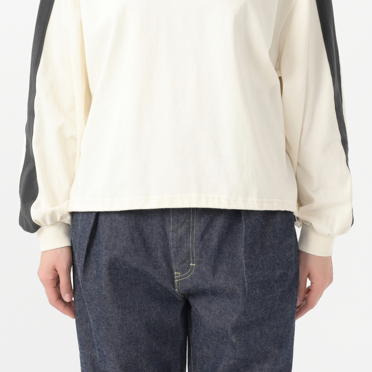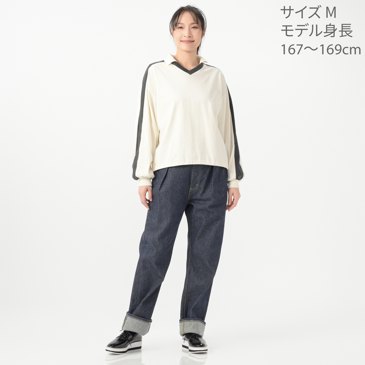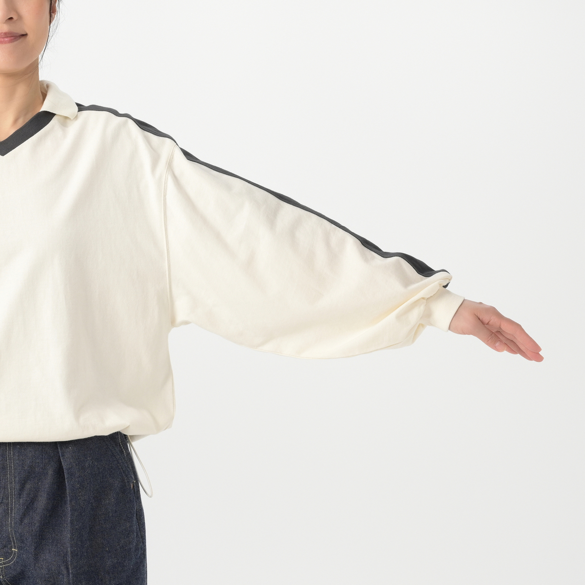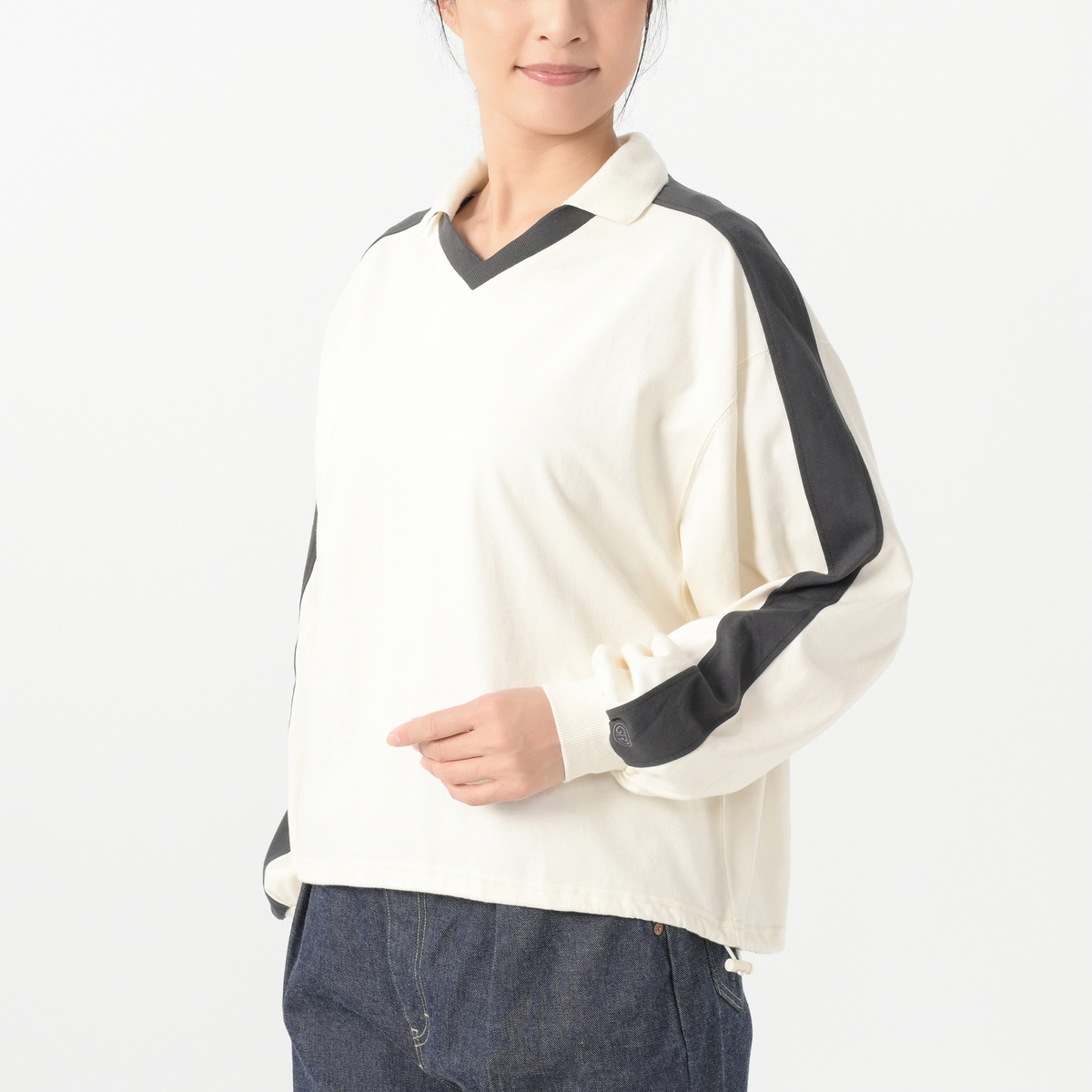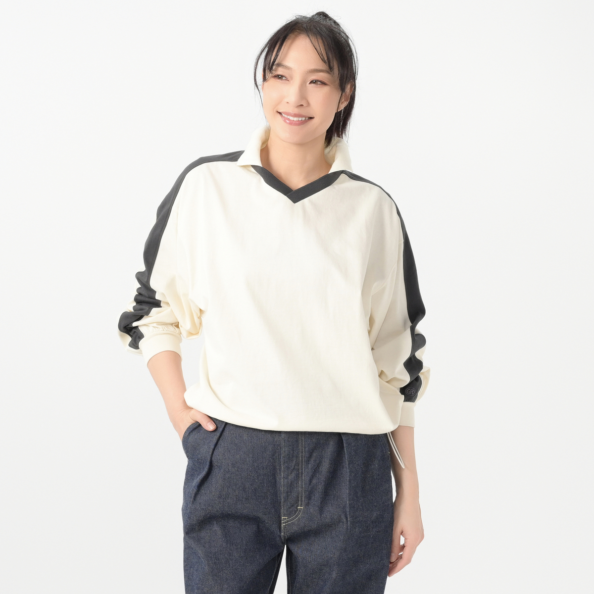 肩〜袖口に入れた配色ライン切替や、ポロシャツ風のえり付きデザインがスポーティーなロンT。裾にはストッパー&ドローコードを仕込んであり、キュッと裾絞りにして内側に折り込めば、インしたような着こなしに。程よくブラウジングするので、気になるウエストやお腹周りをさりげなくカバーしながら、こなれた大人カジュアルを演出できます