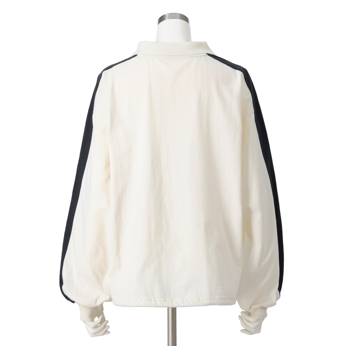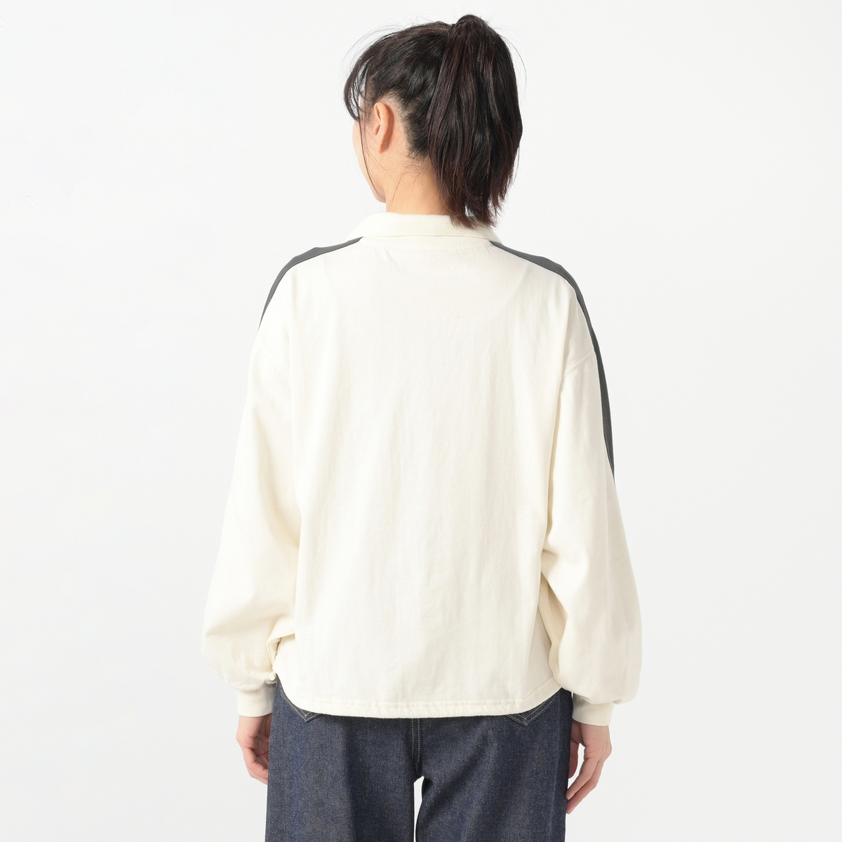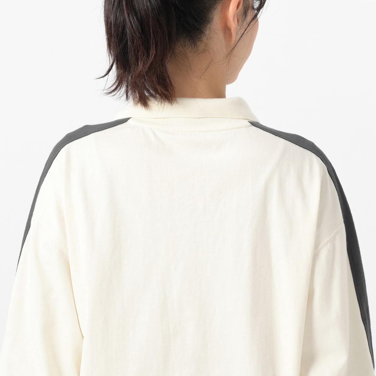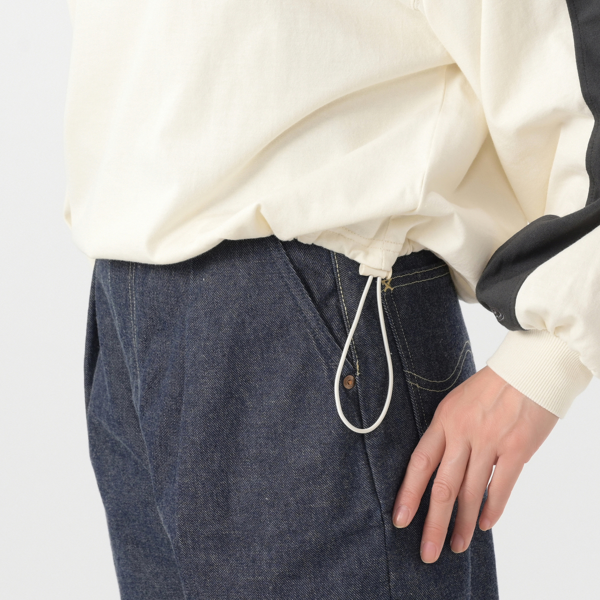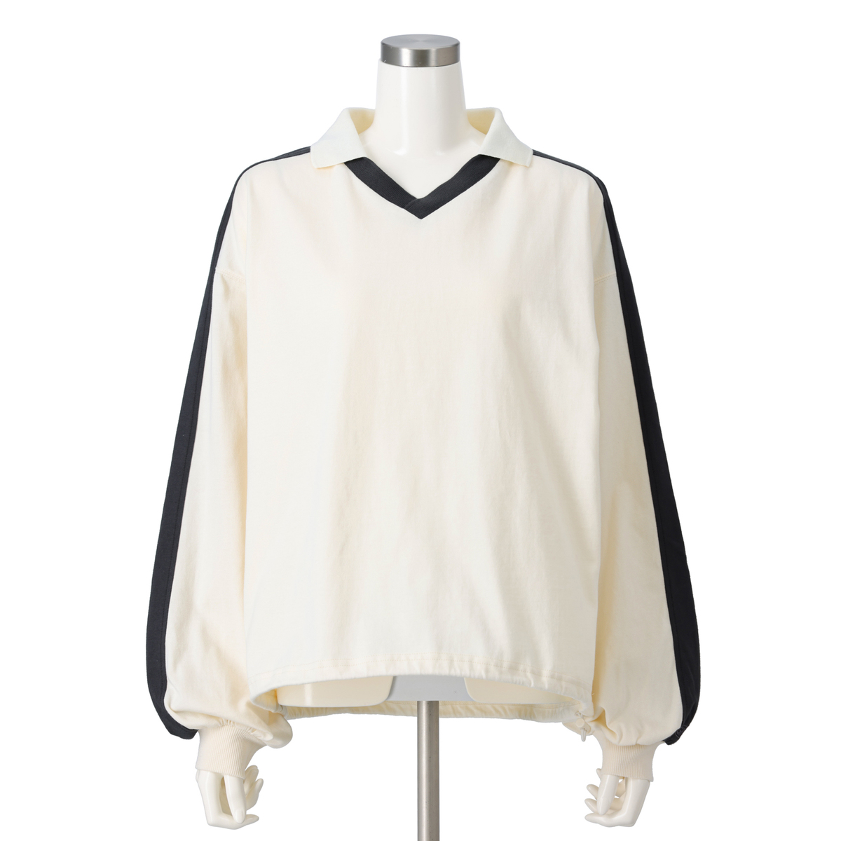 肩〜袖口に入れた配色ライン切替や、ポロシャツ風のえり付きデザインがスポーティーなロンT。裾にはストッパー&ドローコードを仕込んであり、キュッと裾絞りにして内側に折り込めば、インしたような着こなしに。程よくブラウジングするので、気になるウエストやお腹周りをさりげなくカバーしながら、こなれた大人カジュアルを演出できます