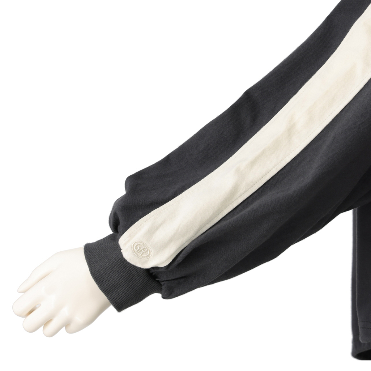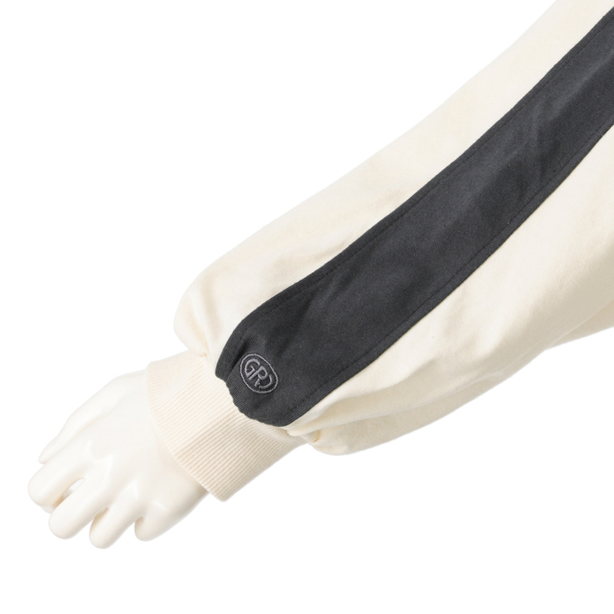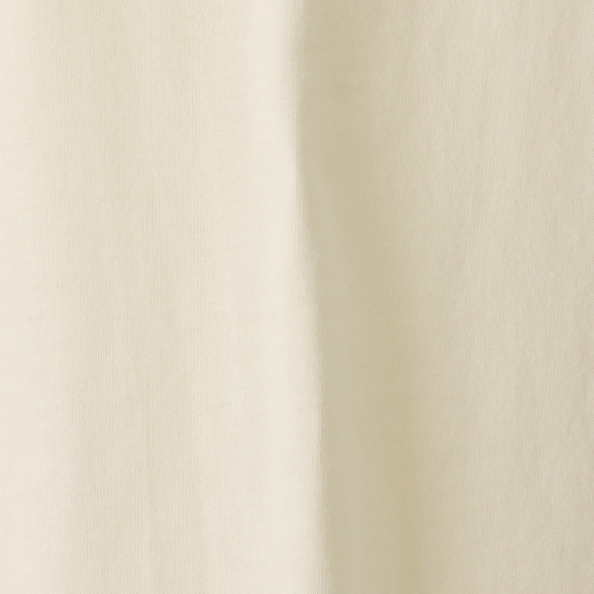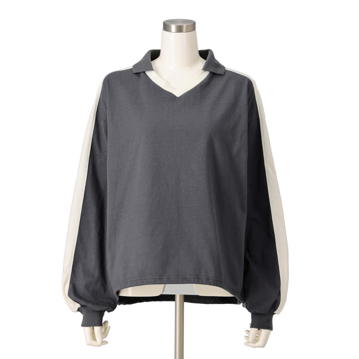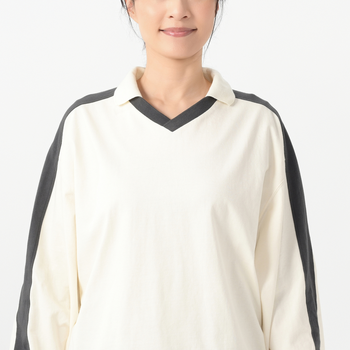 本体生地は、程よい肉感で1枚でも透けにくく、程よいハリ感のある天竺素材。ライン切替部分も同生地の配色使いをしています。えりはポロシャツ風の編立リブえりを採用。袖口リブには同色系、Vえりぐりには配色リブをそれぞれ使用し、左袖口にはワンポイントのロゴ刺繍入りです