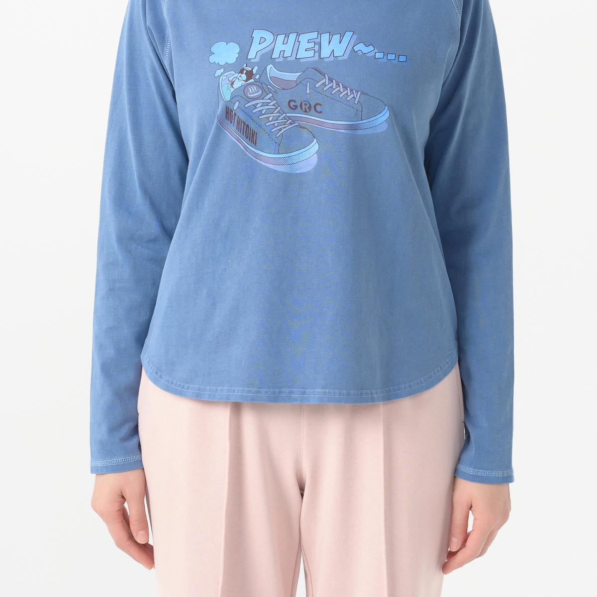 スニーカーのお風呂に気持ちよさそうにつかるホット君がキュートな、プリントデザインTシャツ。1枚でも透けにくく、程よいハリ感のある天竺素材を使用。製品で顔料染加工を施してヴィンテージ感のある表情に仕上げました。色が少しずつ薄くなっていく経年変化も楽しめます。えりはリブ素材を別布使いしました