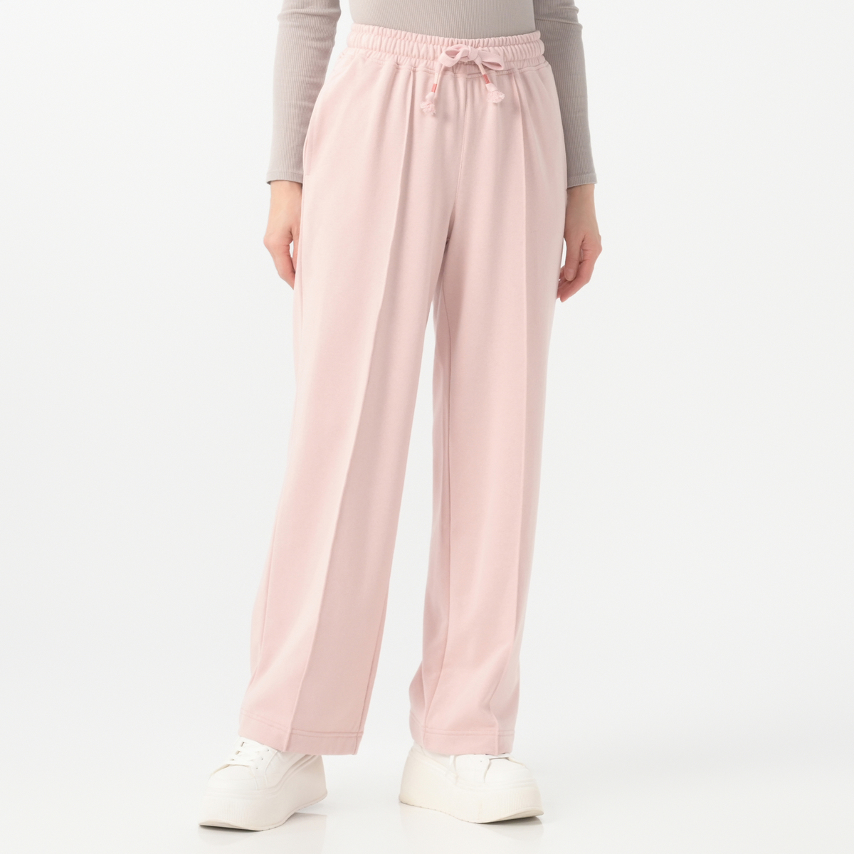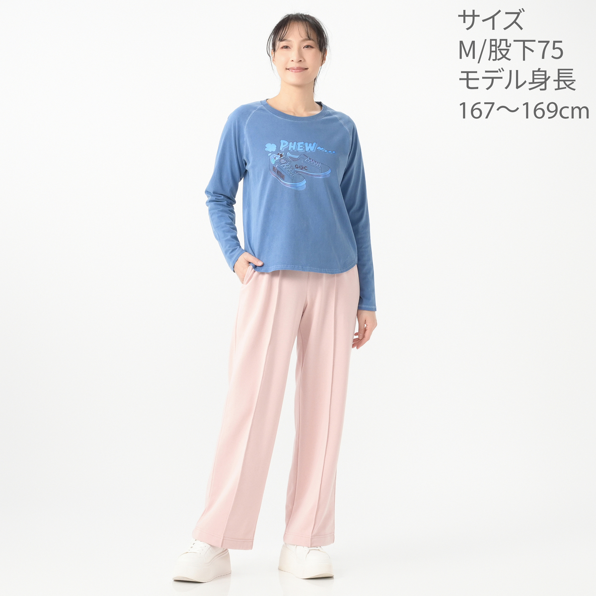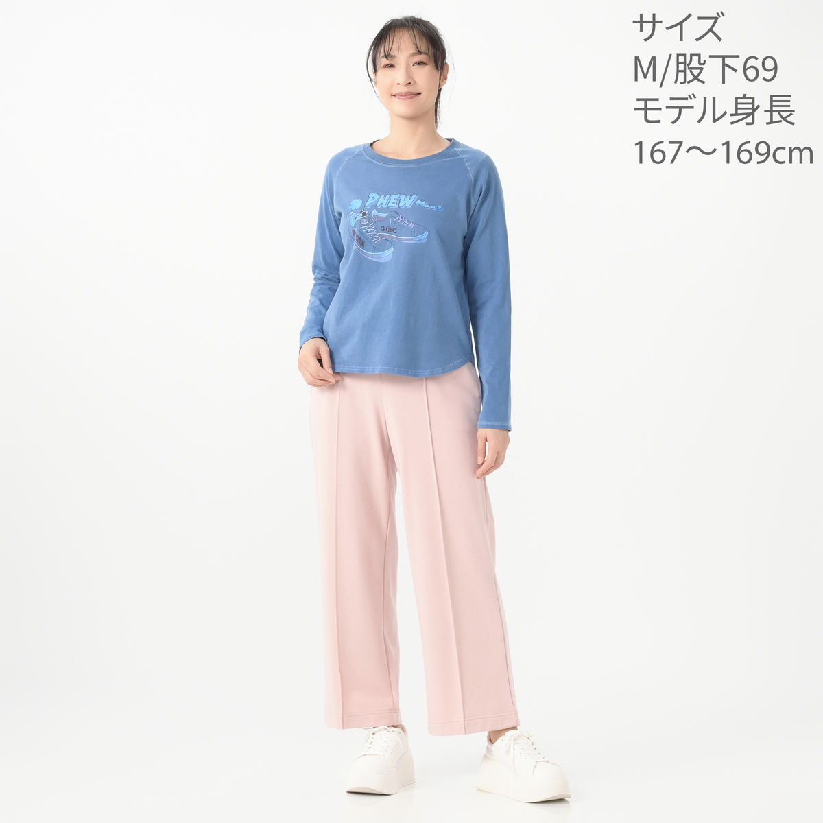 センタープレス風のピンタックデザインが脚をまっすぐに見せてくれるセミワイドパンツ。ウエストは総ゴム仕様。トップス次第で、ルームウェアでもタウンでも活躍します