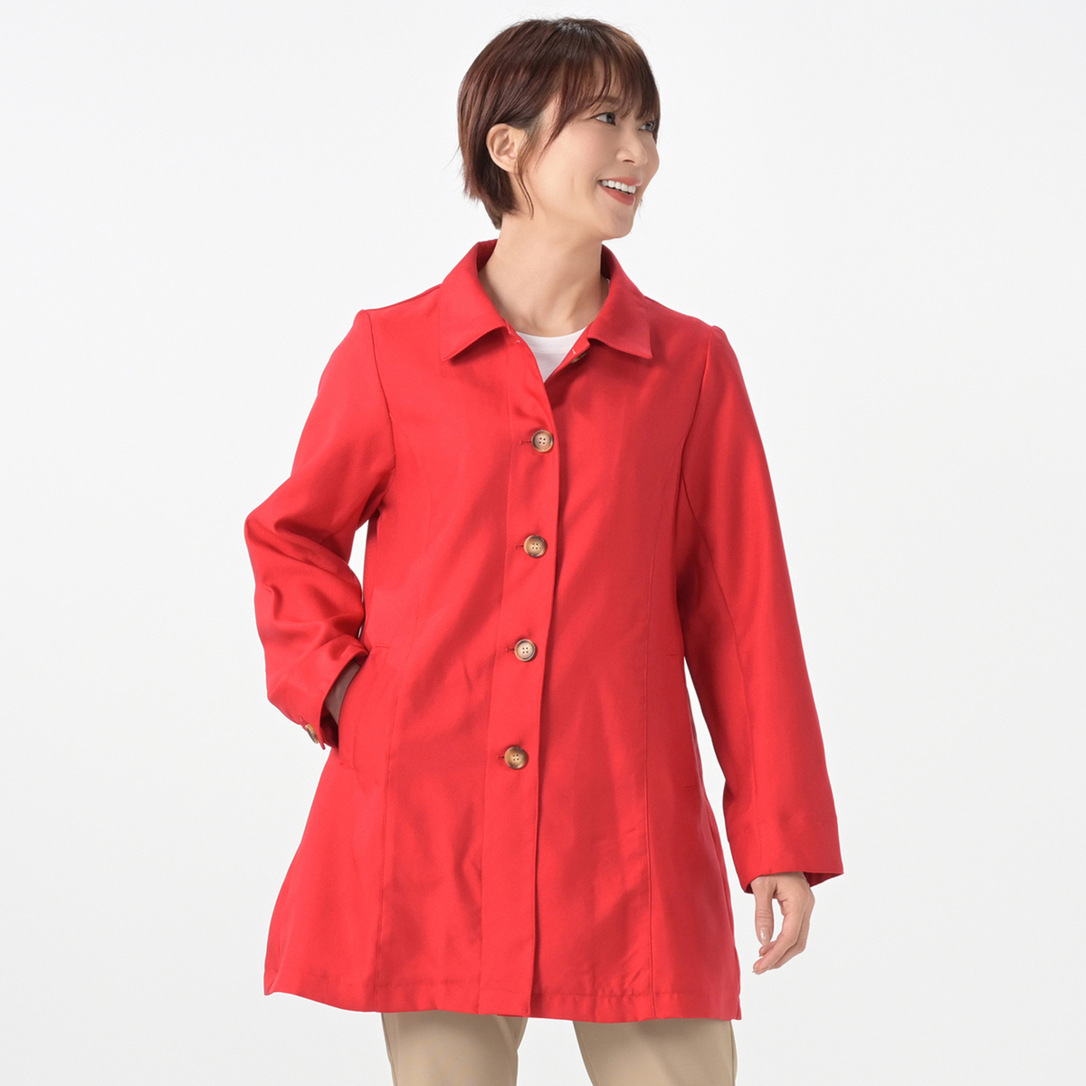 ベーシックなデザインでオンオフ問わず活躍するライトコート。スタンダードなステンカラーのコートに、デニム調に見える素材を使用する事で、大人カジュアルなイメージに。フロントは配色のボタンでアクセントを添えています
