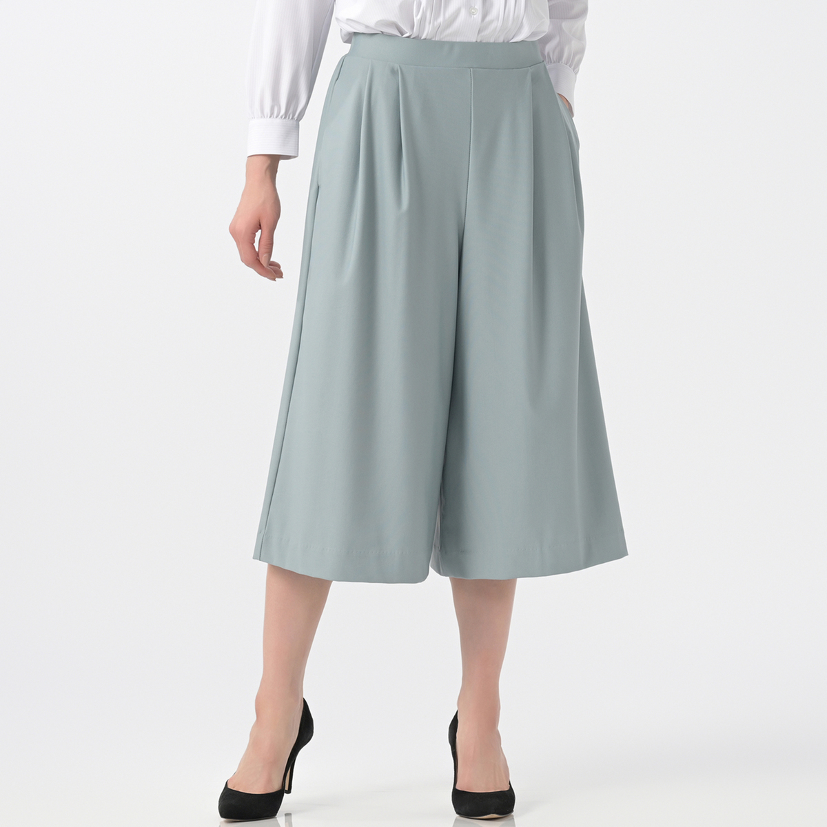 美しいフレア感が楽しめるスカーチョ。ふくらはぎが隠れる長さのシンプルなデザインに仕上げました。スカートようにスタイリングできるアイテムながらもパンツなので、風が吹いてもめくり上がることなく着用できます
