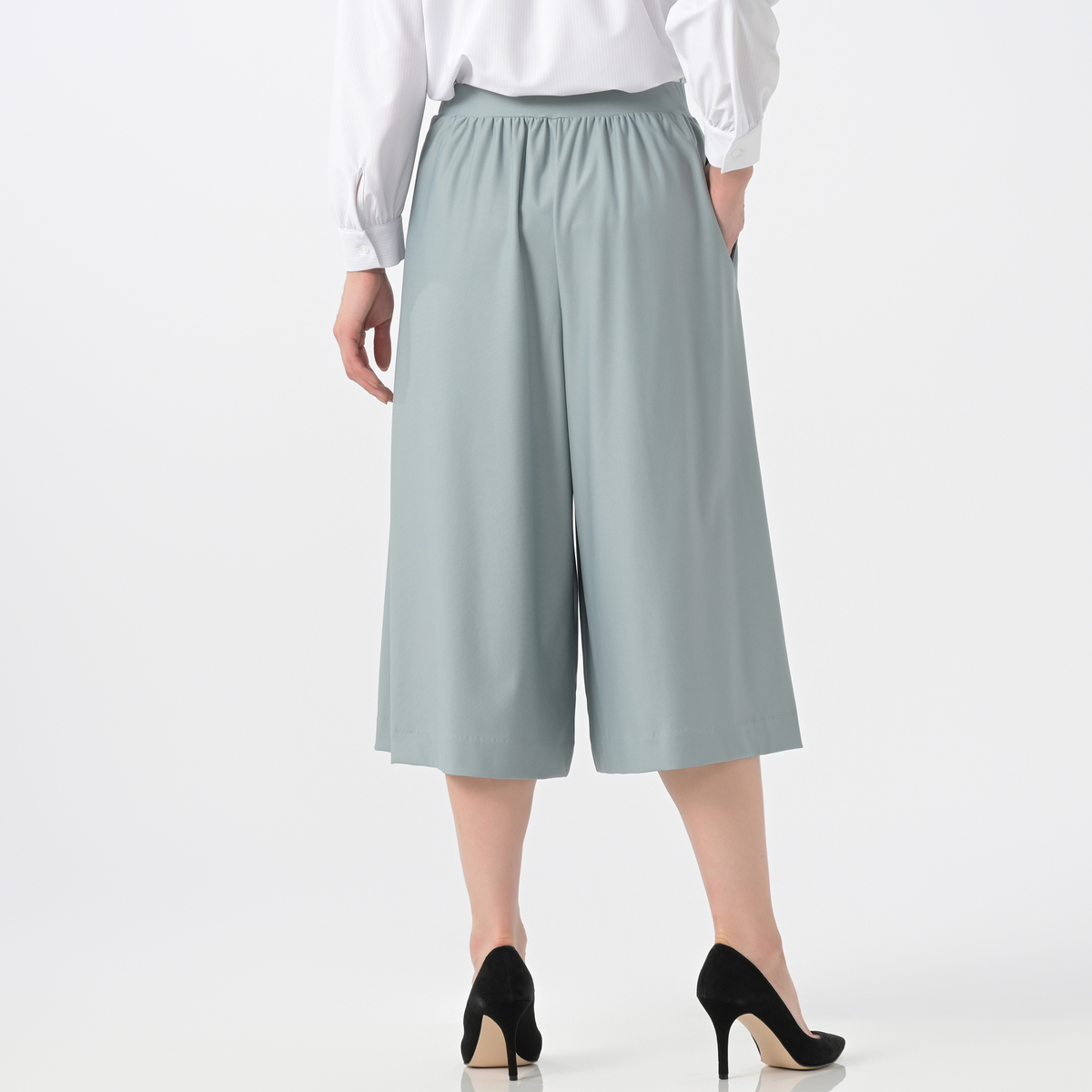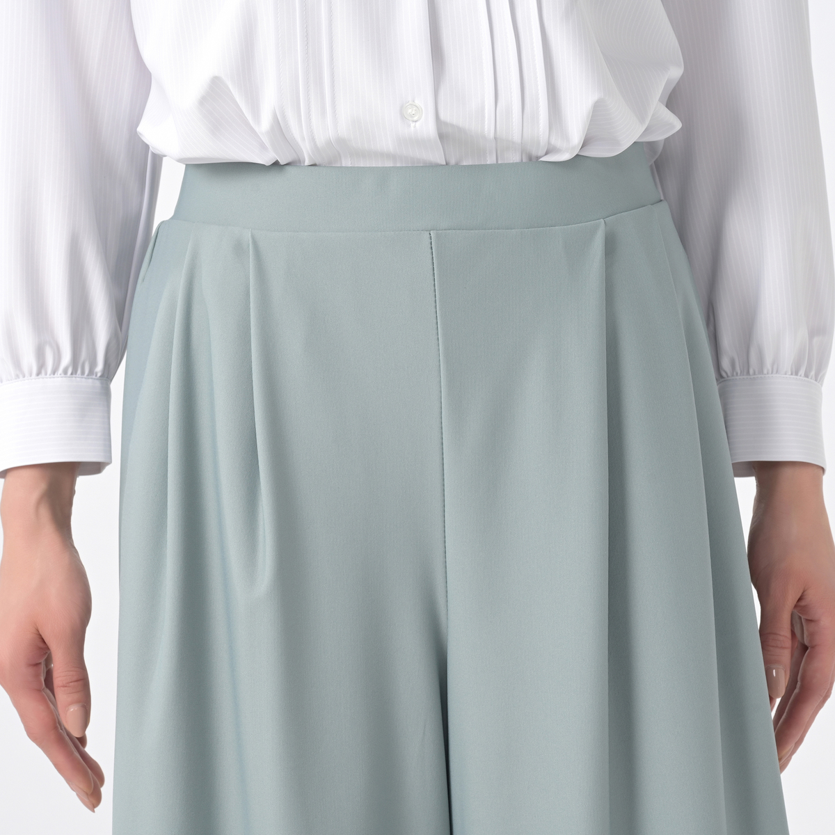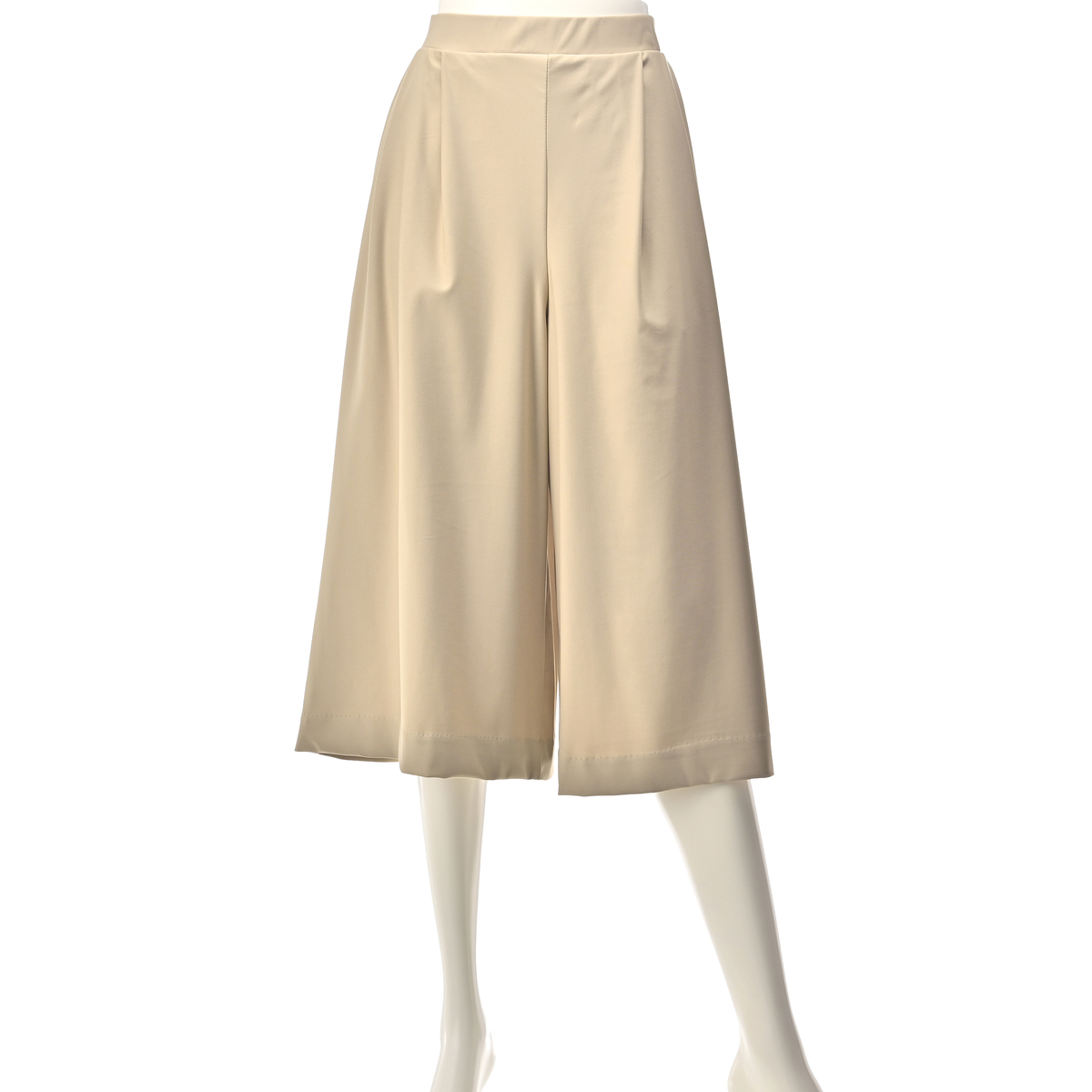 布帛見えのハイテンション素材を使用。エレガントに着こなせるきれいめな素材感ながらも伸縮性があり、ウエストはゴム仕様のプルオンタイプでラクに穿けるアイテムです