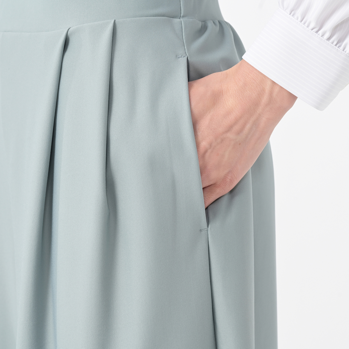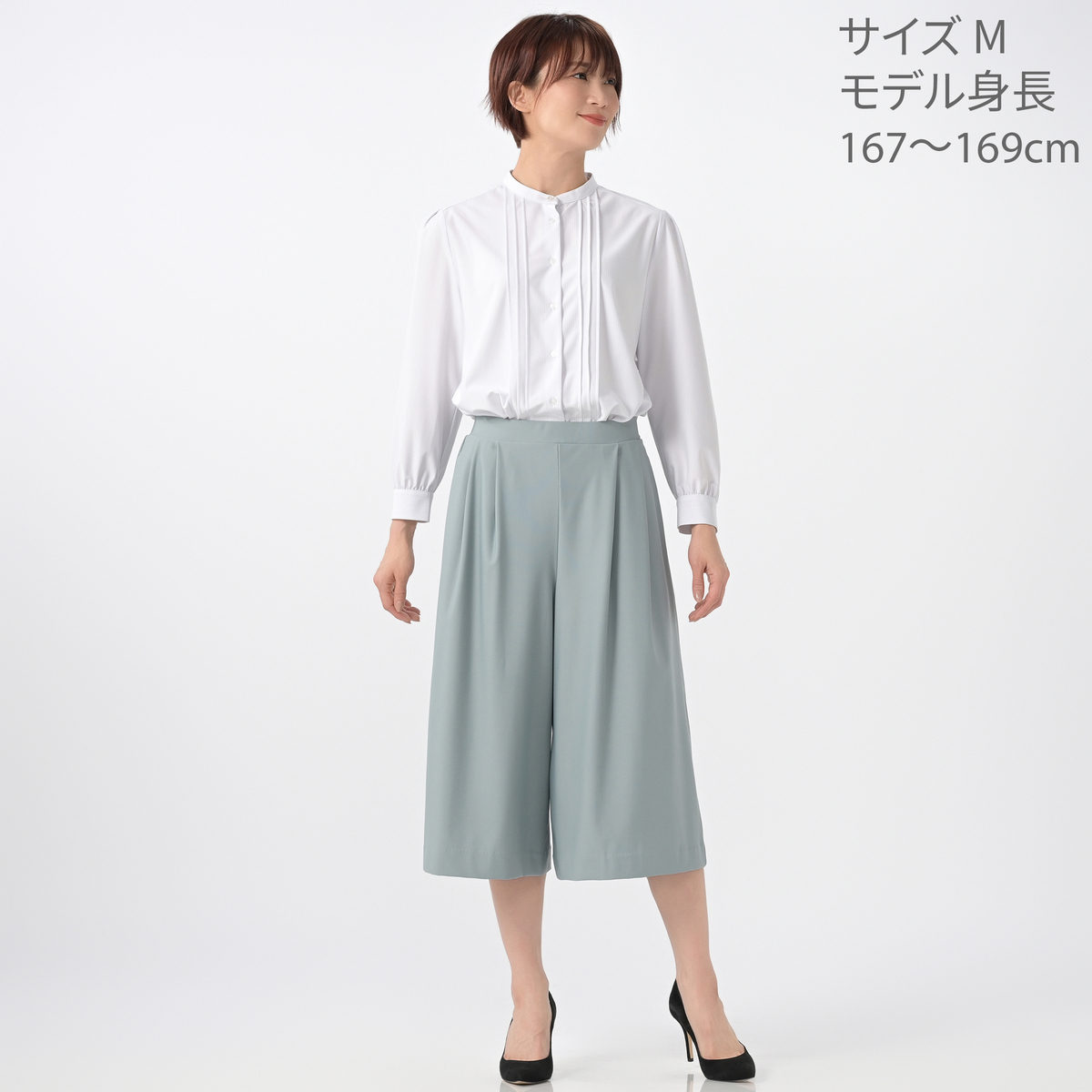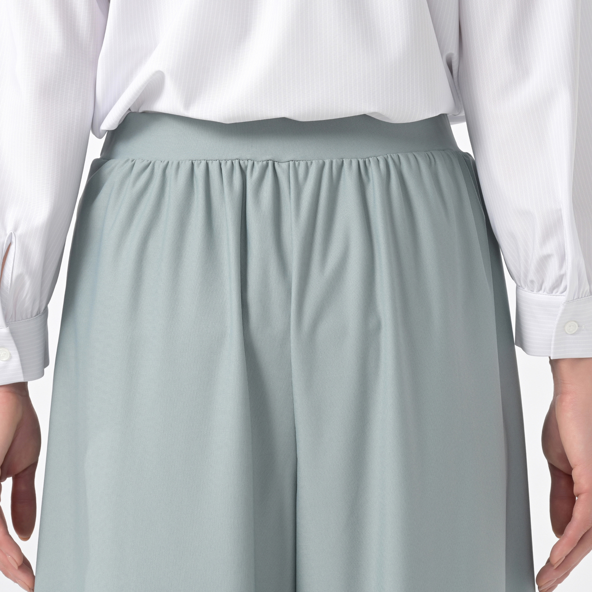 布帛見えのハイテンション素材を使用。エレガントに着こなせるきれいめな素材感ながらも伸縮性があり、ウエストはゴム仕様のプルオンタイプでラクに穿けるアイテムです