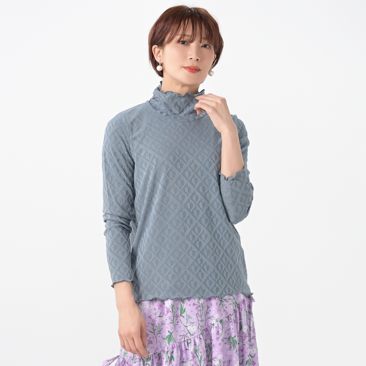 首元がきれいに見える、詰まりすぎないハイネック。衿はシャーリングフリルネックで、やわらかい仕様に。衿と袖口と裾はさり気ないメローフリルで可愛くなり過ぎず、スタイリッシュに着こなせます