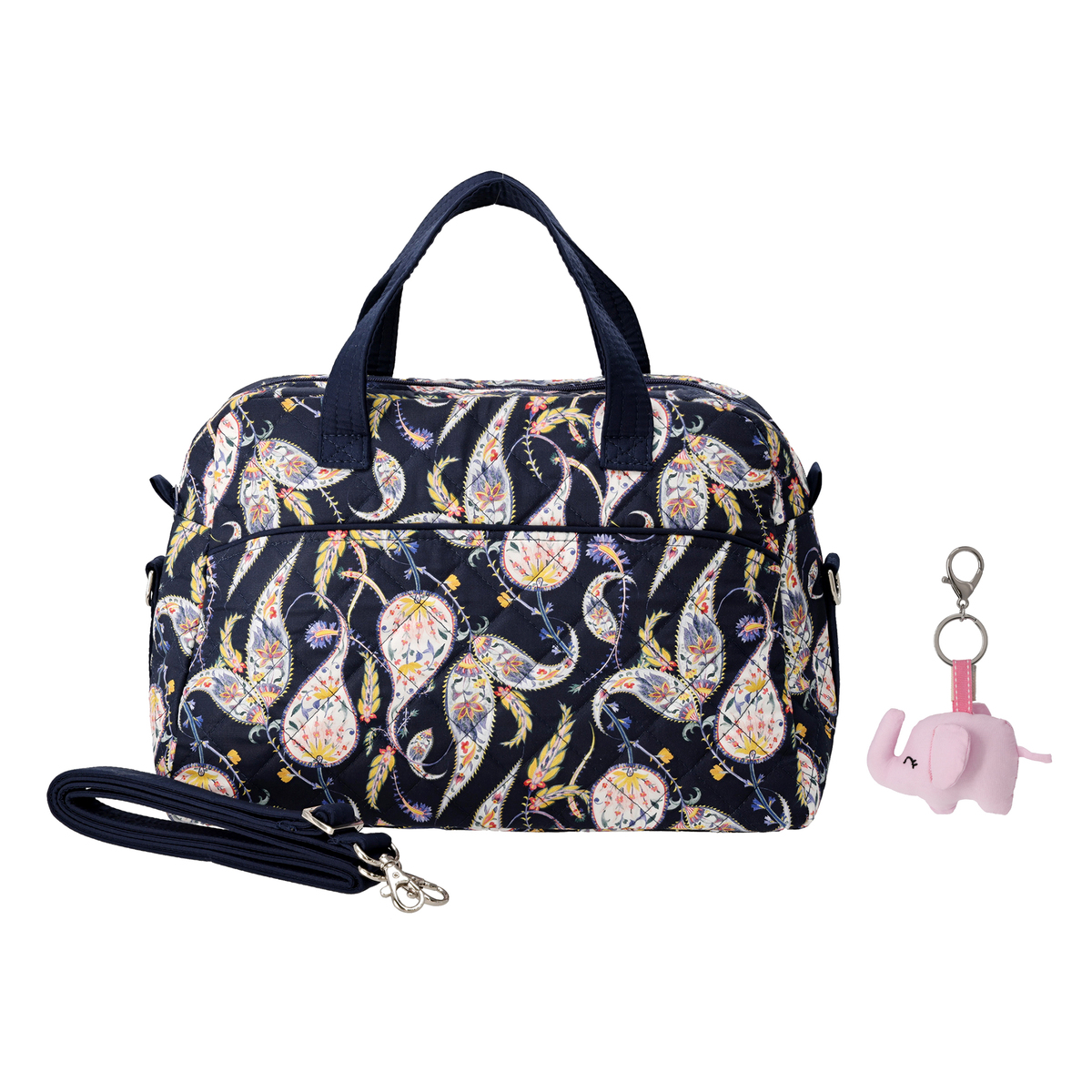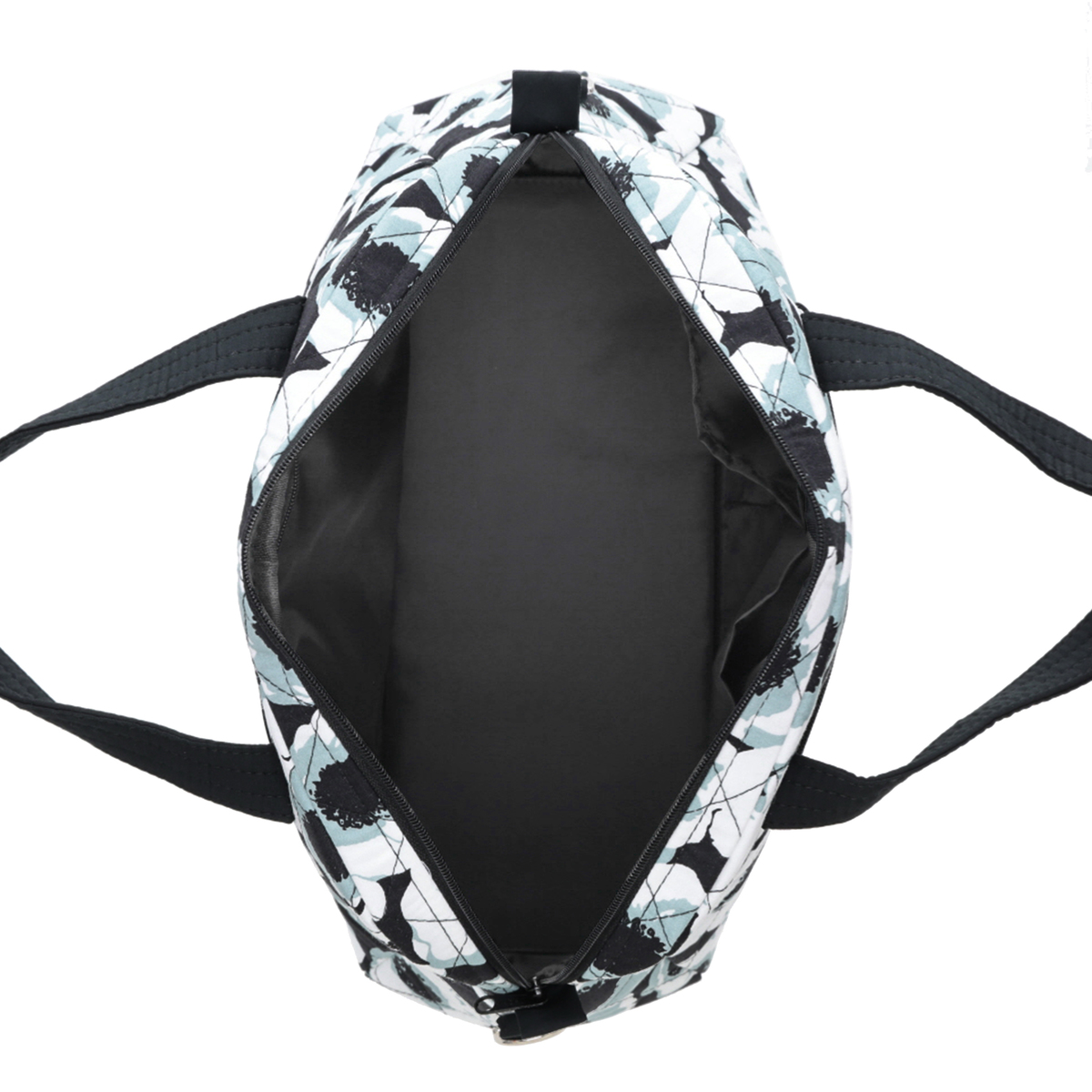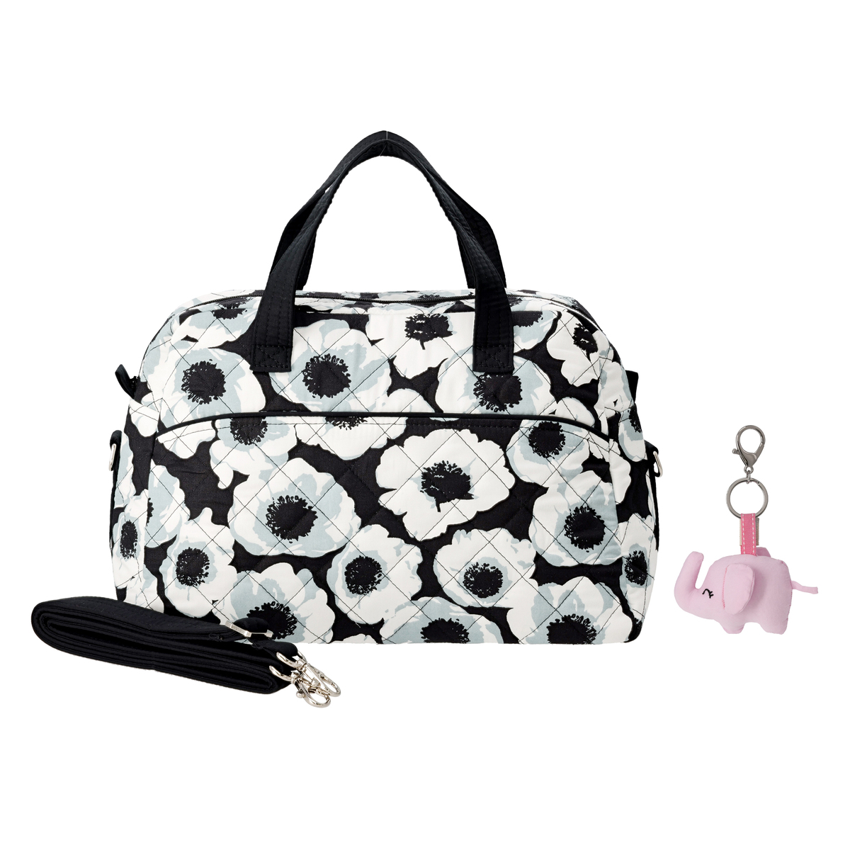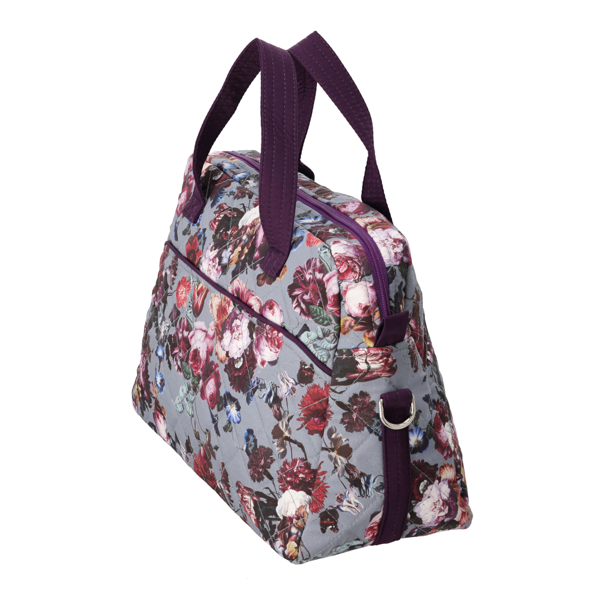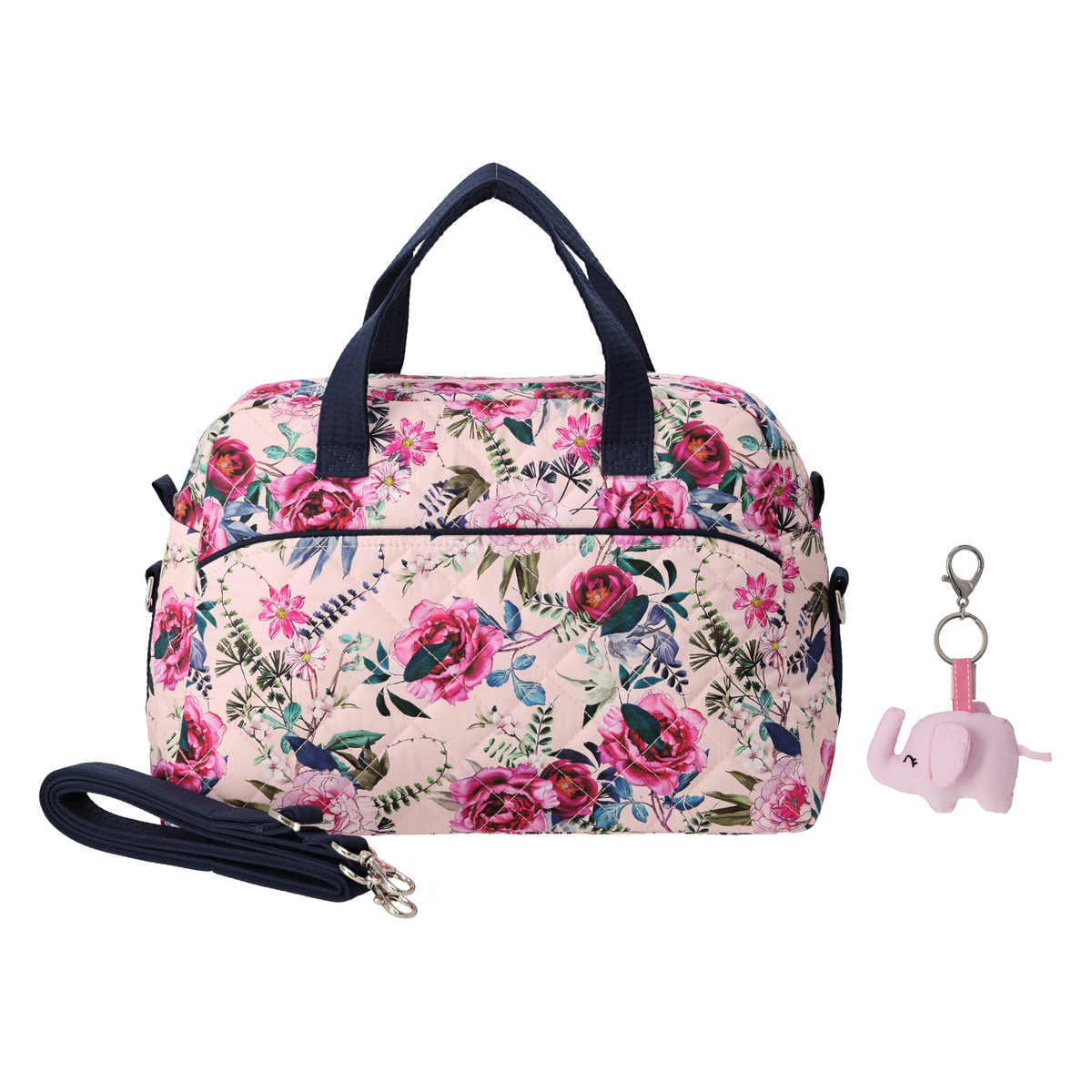 華やかなプリントデザインがコーディネートのアクセントに。ショルダーストラップは肩に食い込みにくい太さで、調節可能な長めのストラップを採用。肩掛けも斜め掛けもできます