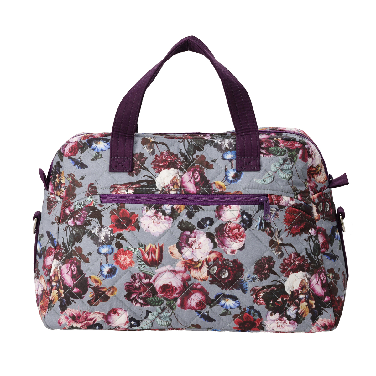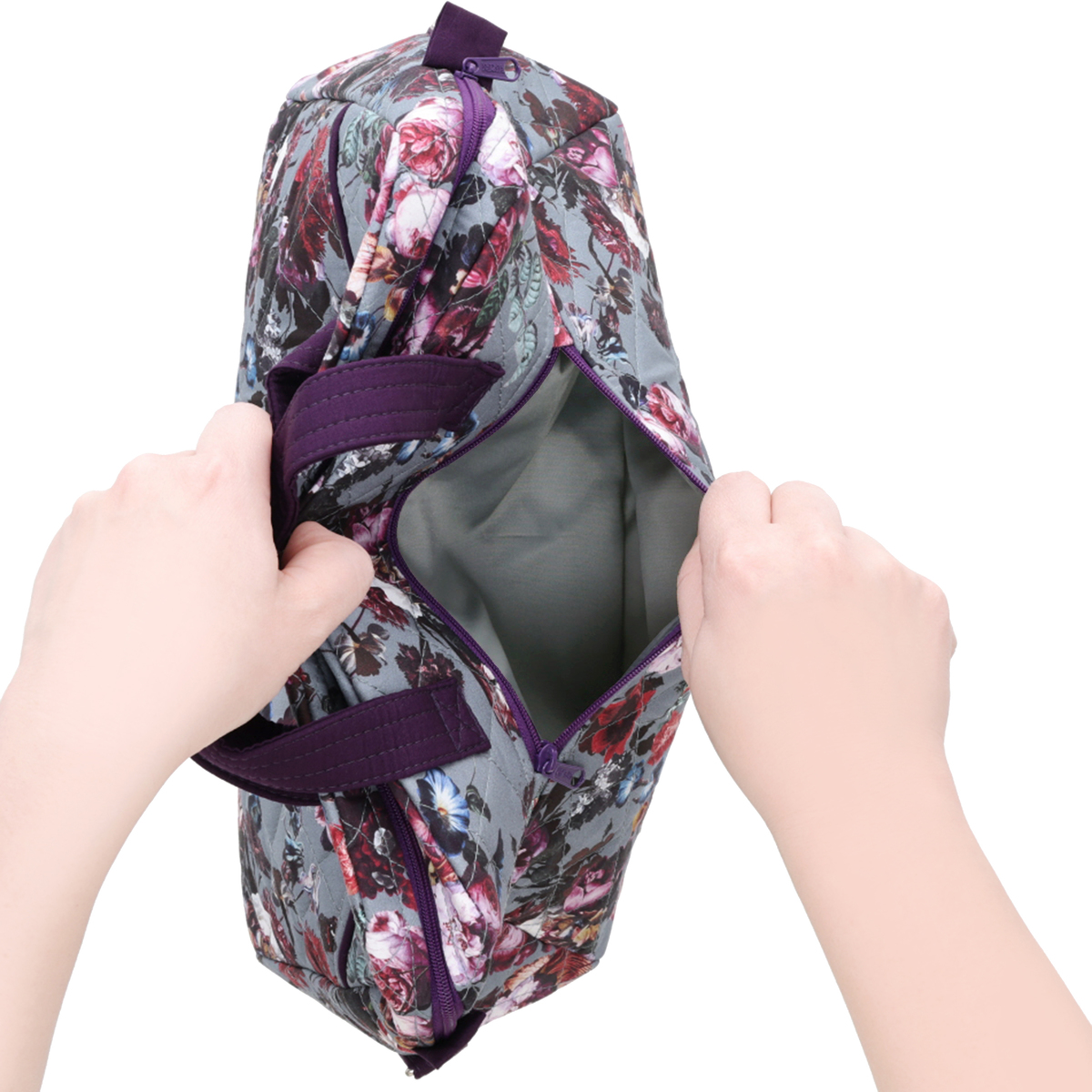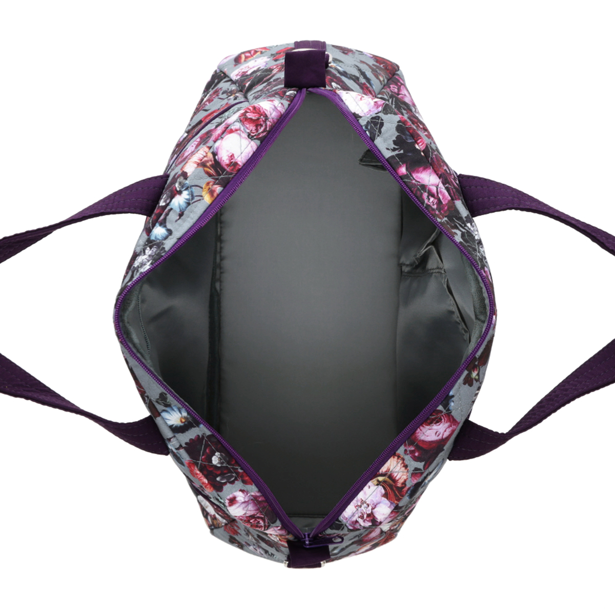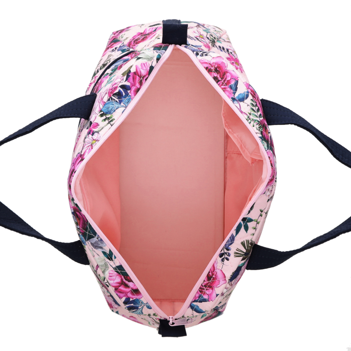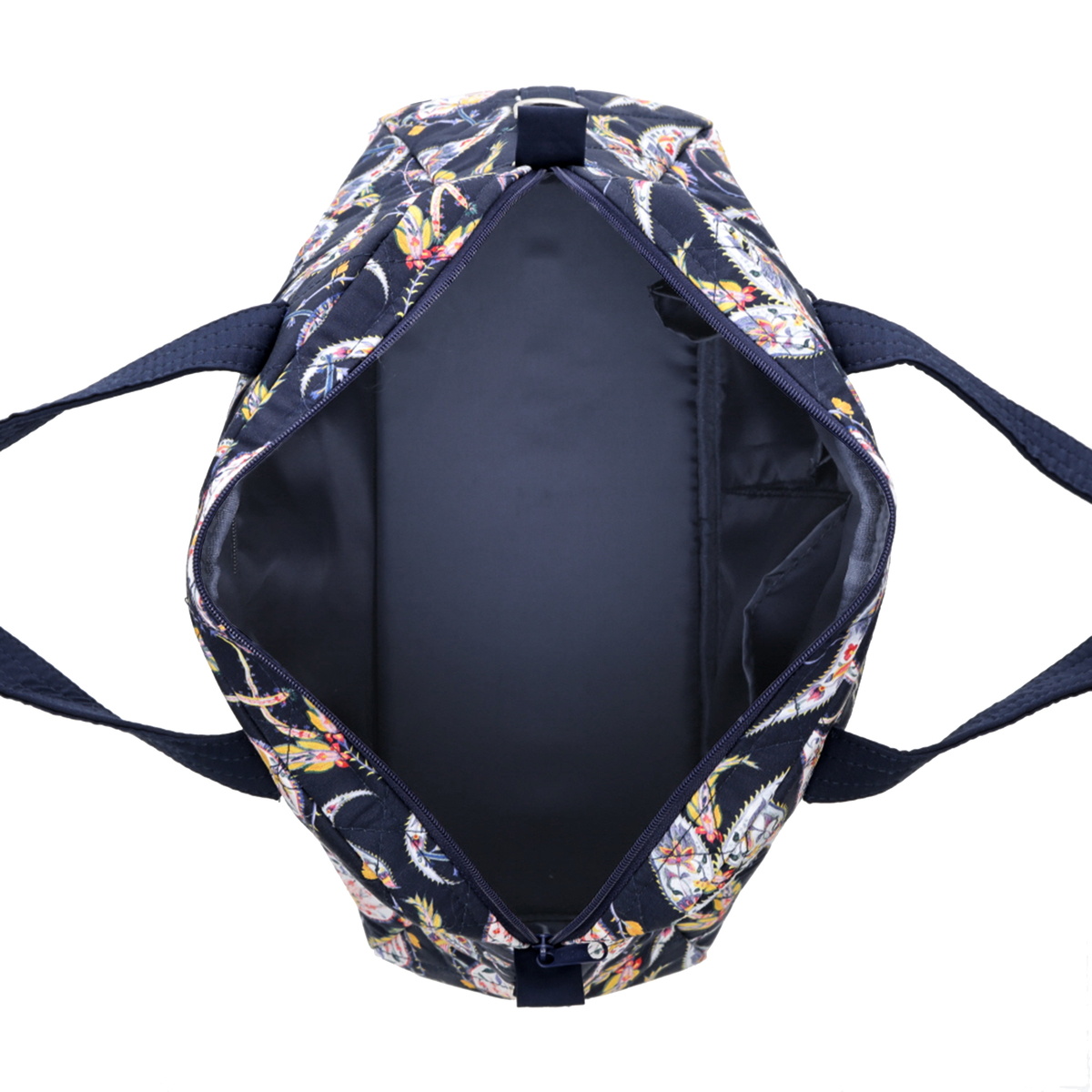 まず、軽いのがとてもいいです。 トートバッグと柄をお揃いにして、2点持ちで1泊旅行を試してみましたが、夏なら収納力十分でした。 軽いから荷物を持つのが苦にならないし、賑やかな柄ですが子供っぽくないと思いました。 改善点としては、外ポケットがもう少し大きければスマホの出し入れが楽なこと。 また、バッグの上方に物が詰まってないとぺコンとへこむのをなんとかできないかということ。 ですが、使いやすいバッグなので、工夫で何とかなるので、最近こればかり使っています。