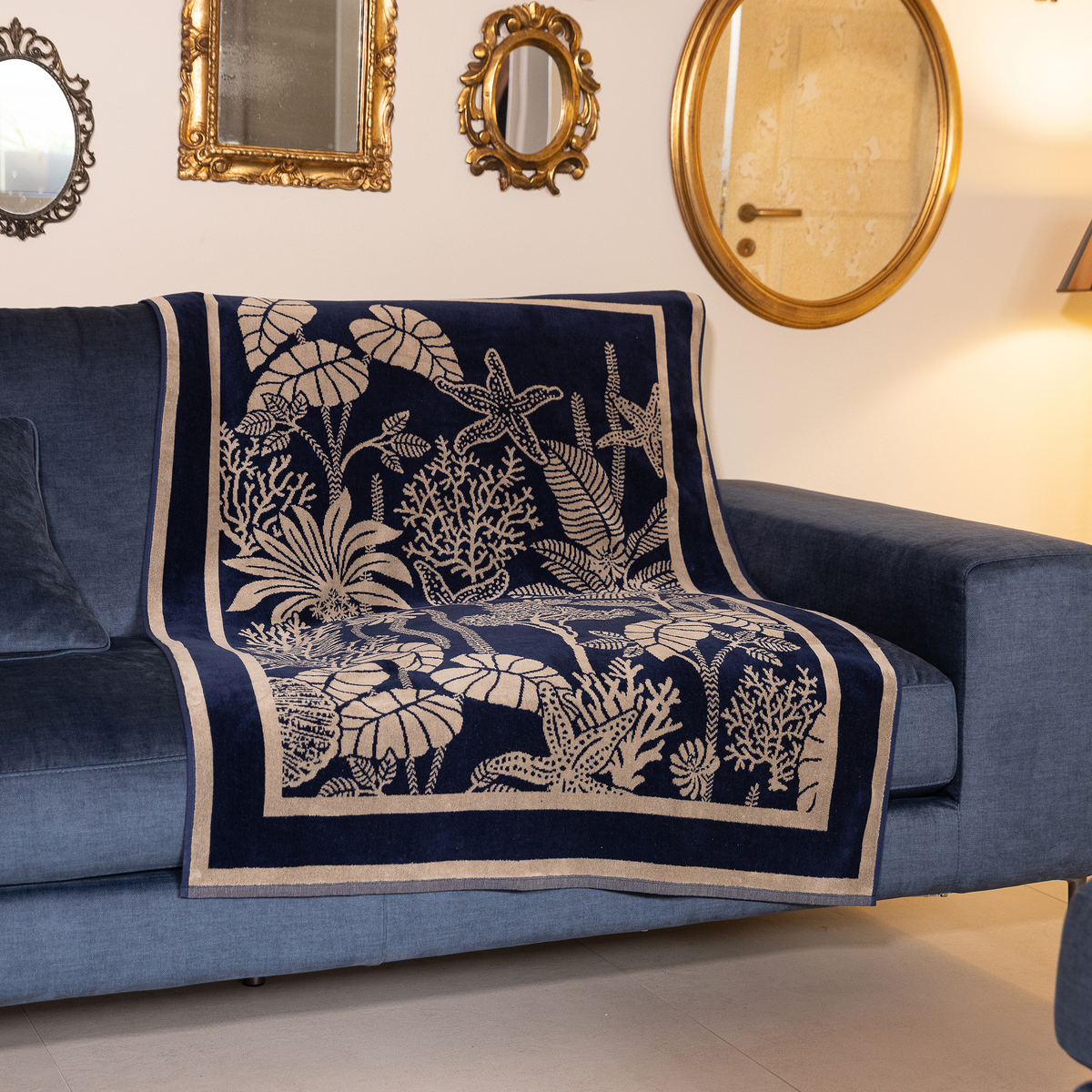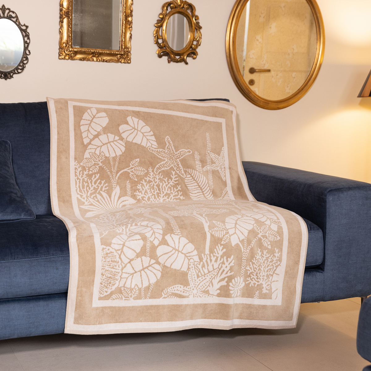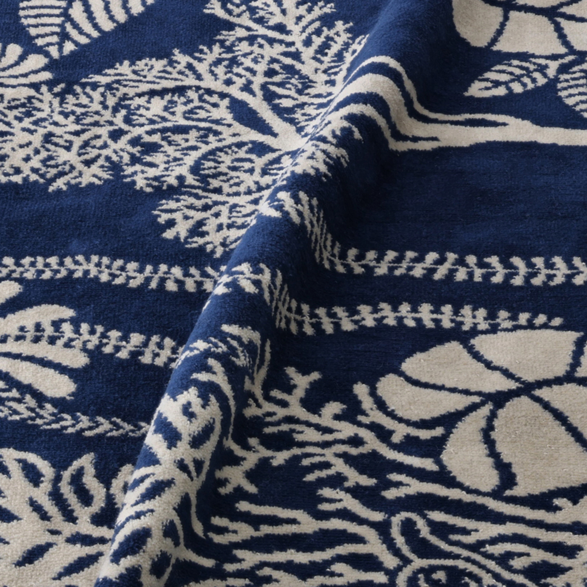 綿100%のハーフケット。表面のベルベット調のなめらかな肌触りと重厚感が高級感を演出。ジャカードで表現した繊細な柄が、お部屋に上質な雰囲気をもたらします