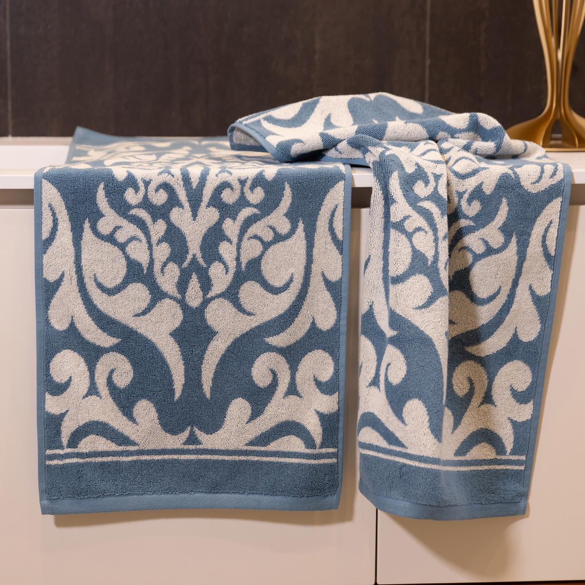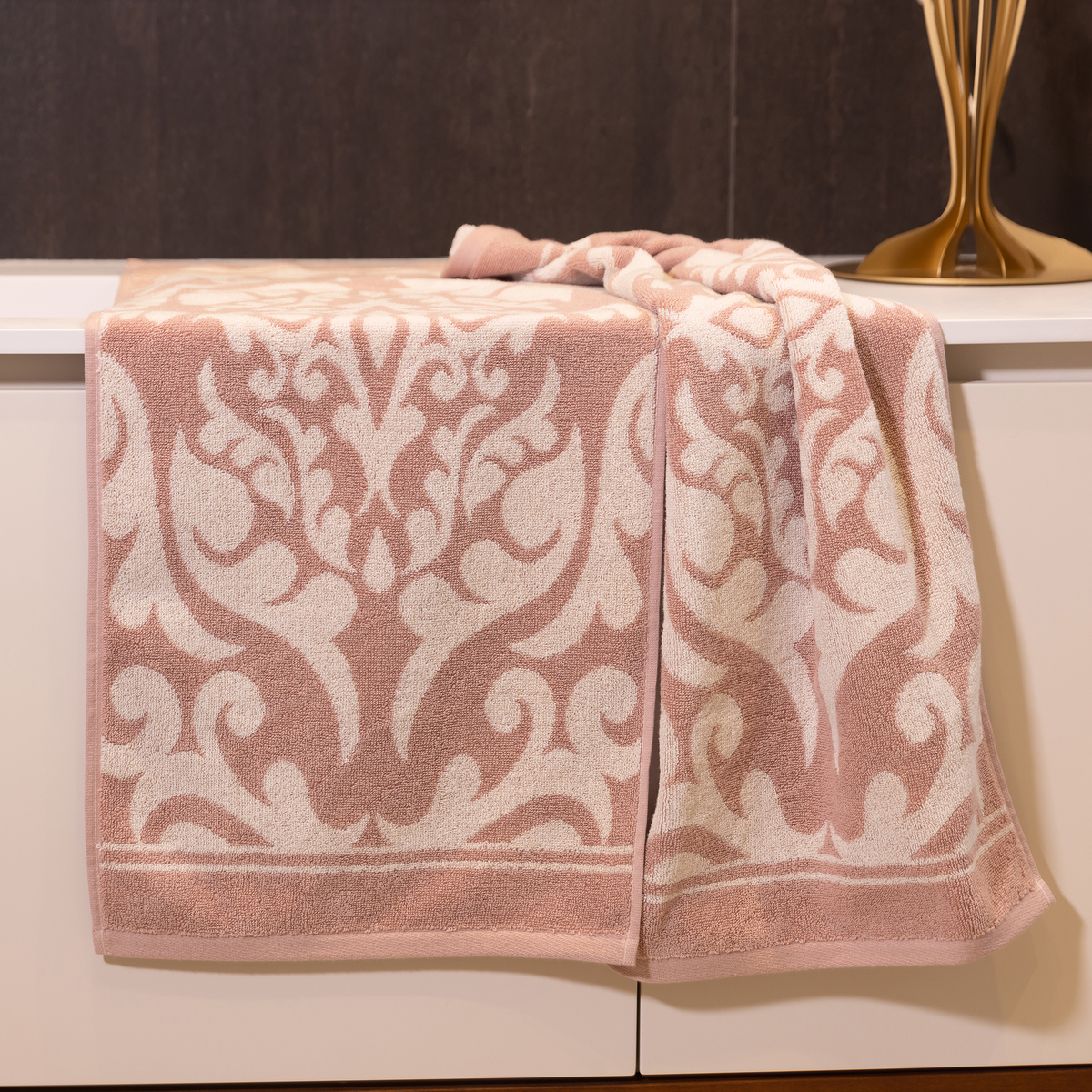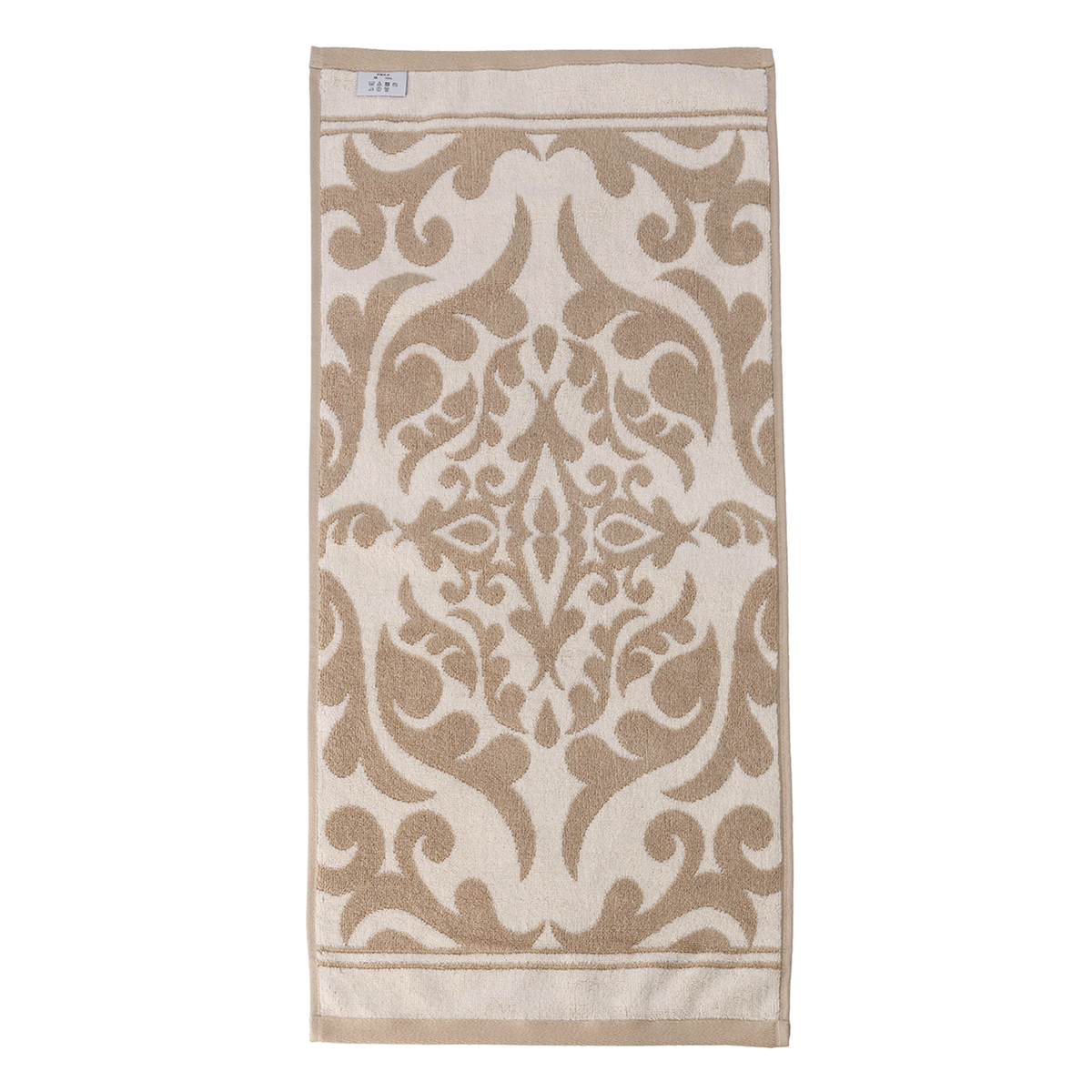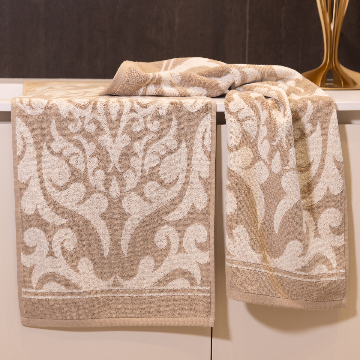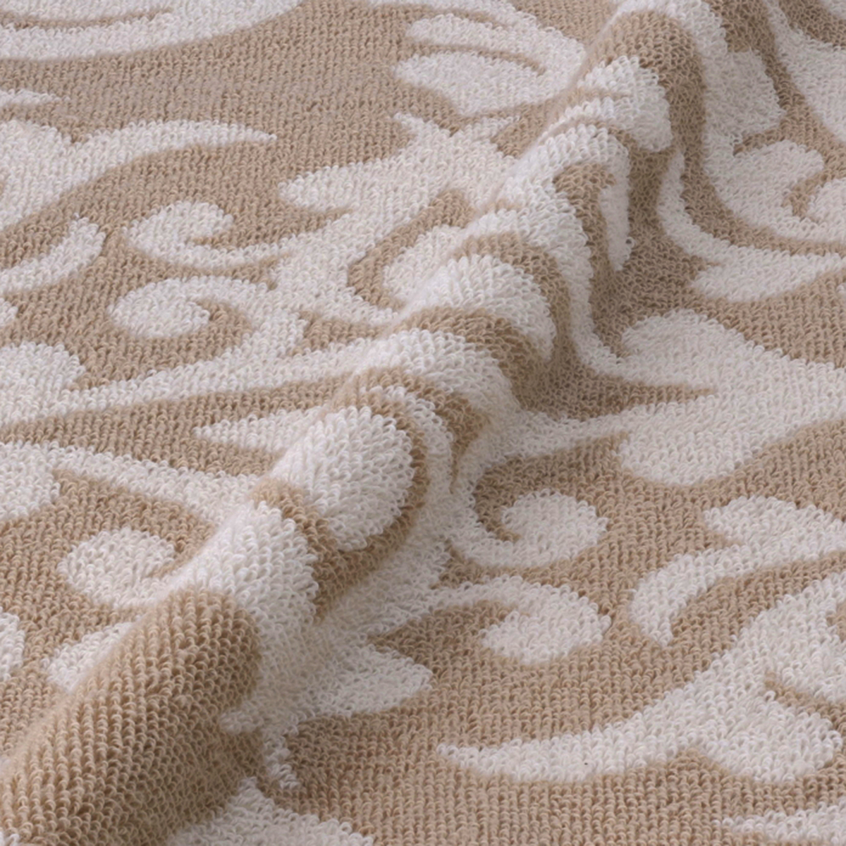 ジャカードで表現した繊細な柄と、しっかりとした重量感で、高級感が感じられる綿100%のタオル。ボリューム感、ふわふわ感を考えて、強すぎず甘すぎないように程よい撚り加減に調整。ポルトガル製で550GSMのしっかりとした厚みがあり、心地よく快適にお使いいただけます