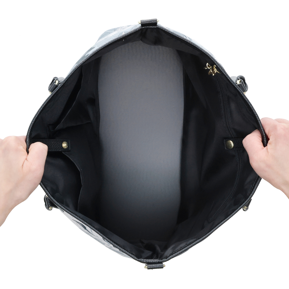 A4が横に、500mlのペットボトルが縦に収まるサイズ感で、通勤や習い事などデイリーで活躍。底マチは約13cmと大きく、取り外し可能な底板付きで、お弁当など幅のあるものや、重たいものも収納できます