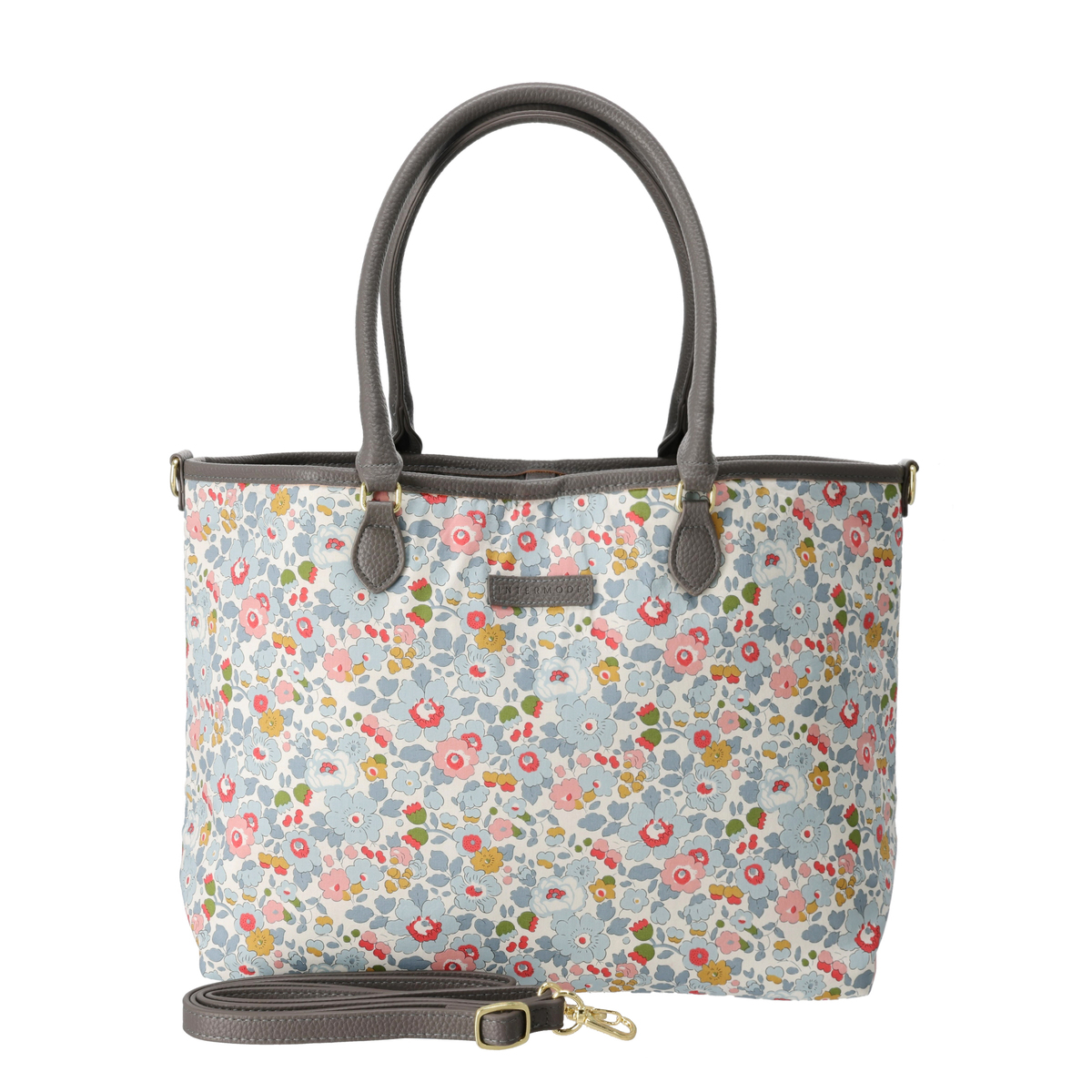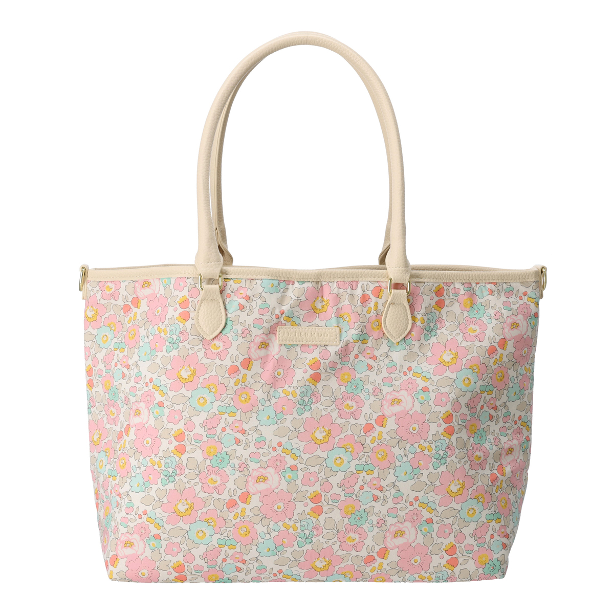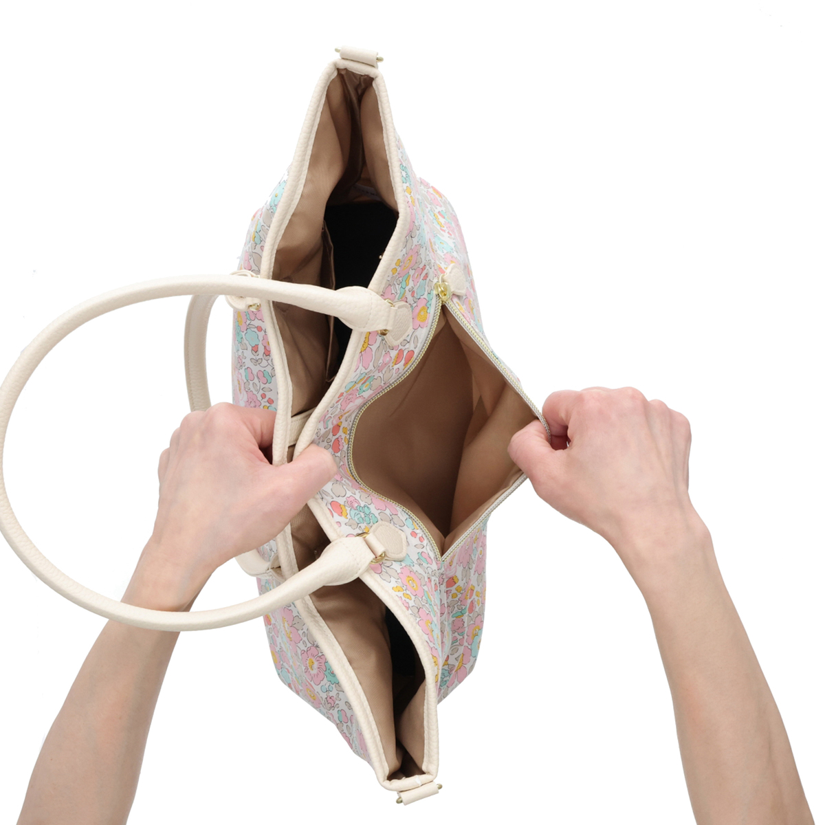 英国リバティ社がデザインするオリジナルファブリック、リバティプリントをあしらったオープントートバッグ。開口部の縁取りとハンドルには合皮を使い、スタイリッシュに仕上げました