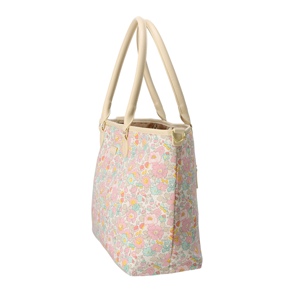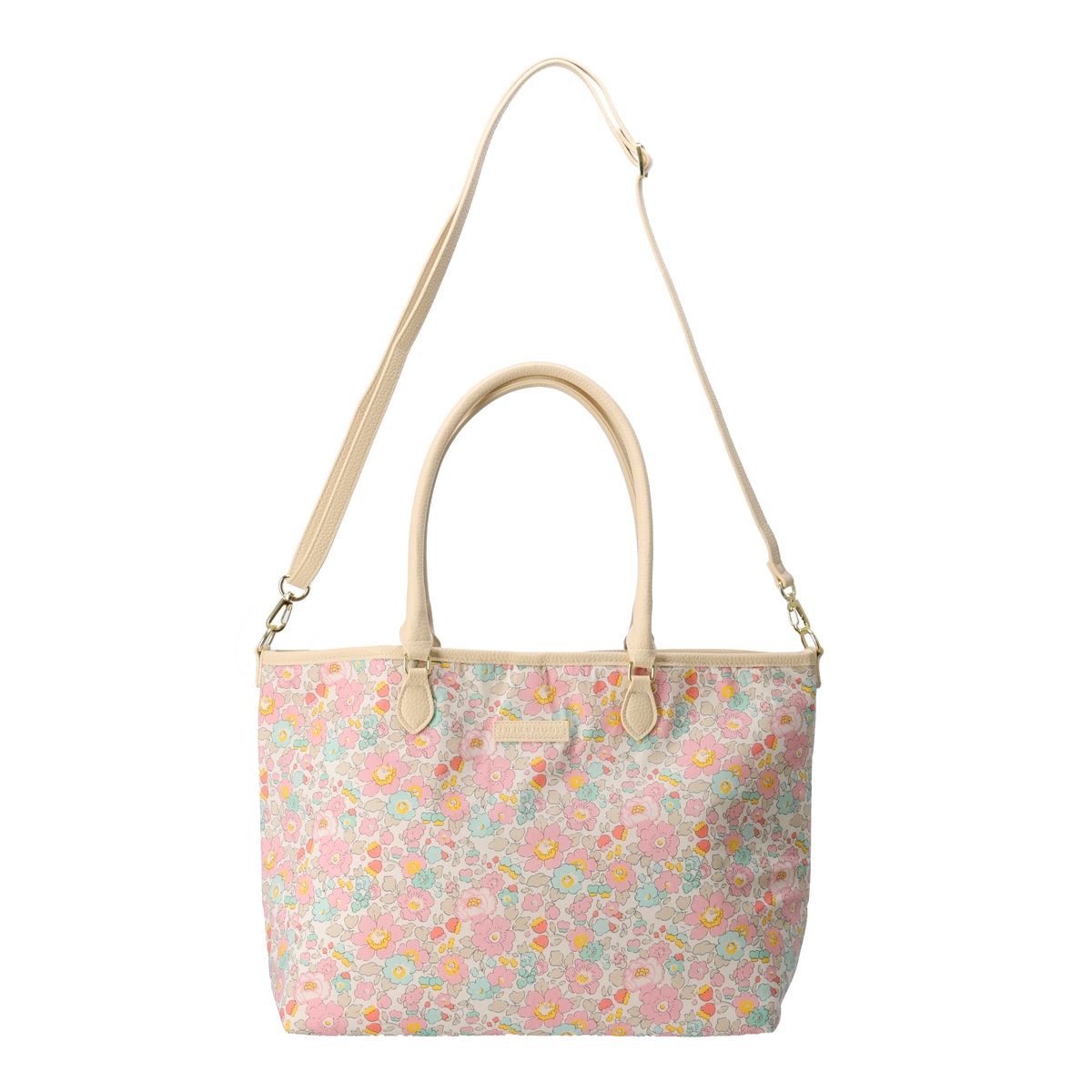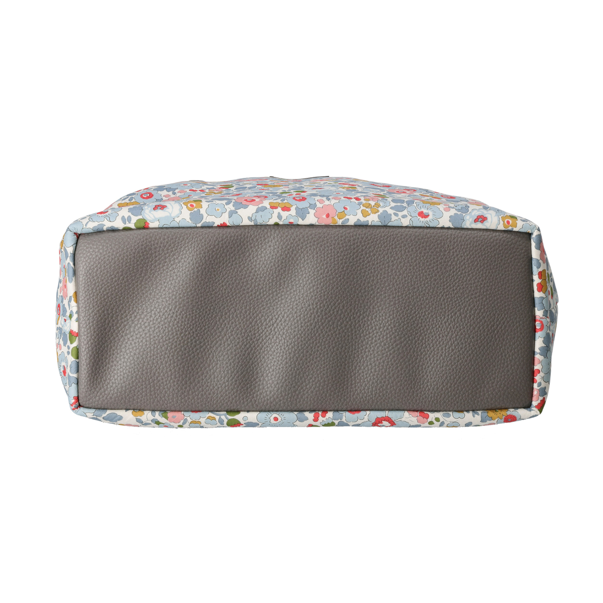 英国リバティ社がデザインするオリジナルファブリック、リバティプリントをあしらったオープントートバッグ。開口部の縁取りとハンドルには合皮を使い、スタイリッシュに仕上げました