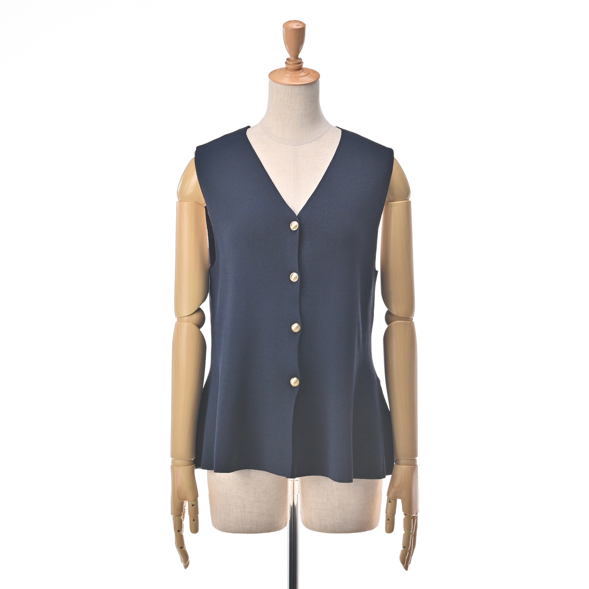 大人かわいい絶妙なペプラム感がポイントになったジレ。ニット素材で着やすく、すっきりとしたシルエットに仕上げています