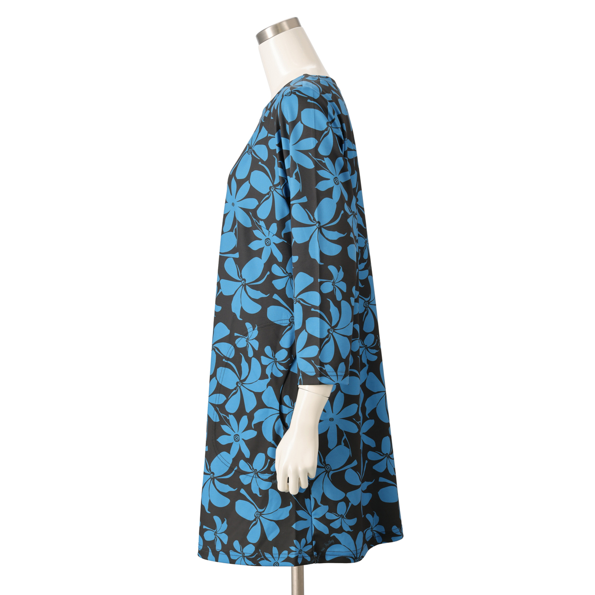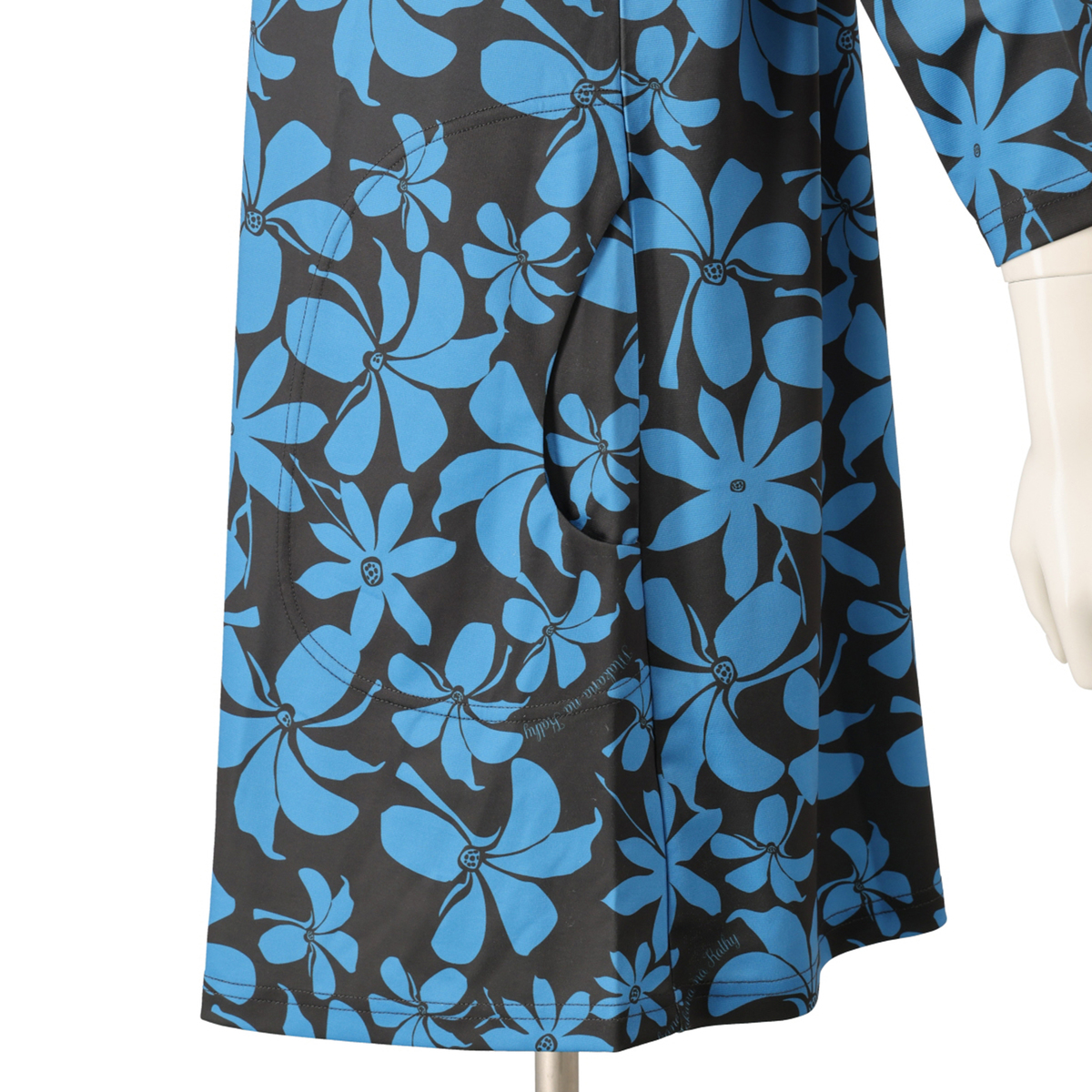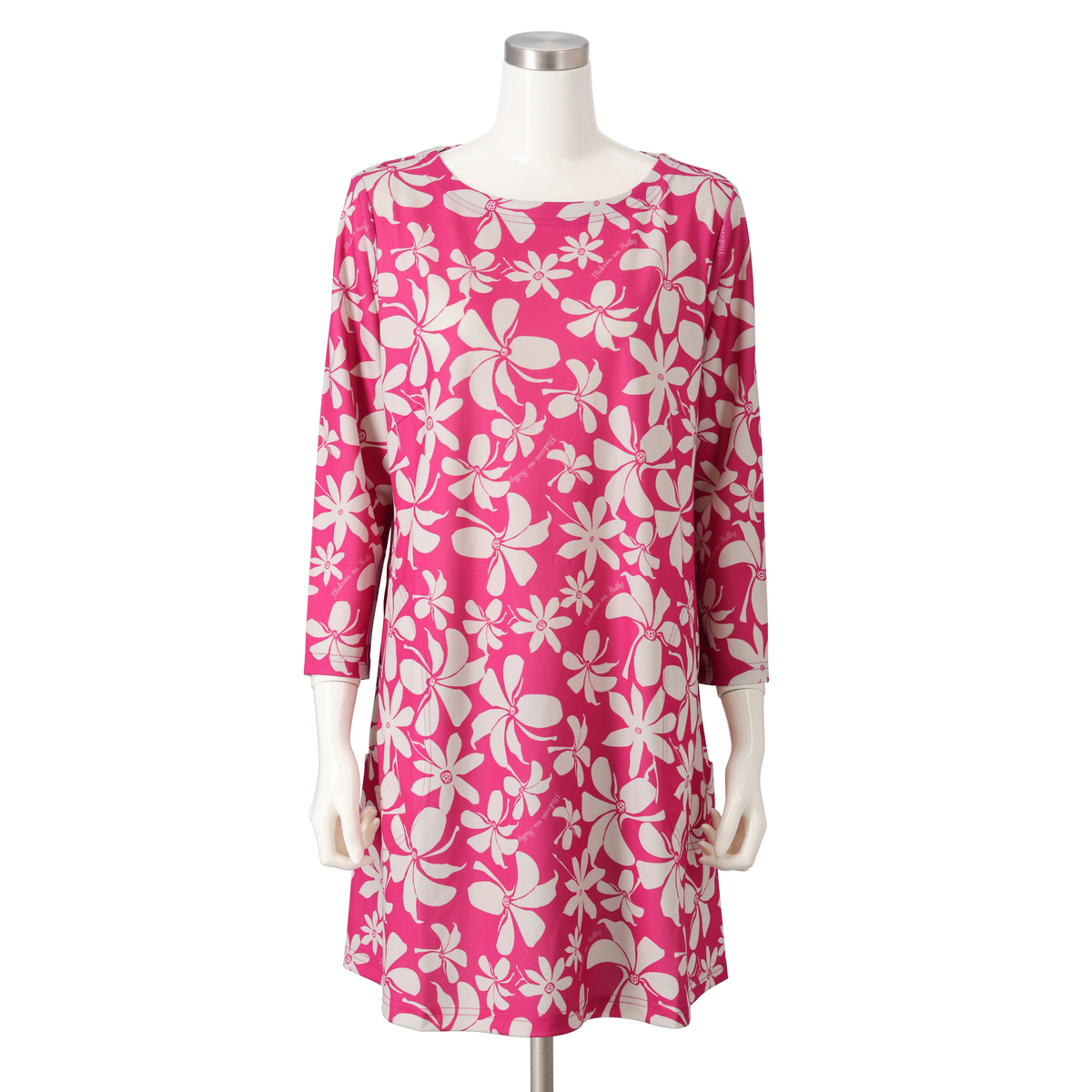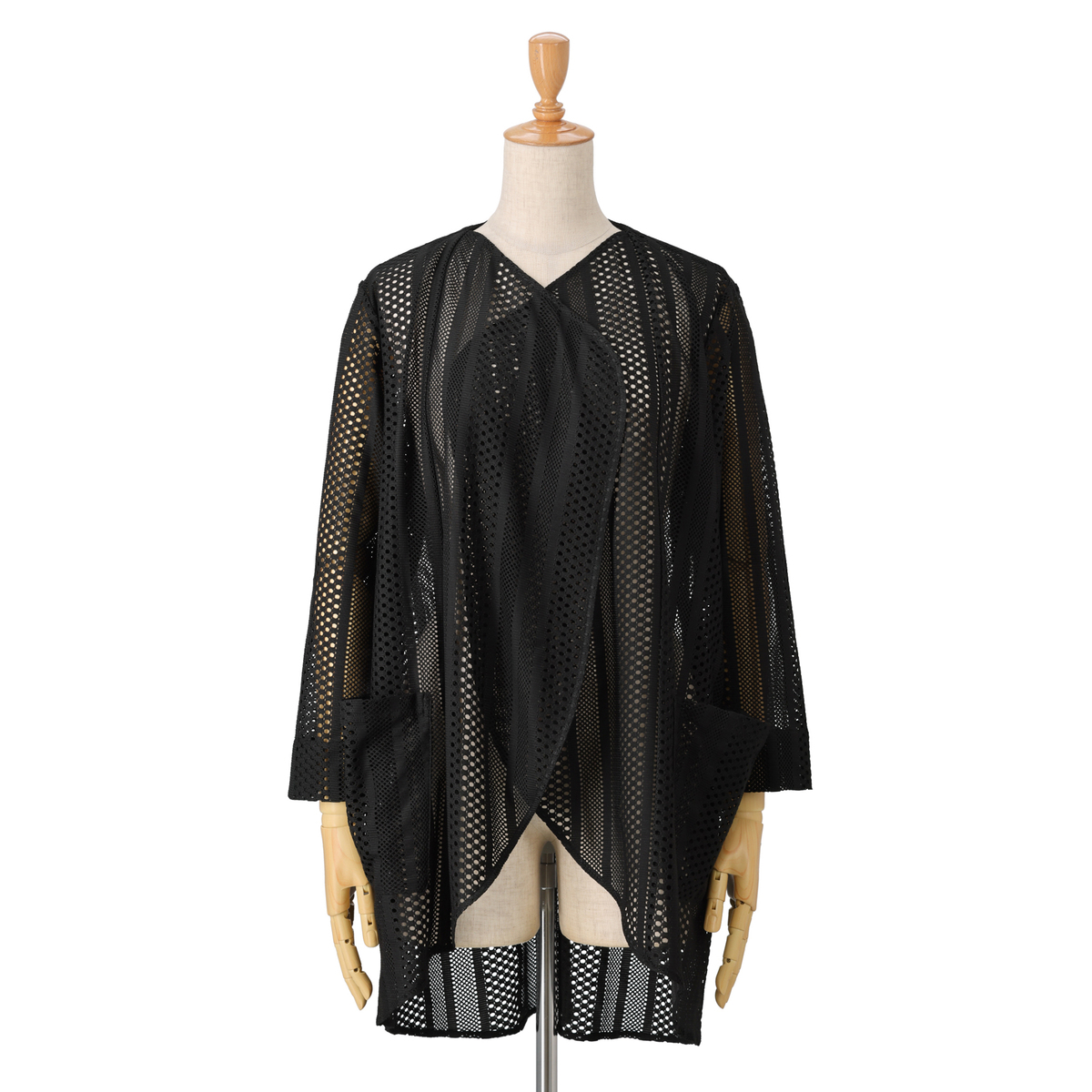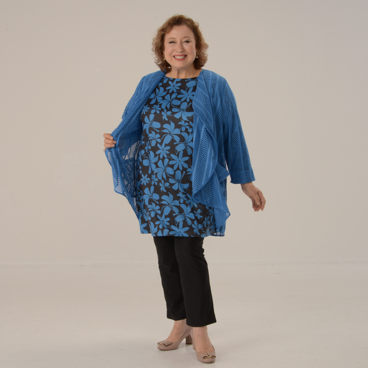 カーディガンは縦ストライプのランダムメッシュ素材で軽くておしゃれ。プリントチュニックはティアレのモチーフをワントーンでクールな印象のカラーにしています。パンツは、チュニックのプリントに合う色合わせにしています