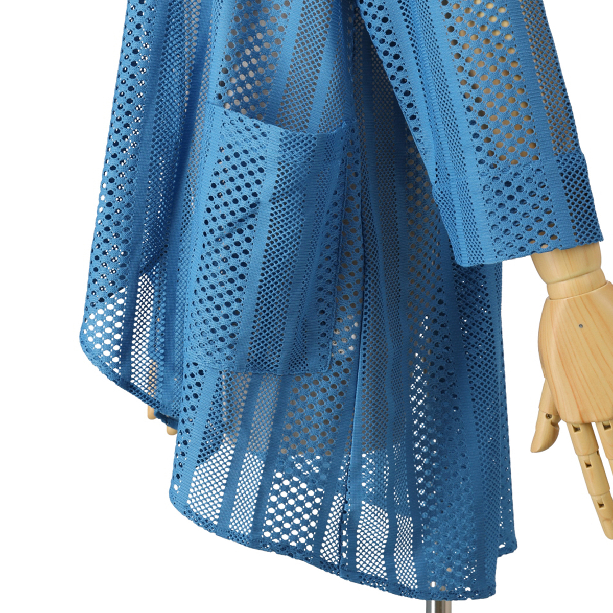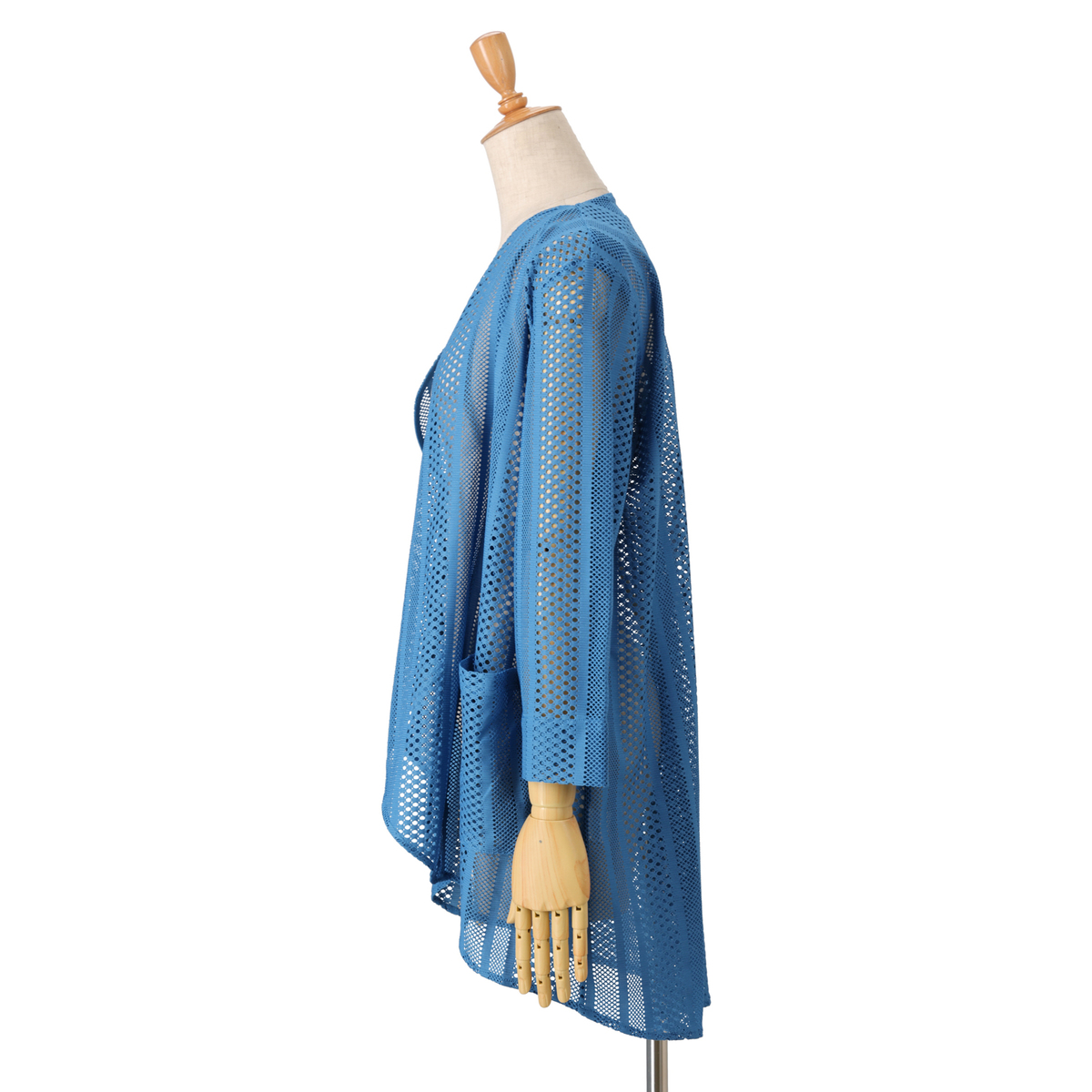 チュニックとレギンスパンツは、UVカット、接触冷感性があり、日本の暑い夏を少しでも涼しく快適に過ごしていただけるよう選んだ素材。カーディガンは吸水速乾素材。通気性を考え、メッシュの編立素材を使用しています