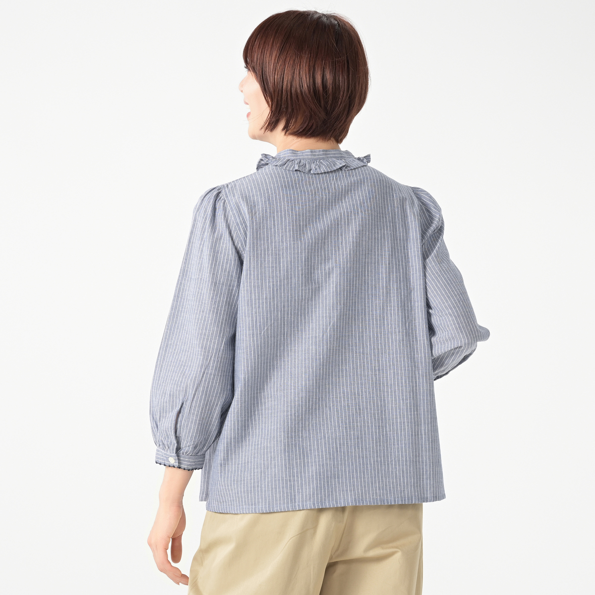 首元のフリルがエレガントで、手首が見える袖丈は華奢な印象をプラス。袖口の白い刺繍糸のピコレース風ステッチも、控えめな可愛らしさを添えています