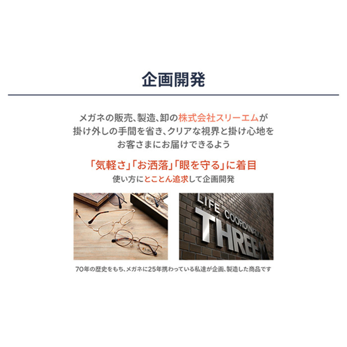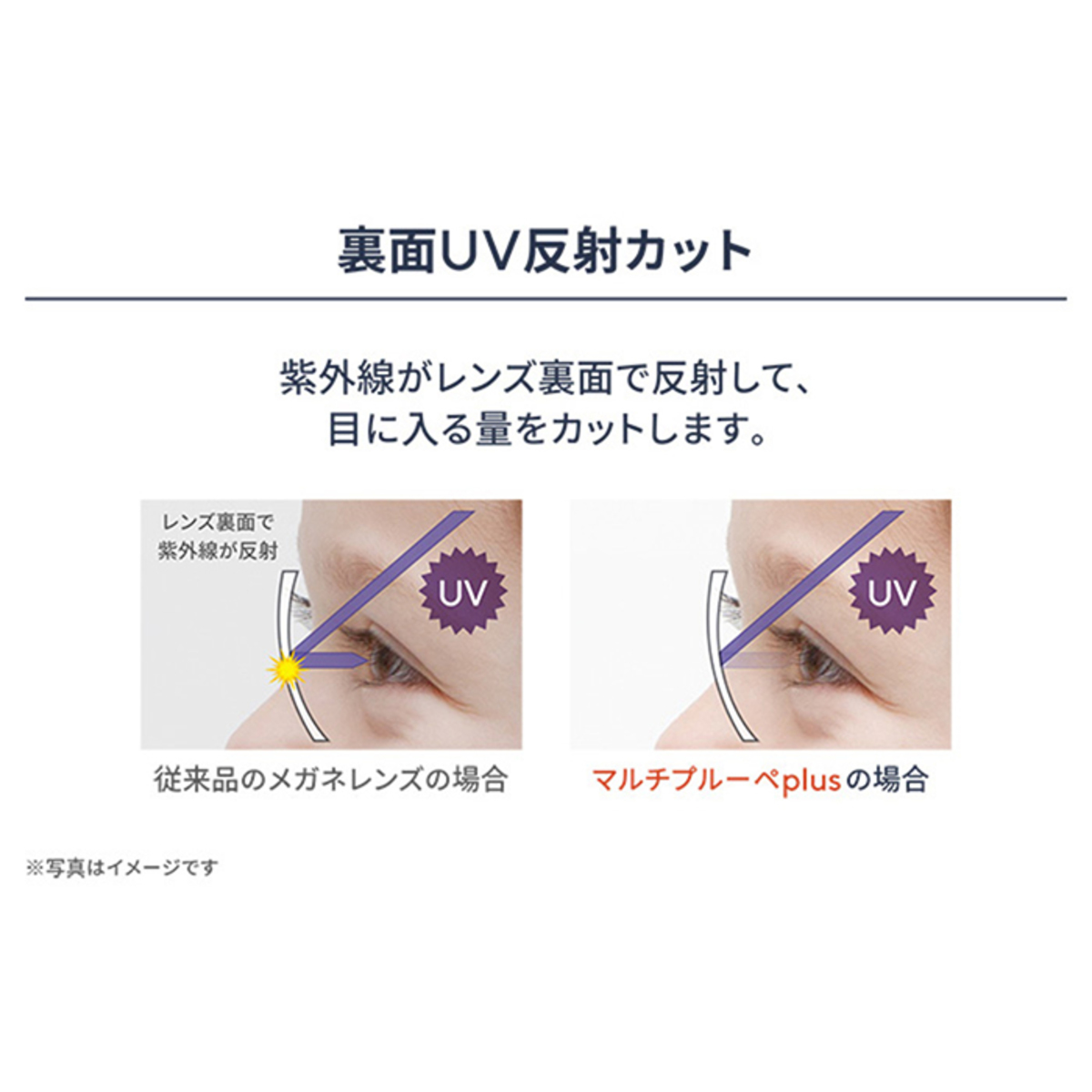 「UVカット」「裏面UV反射防止」「ブルーライトカット」「遠赤外線カット」の機能を備えた、多機能レンズを採用しています。お出かけ時の目の保護にも役立ちます。