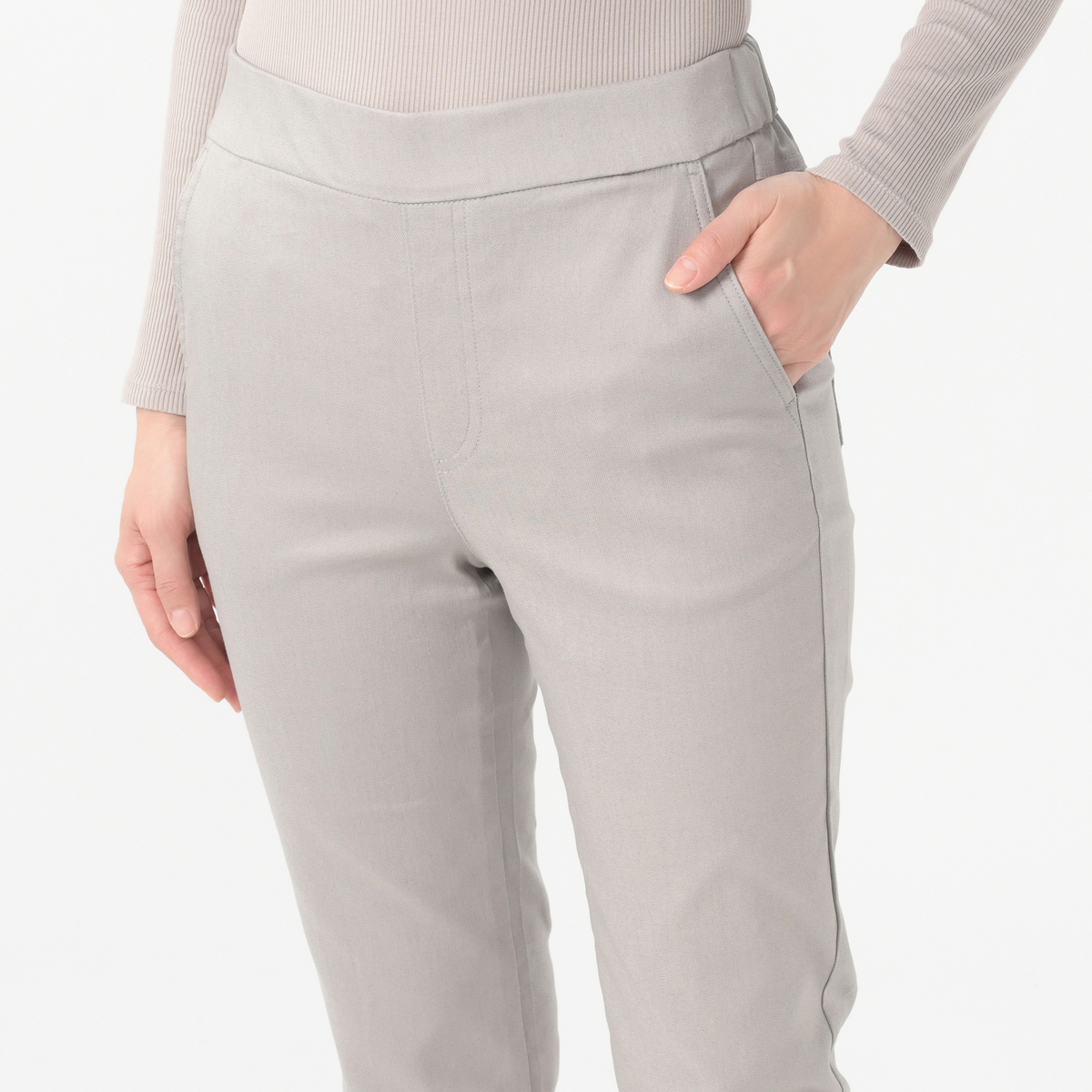 綿混のソフトな風合いとストレッチ性があり、微光沢とほどよいハリ感が特徴です。ウエスト部分は総ゴム仕様で、レギンスのようにそのまますぽっと穿けます。吸水速乾性とUVカット機能があり、ピリングができにくい素材です