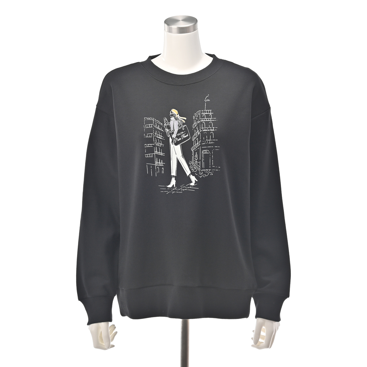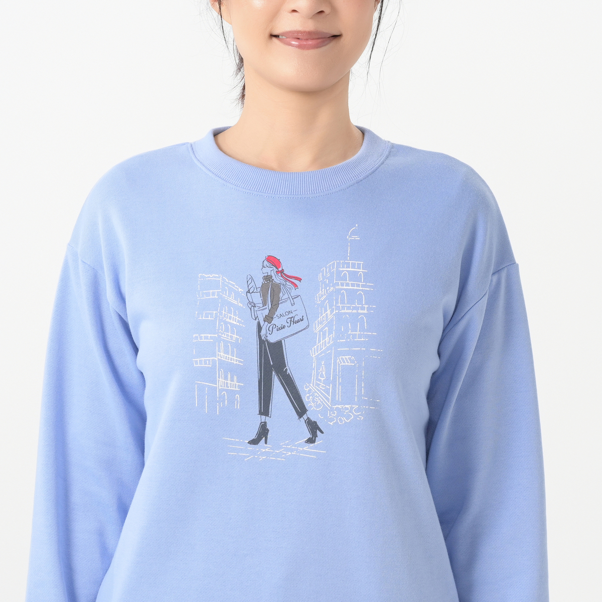 やや肩おちしたドロップショルダーでクルーネック仕様、身体の線を拾いにくいレギュラーフィット感のボックスシルエットです。フロントにはパリの街並みとバケットを持った女性が描かれ、コーディネートに華やかさを添えます