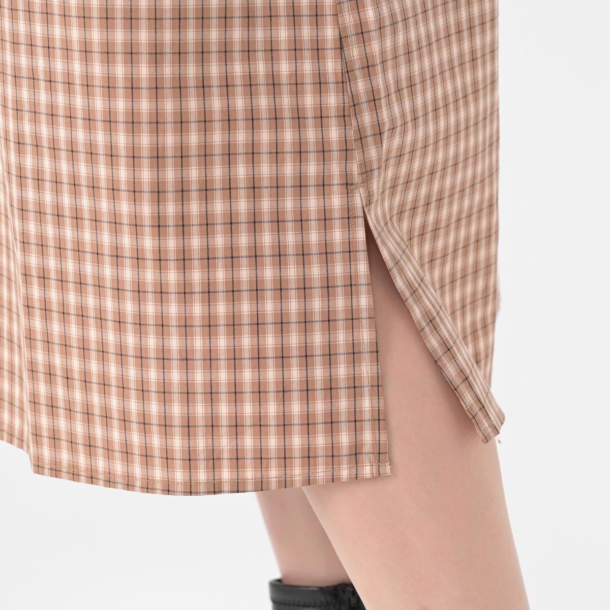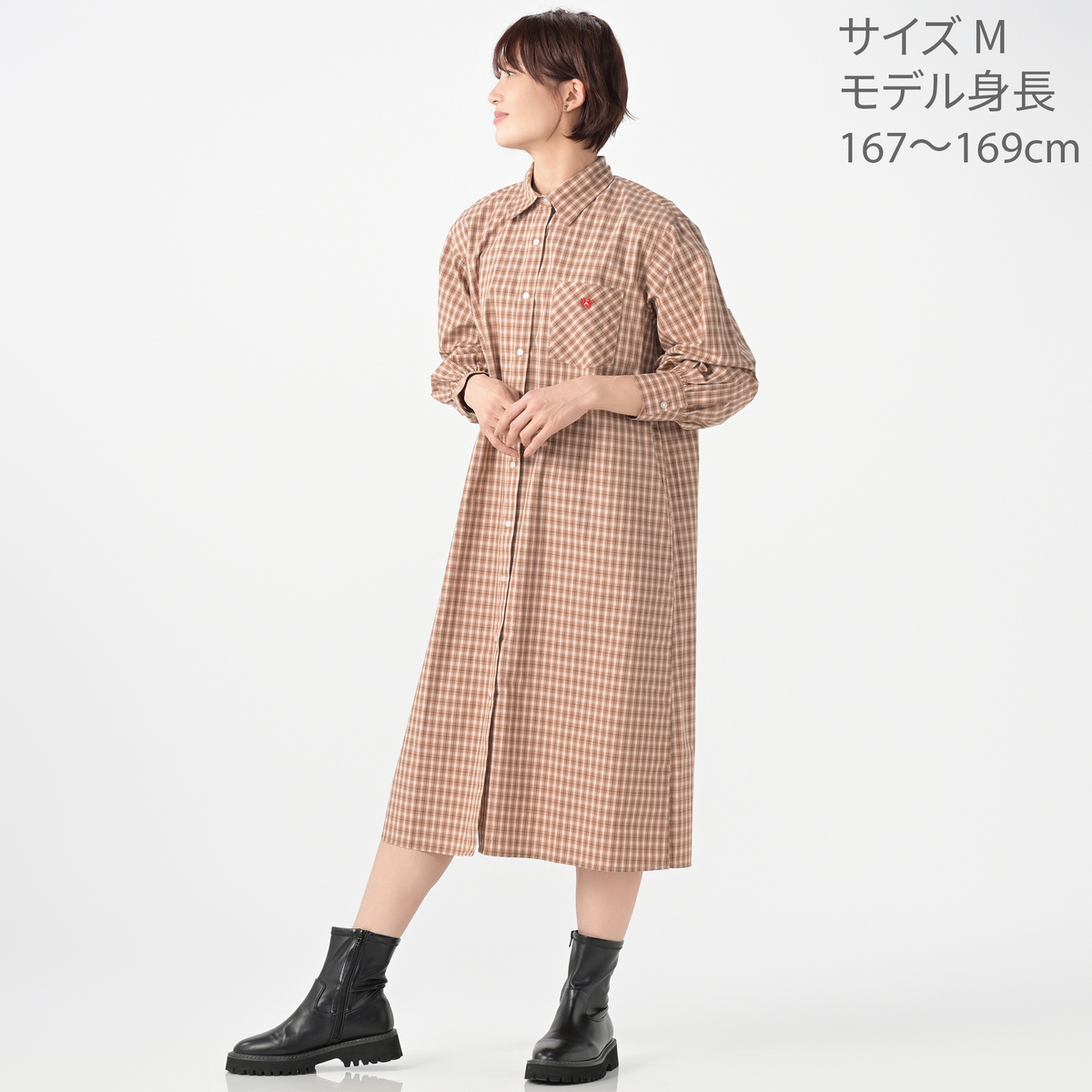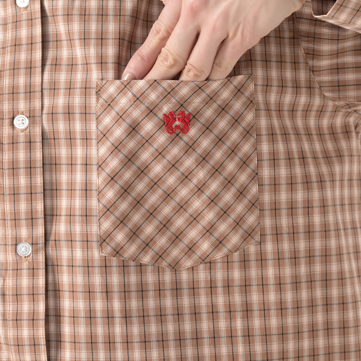 カジュアル感がありながらもフェミニンに着こなせるチェックのシャツワンピース。フロントはボタン仕様で、羽織りとしてもコーディネートできます。胸ポケットにはドラゴンの刺繍を施し、さりげないアクセントに