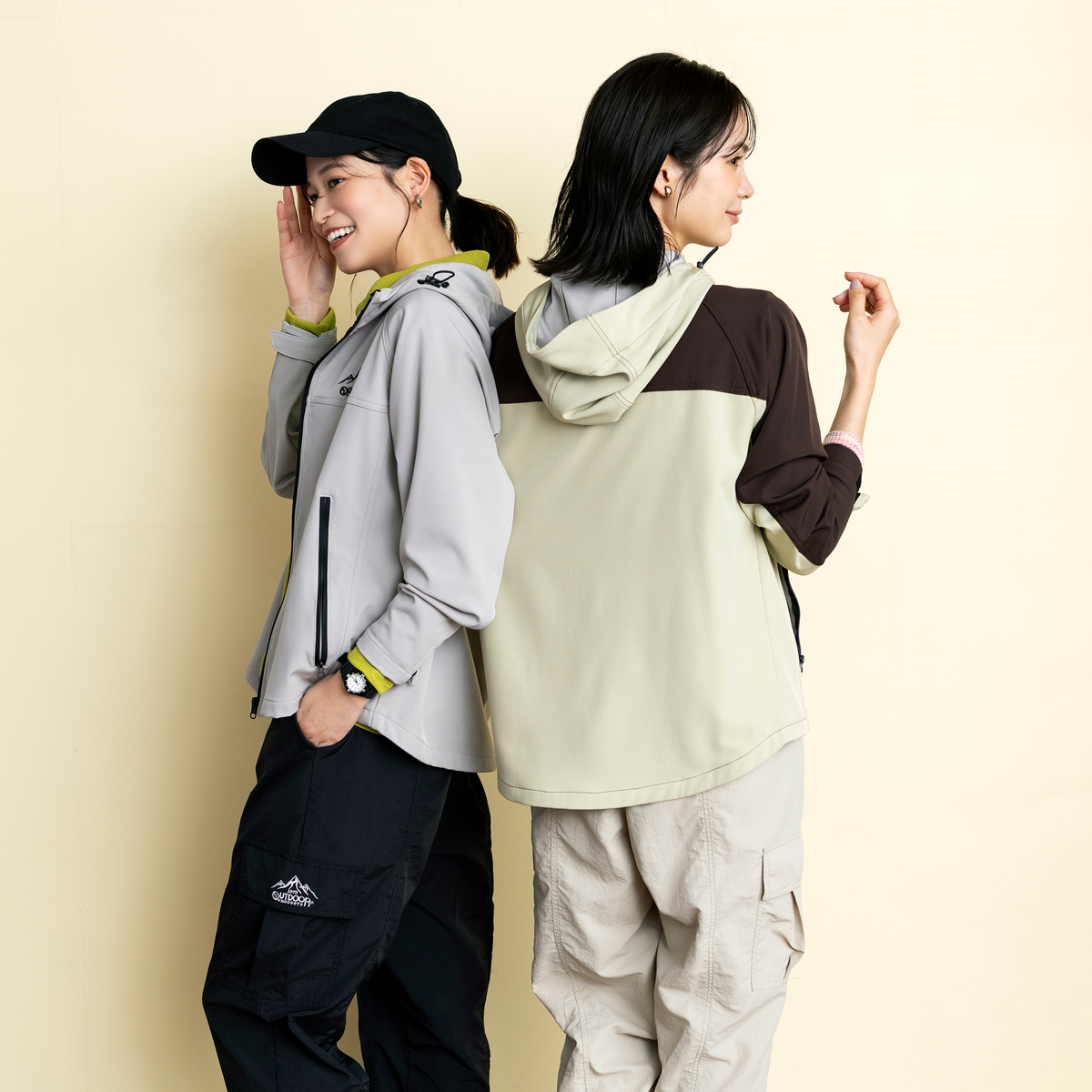 10パーツ以上もの切替で立体的なつくり。身体に沿う、きれいなシルエットです。衿元はスタンドカラー、袖口は面ファスナー仕様で風が侵入しにくく、フード付きなので頭から顔周りを小雨や花粉から守ってくれます