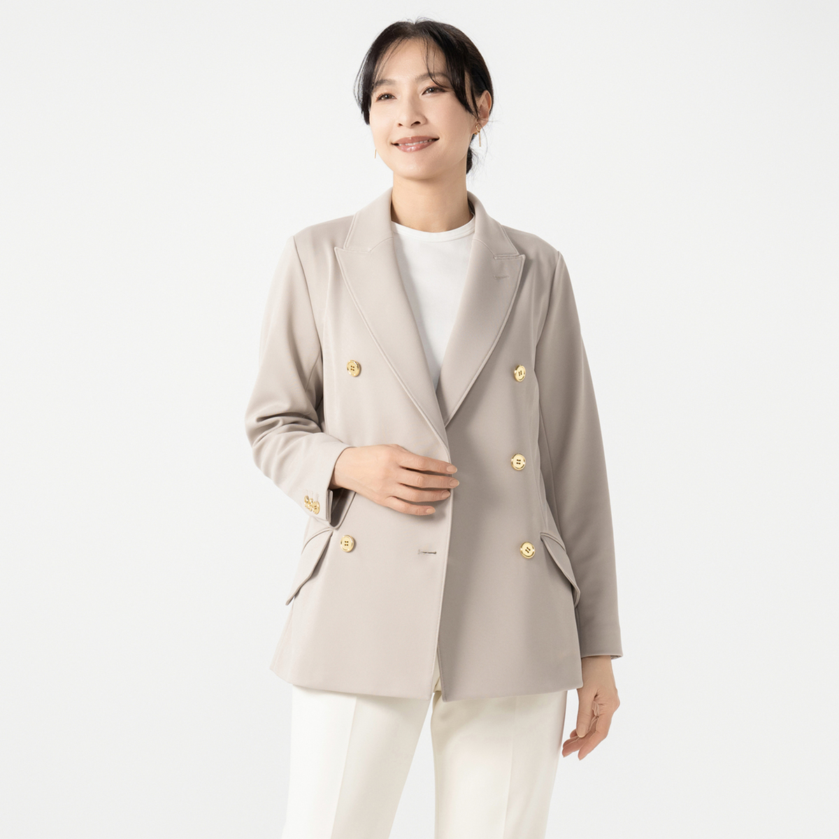長すぎず短すぎない丈で、ウエストを適度に絞ったフェミニンなBOXシルエット。後ろ中心裾は動きやすいベント仕様です。きちんとした着こなしからカジュアルコーデまで着映えするデザインです