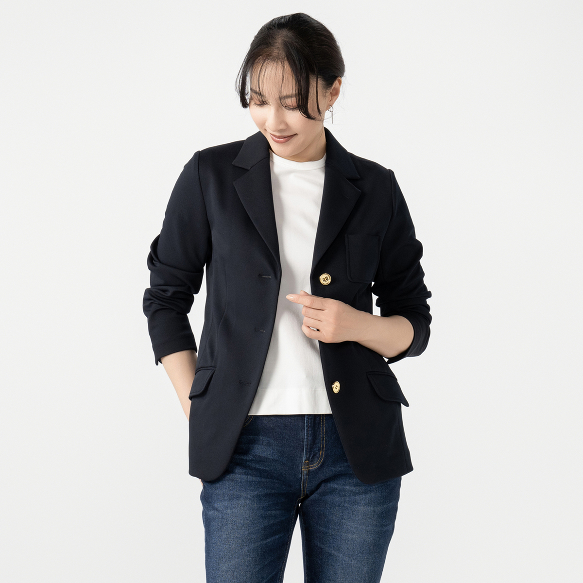 ボタンはアクセントの効いたメタリック色。前見返し端・背中心からベントまで、ボタンに合わせたメタリック色のパイピング始末に。撥水、UVカット、防しわ、ピリングができにくい機能性も持ち合わせています