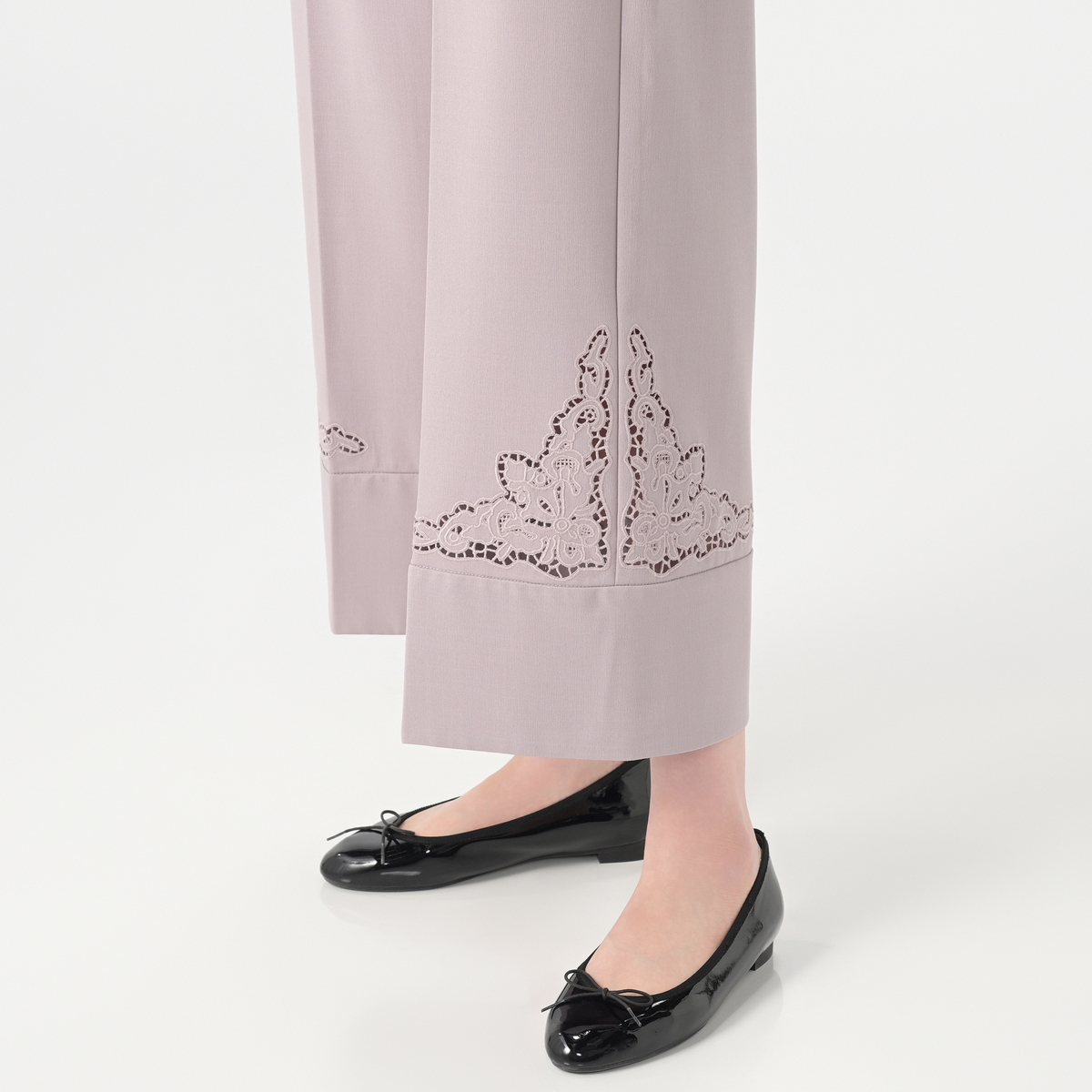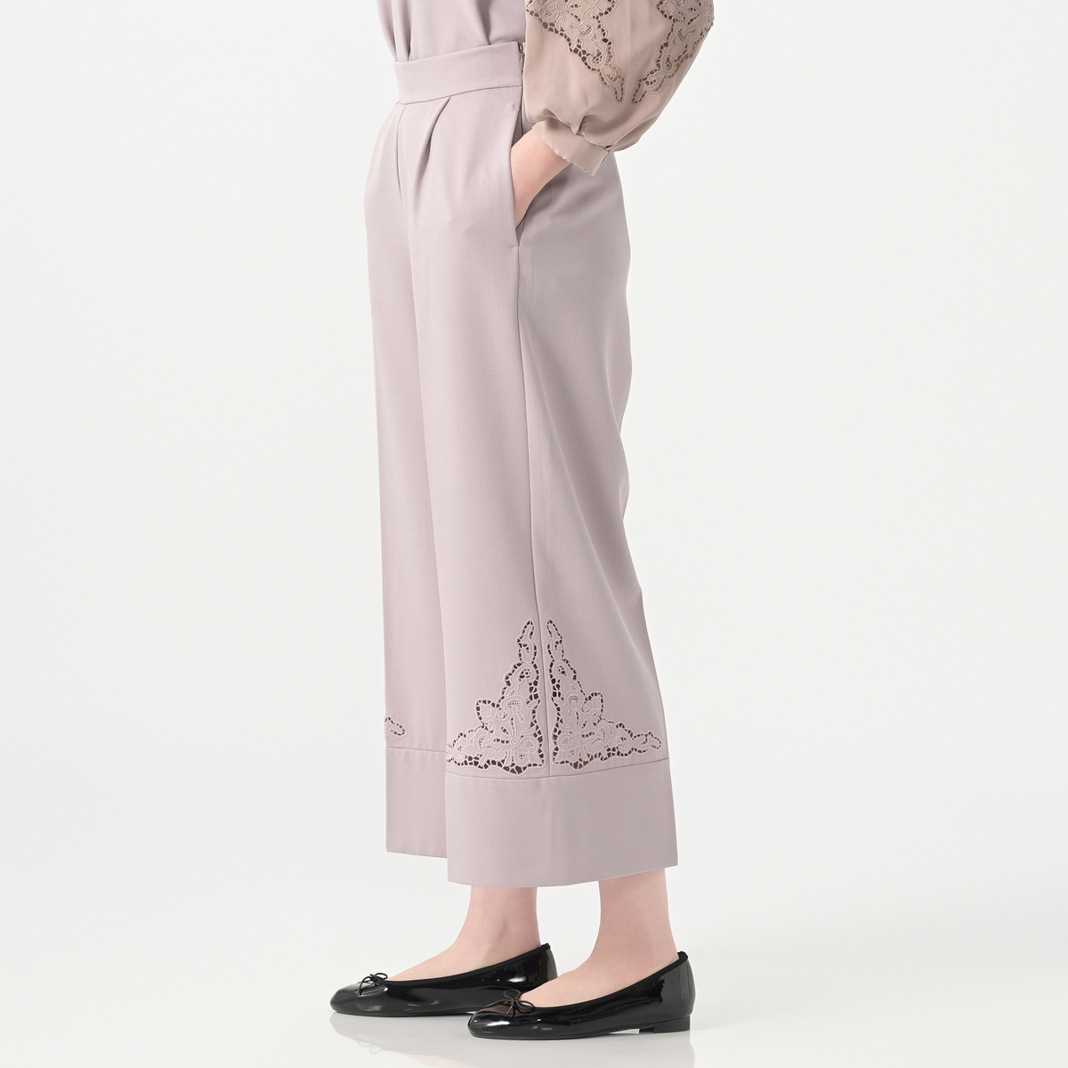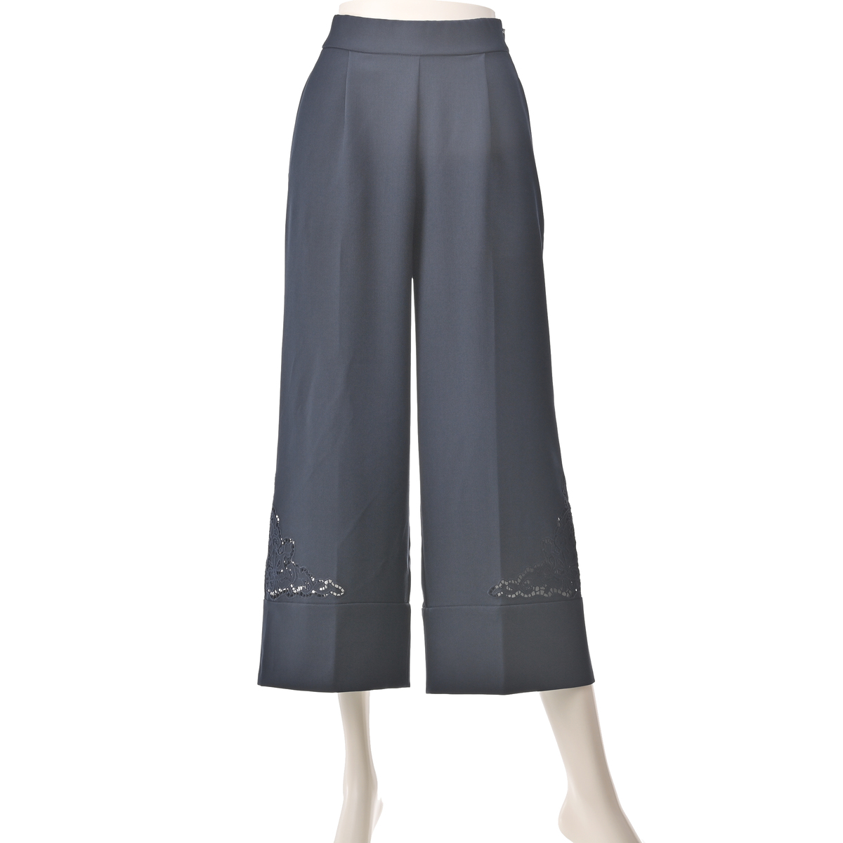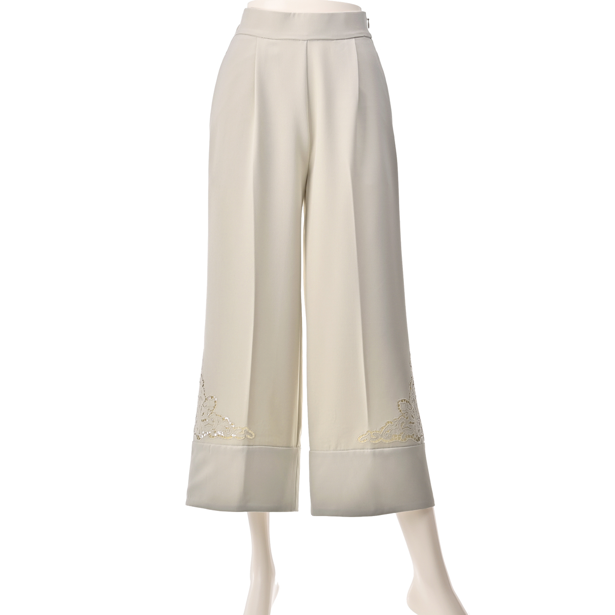 サイドに施したカットワーク刺繍が上品なセミワイドパンツ。裾は幅広のダブル仕立てにすることで落ち感が生まれ、さらにセンタープレスが縦のラインを強調し、美しいシルエットを保つ効果が期待できます