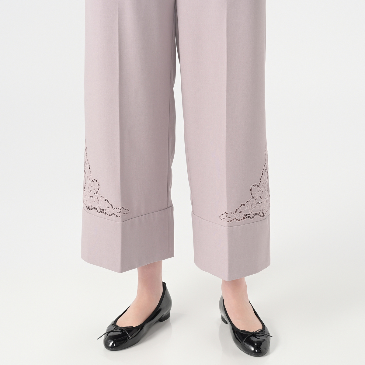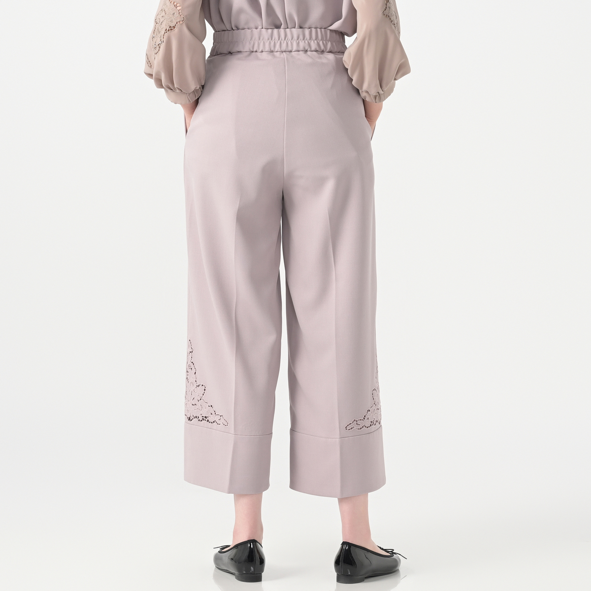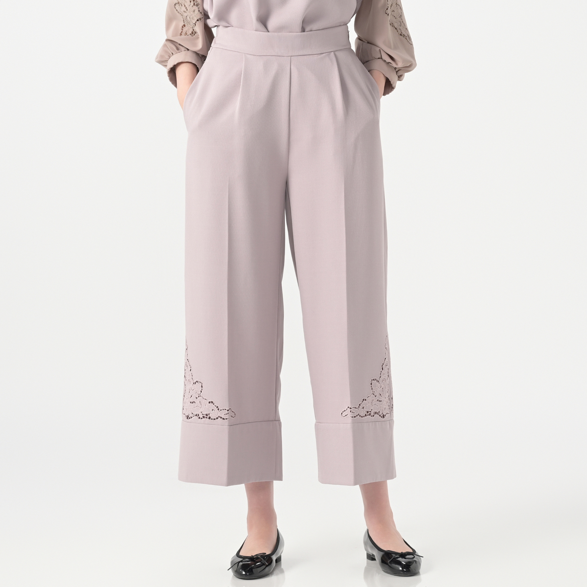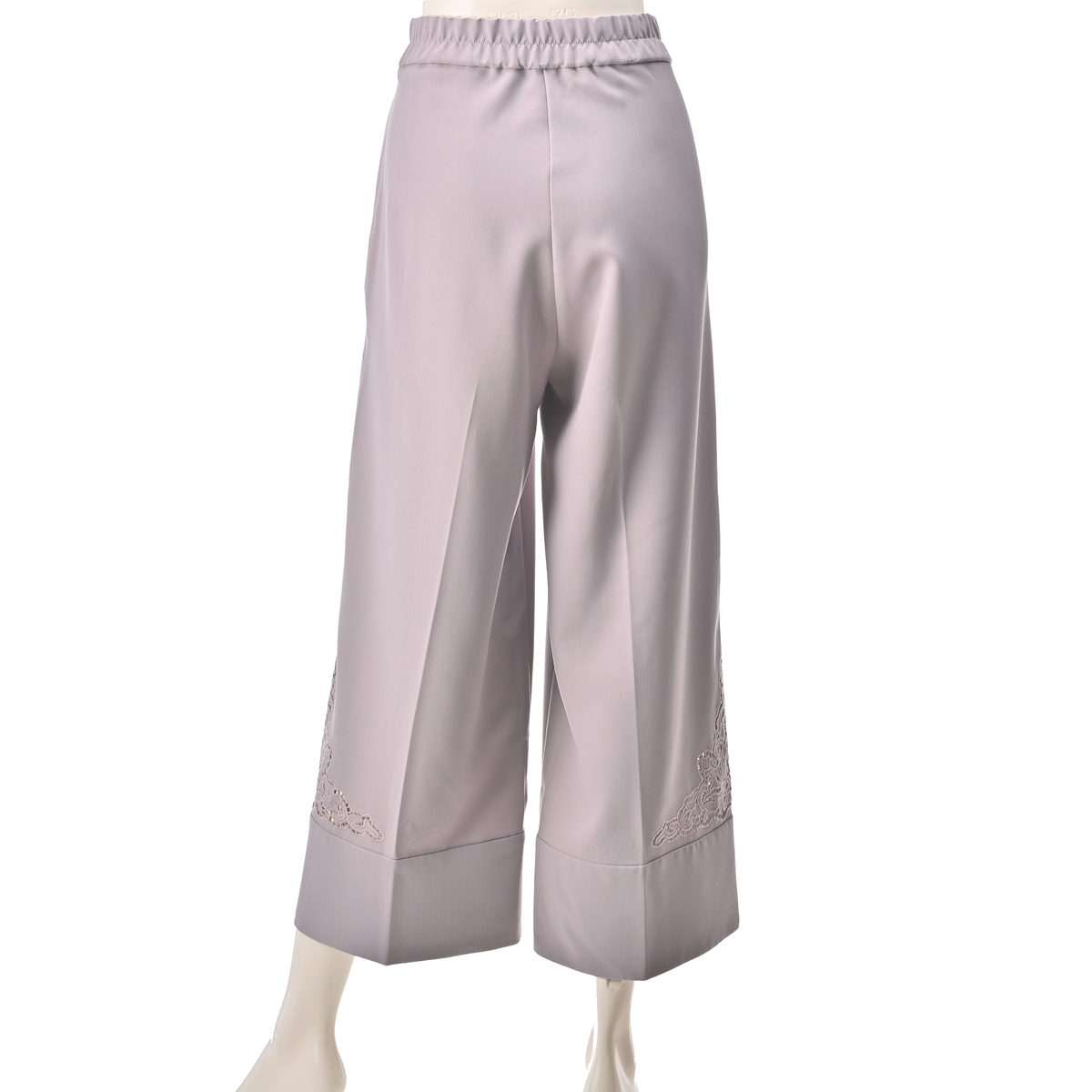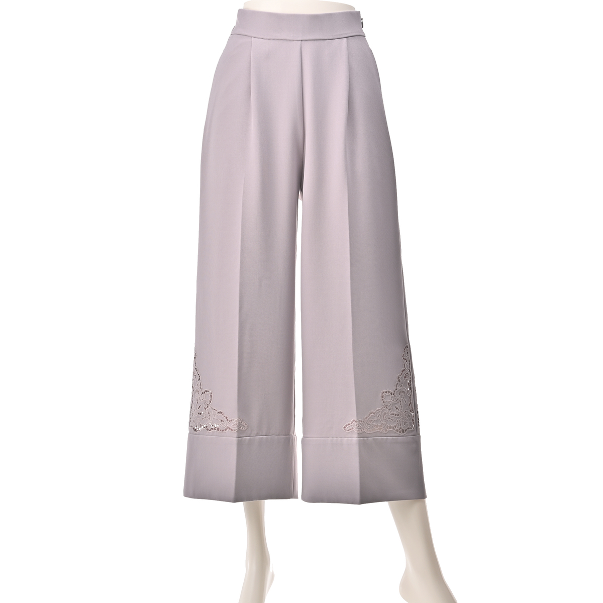 サイドに施したカットワーク刺繍が上品なセミワイドパンツ。裾は幅広のダブル仕立てにすることで落ち感が生まれ、さらにセンタープレスが縦のラインを強調し、美しいシルエットを保つ効果が期待できます