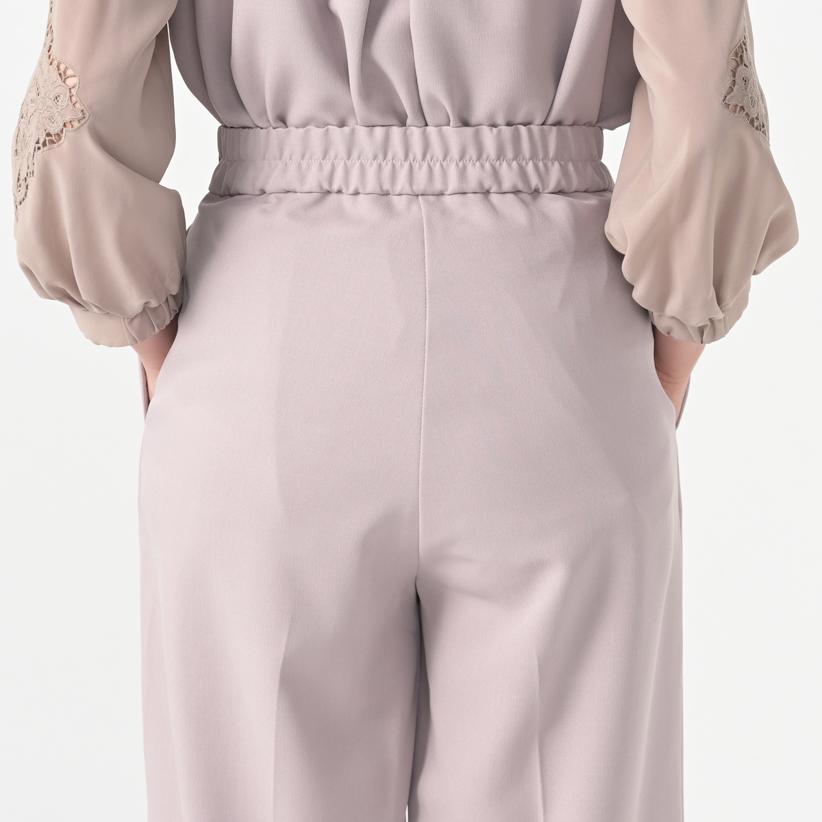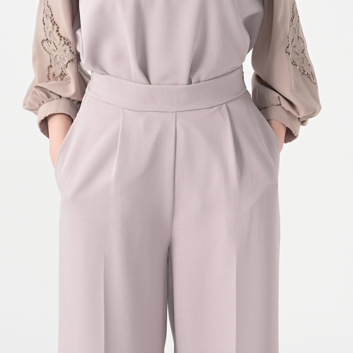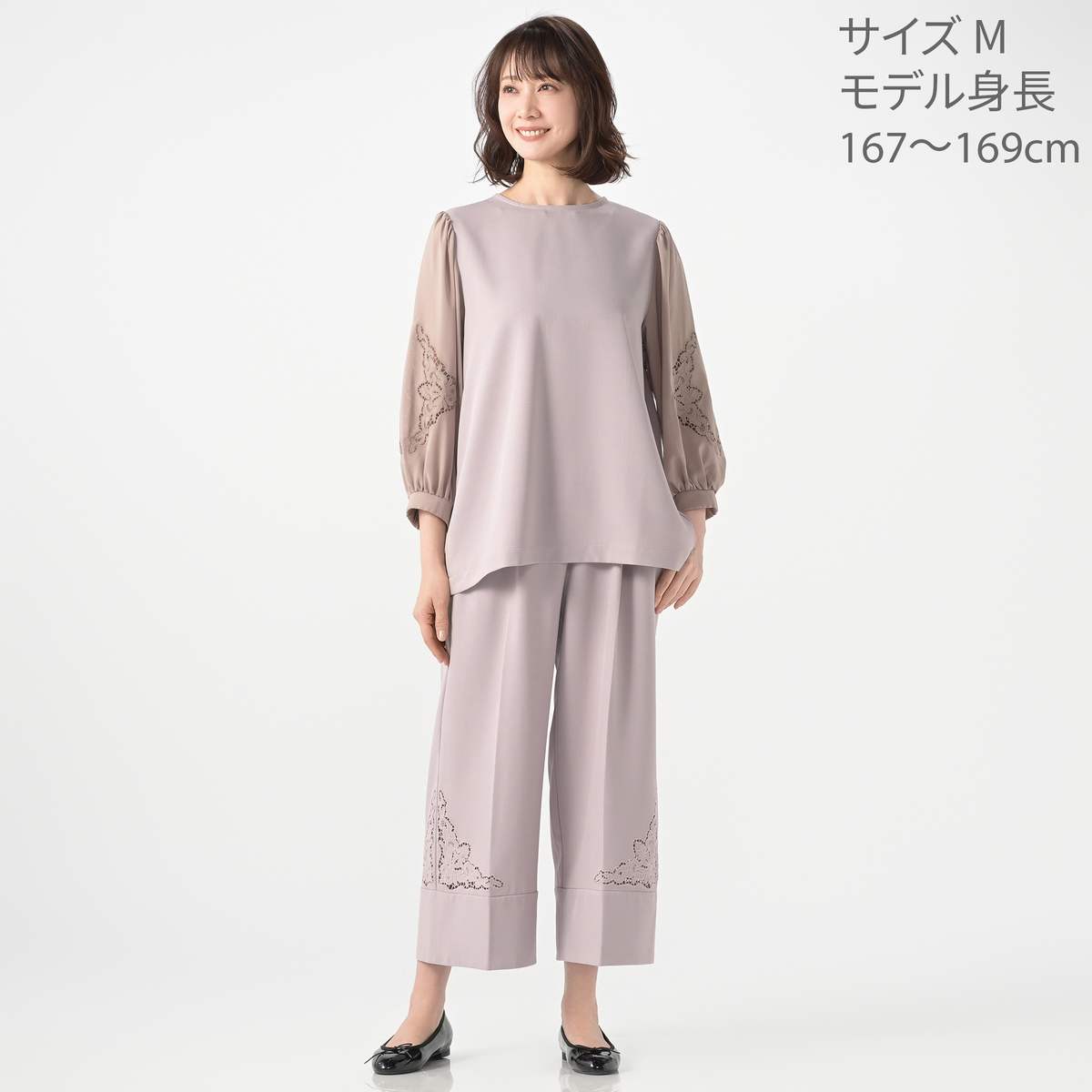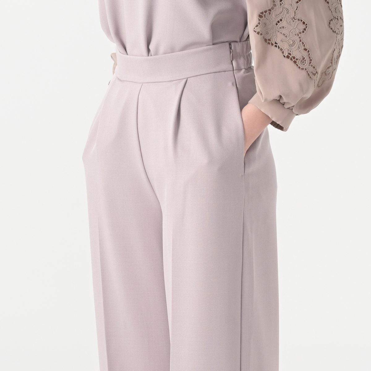 サイドに施したカットワーク刺繍が上品なセミワイドパンツ。裾は幅広のダブル仕立てにすることで落ち感が生まれ、さらにセンタープレスが縦のラインを強調し、美しいシルエットを保つ効果が期待できます