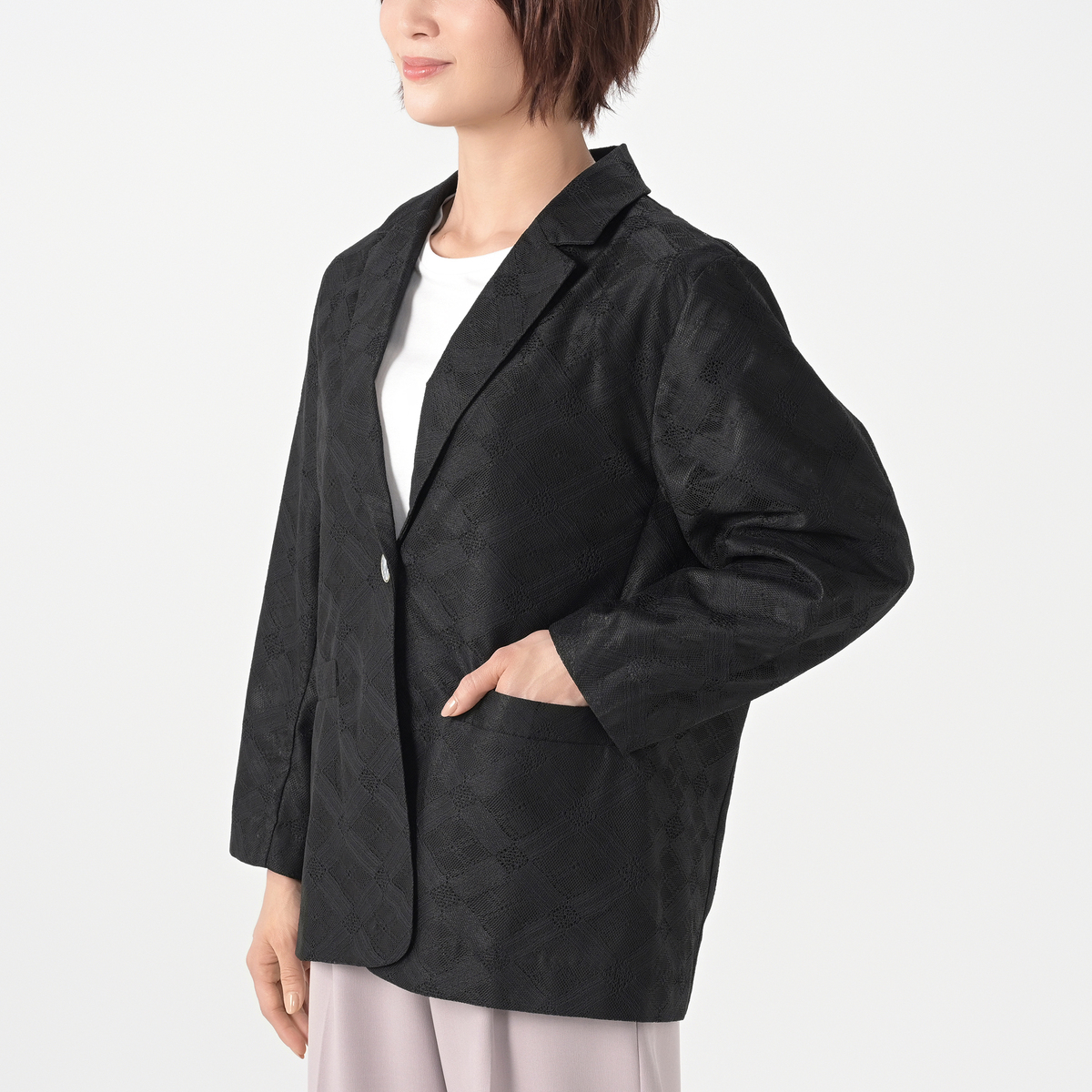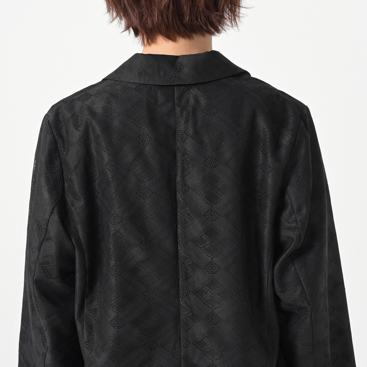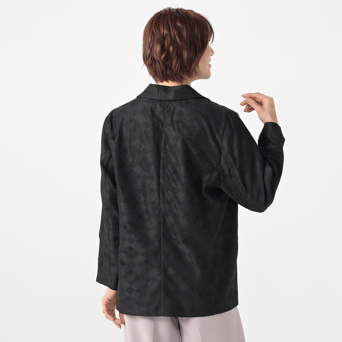ジオメトリック柄が印象的なジャケットです。身頃と衿部分にはスレキにレースを重ねた生地を使用。袖部分はタフタ生地にレースを重ねて、着用時の軽やかさを出しています