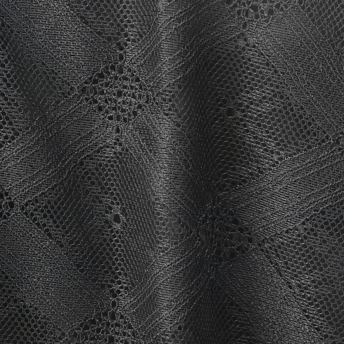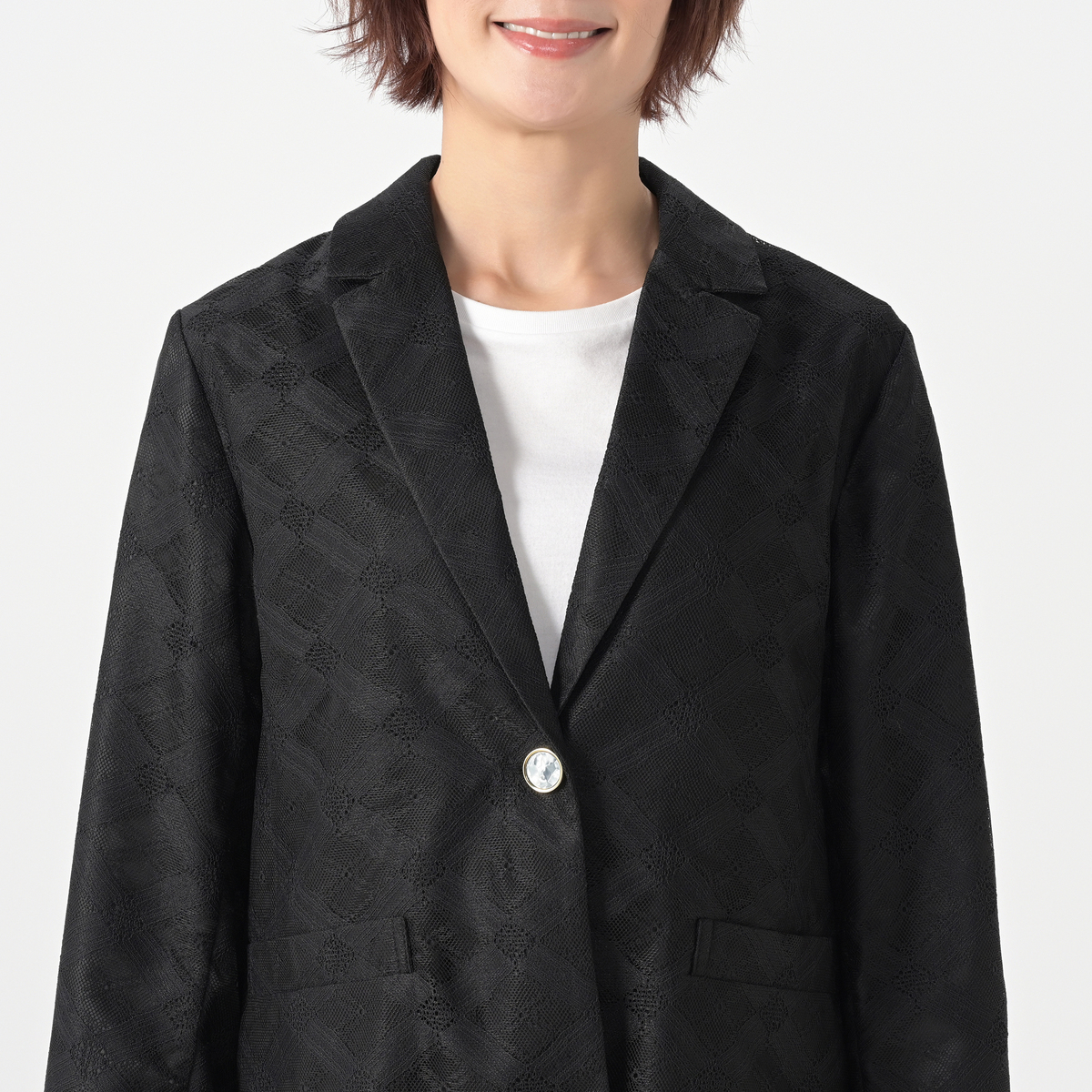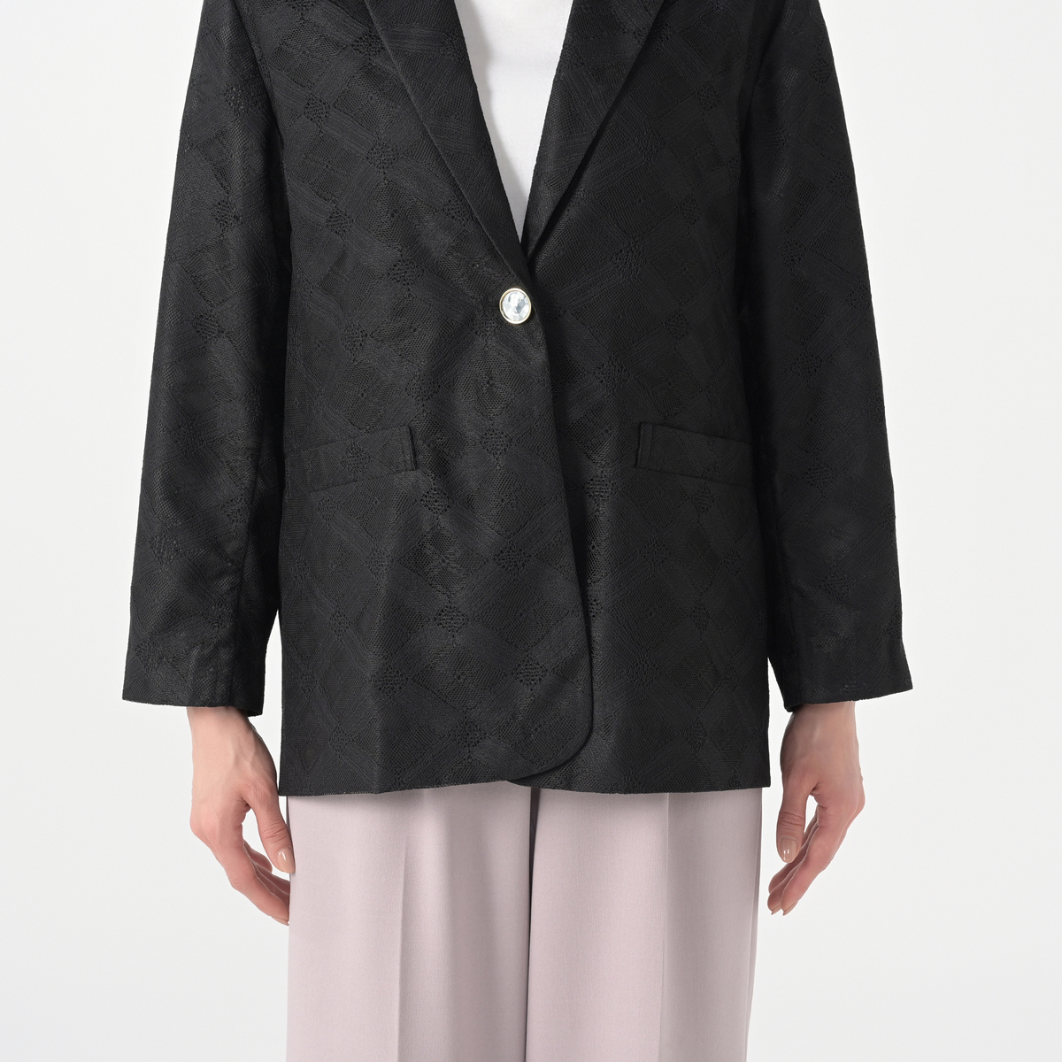 ジオメトリック柄が印象的なジャケットです。身頃と衿部分にはスレキにレースを重ねた生地を使用。袖部分はタフタ生地にレースを重ねて、着用時の軽やかさを出しています
