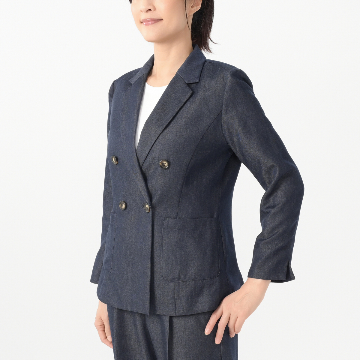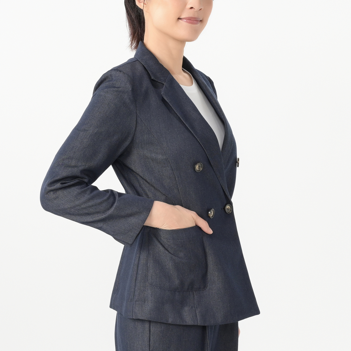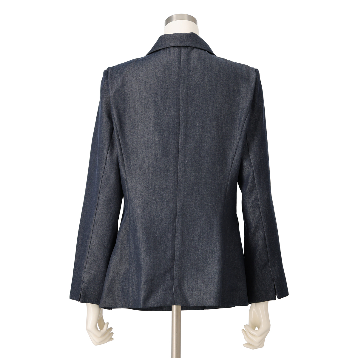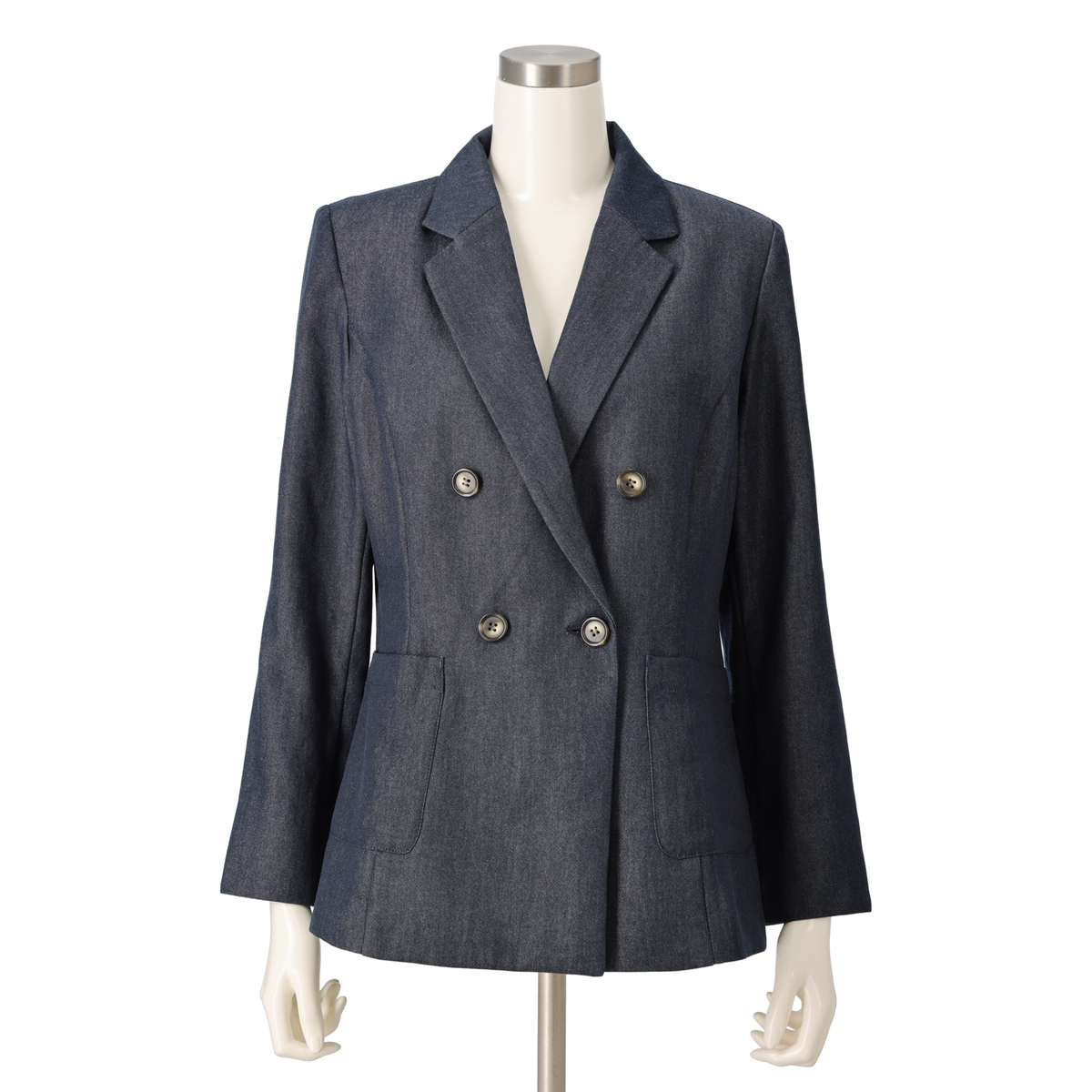 デニム見えのポリエステル100%素材を使用したきれいめデザインのダブルジャケット。かっちりし過ぎず、デニム調素材と貼りポケットがこなれ感を演出します