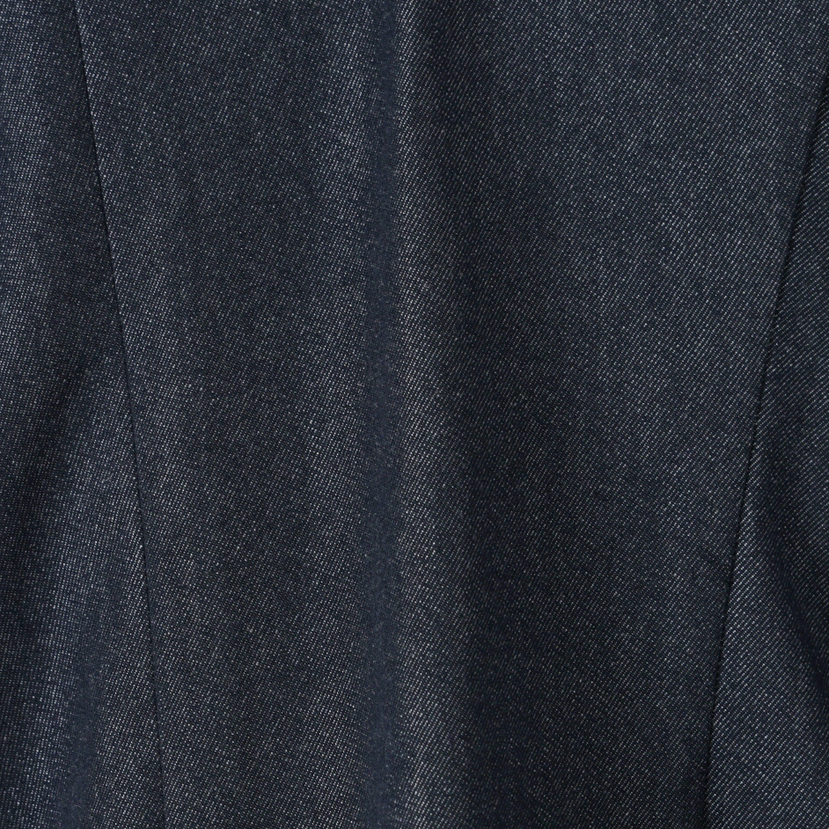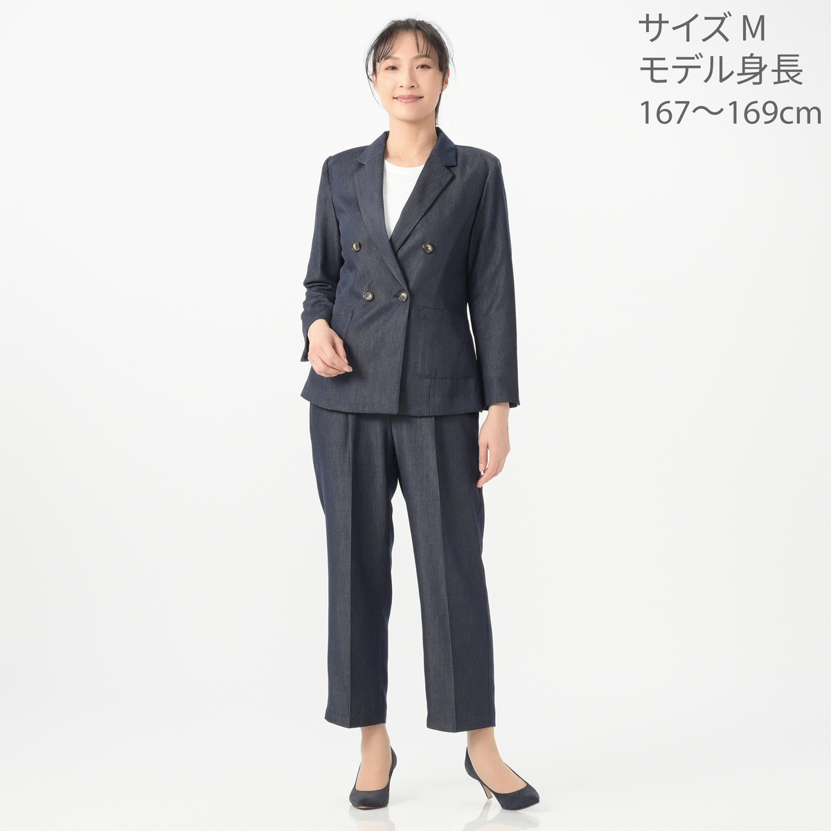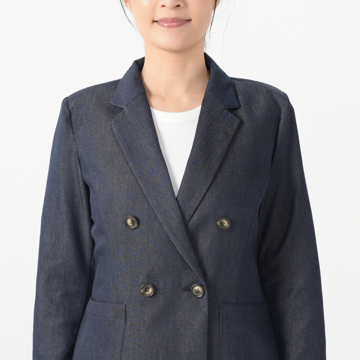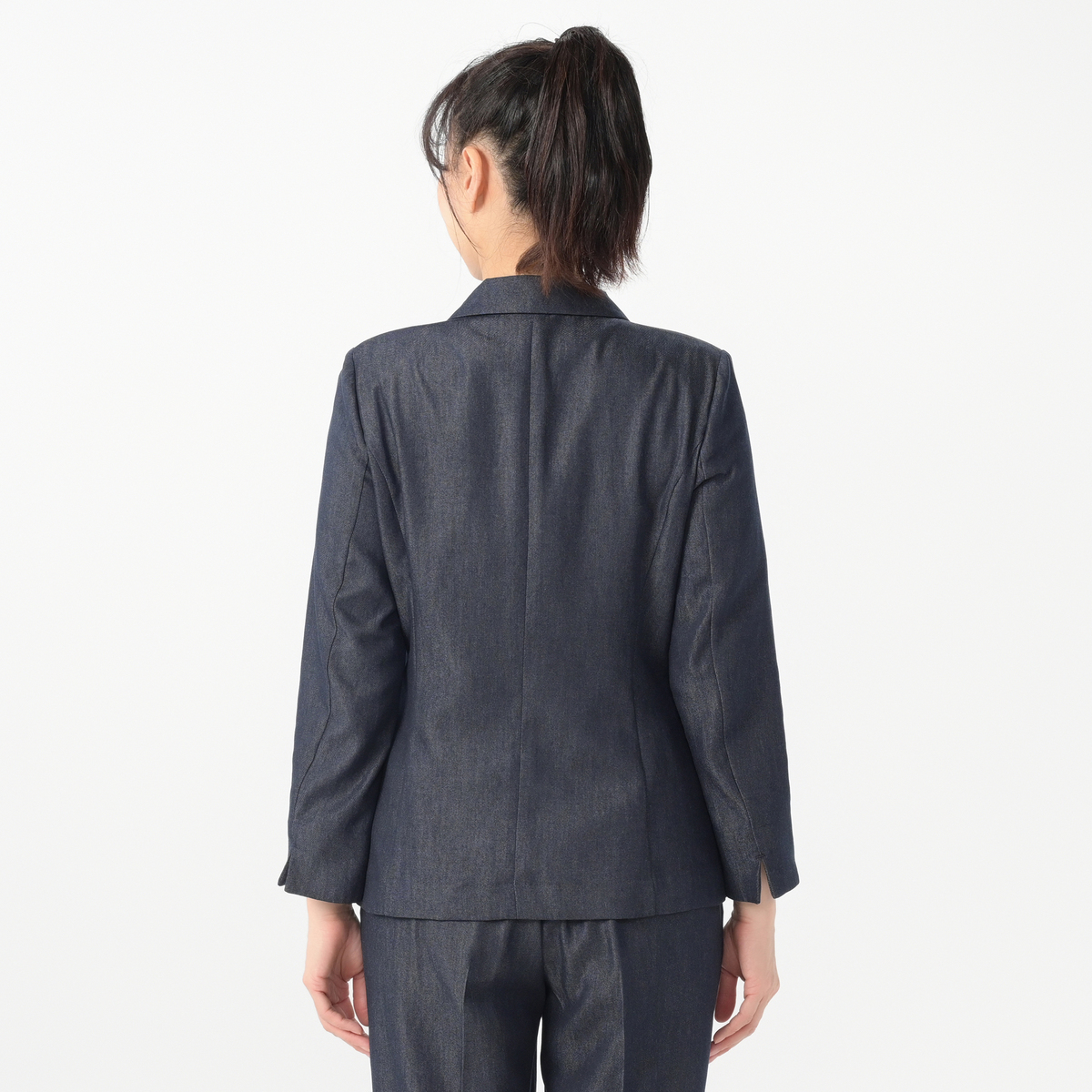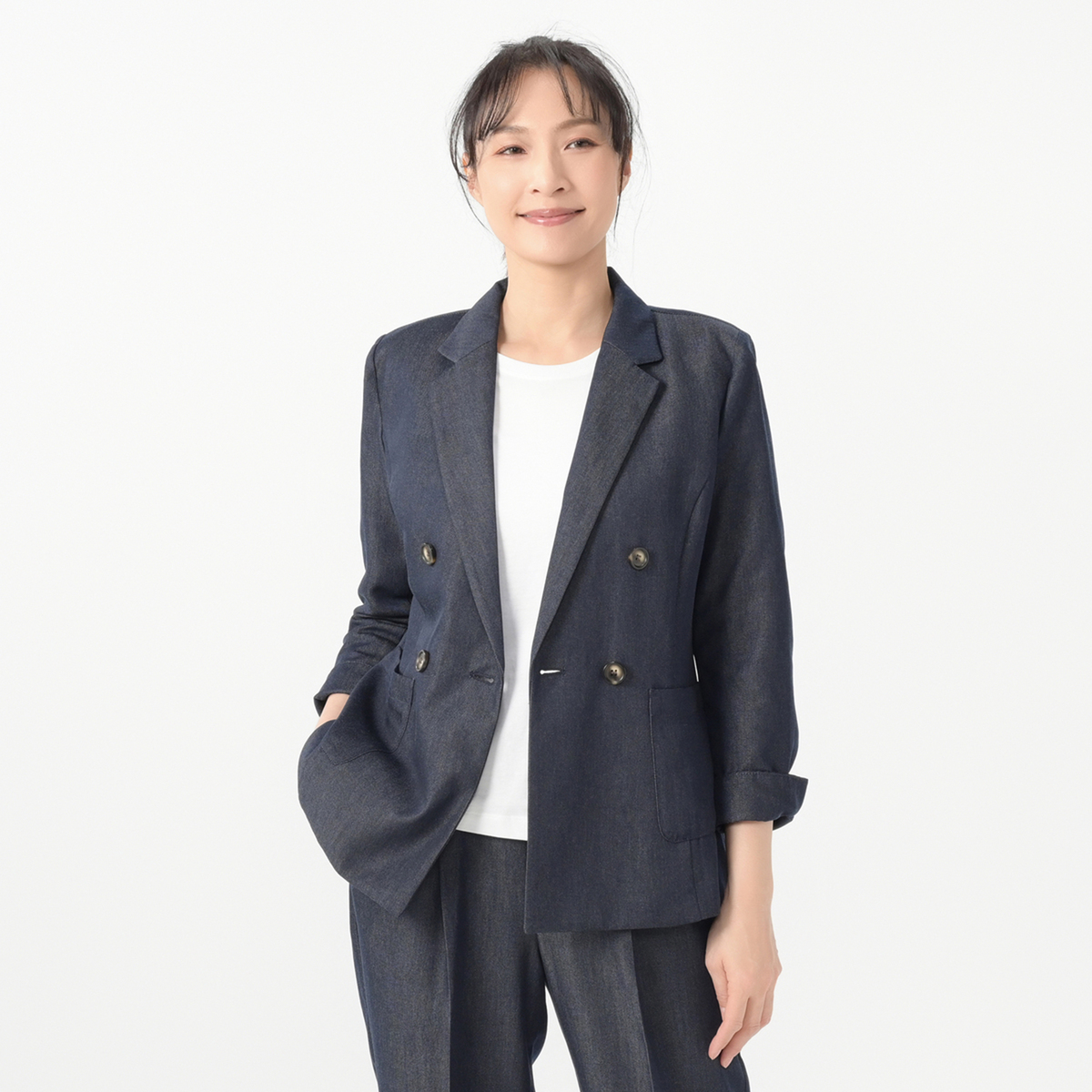 デニム見えのポリエステル100%素材を使用したきれいめデザインのダブルジャケット。かっちりし過ぎず、デニム調素材と貼りポケットがこなれ感を演出します