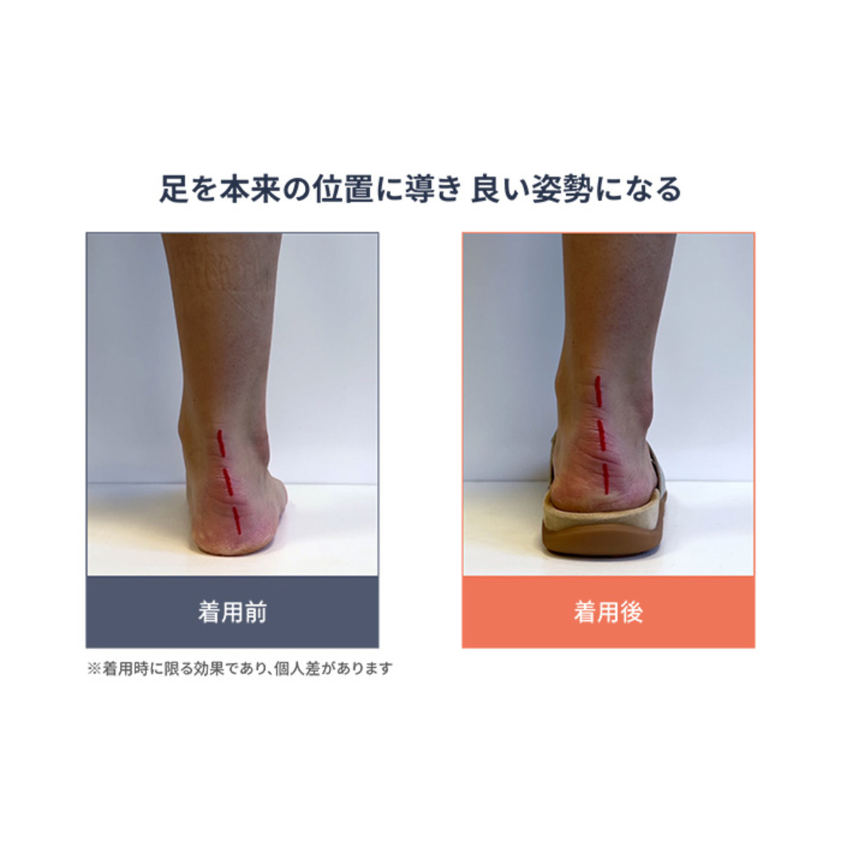 かかとと中足骨部分のクッション(青い部分)は、インソールとの間に空洞を持たせる構造に。歩行時に負担のかかりやすい、かかとと中足骨への衝撃を軽減し、歩行運動中のストレス、疲労、衝撃を軽減するのをサポートします