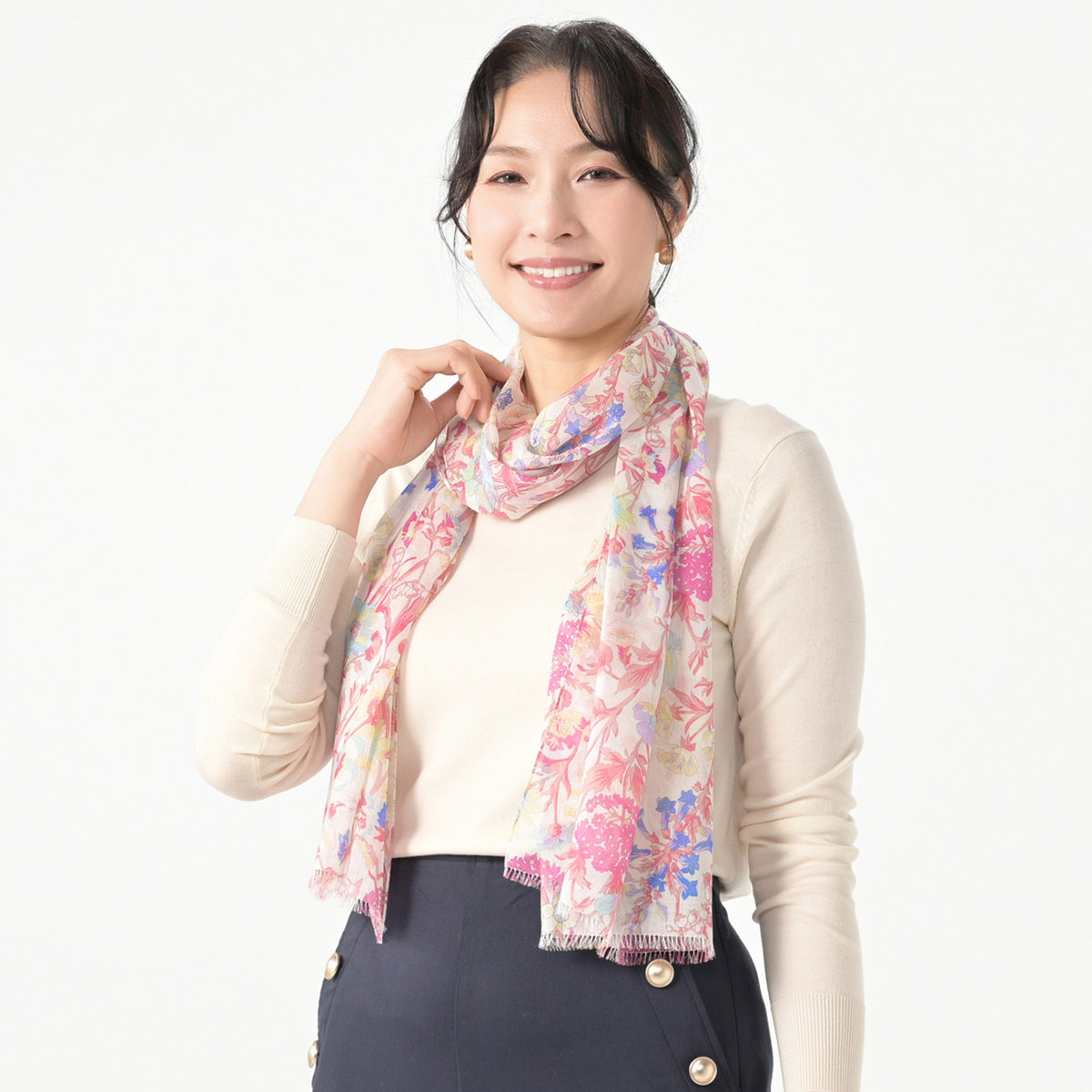 華やかなリバティプリントのストール。リバティプリントとは、100年以上にわたり世界中の人々から愛され続ける、英国リバティ社がデザインするオリジナルファブリック。美しい柄がコーディネートを華やかに演出してくれます