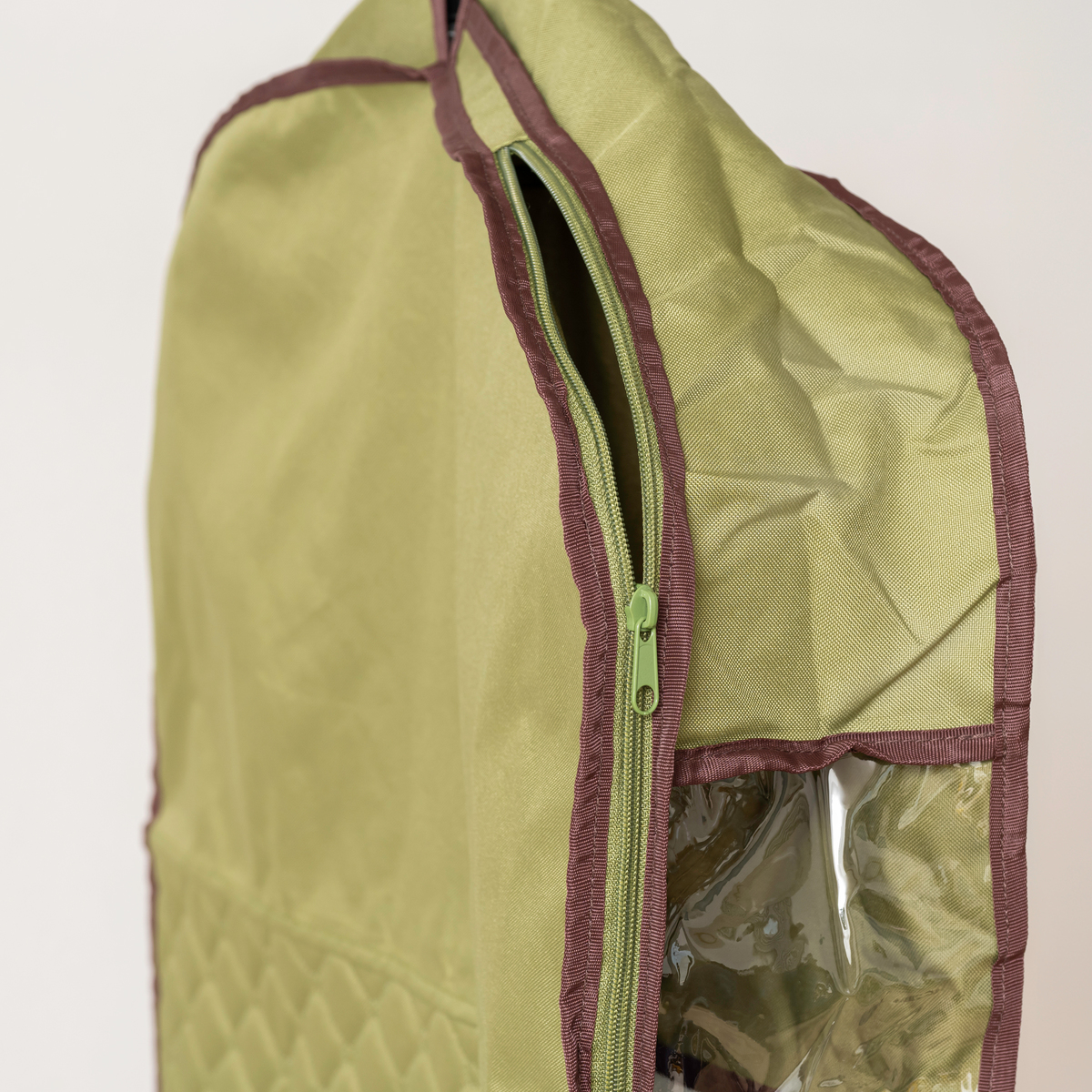 幅広いマチ付き(奥行き約15cm)のため、複数枚収納可能。側面(片側)には透明な窓付きで中身が見やすく。サイドにはファスナー付きで、クローゼットの中であってもラクに出し入れが可能です