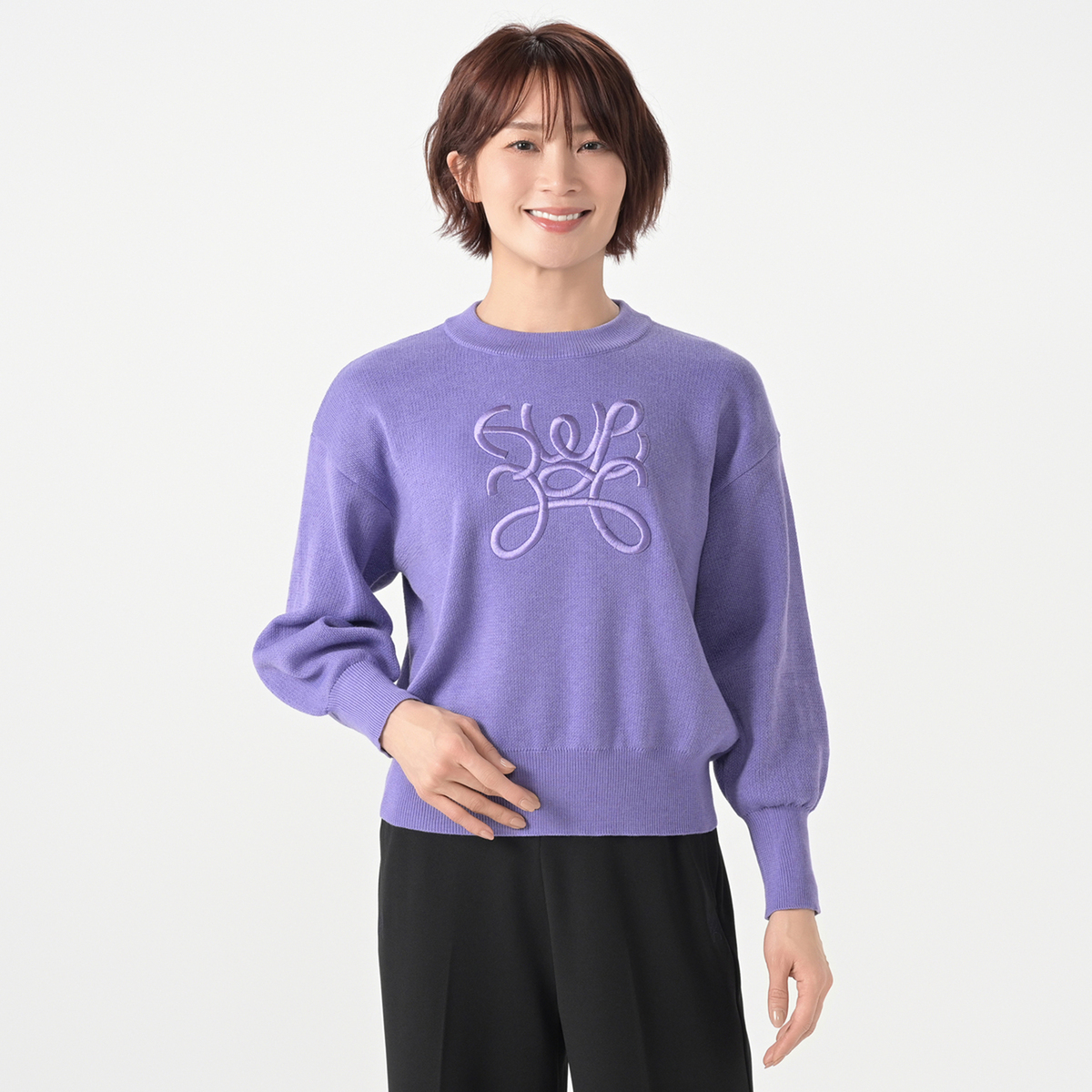 身生地と同色系のロゴ刺繍が目を引くニット。バランスを取りやすいコンパクトなショート丈とボリュームのある袖にトレンド感があり、様々なボトムスとのコーディネートをお楽しみ頂けます