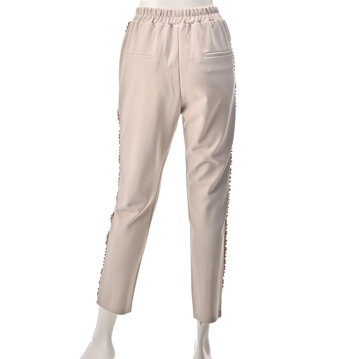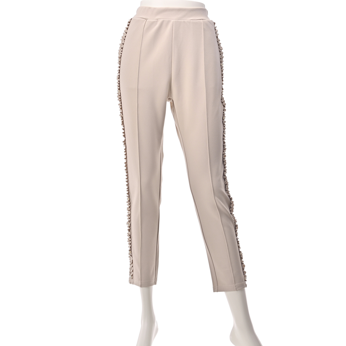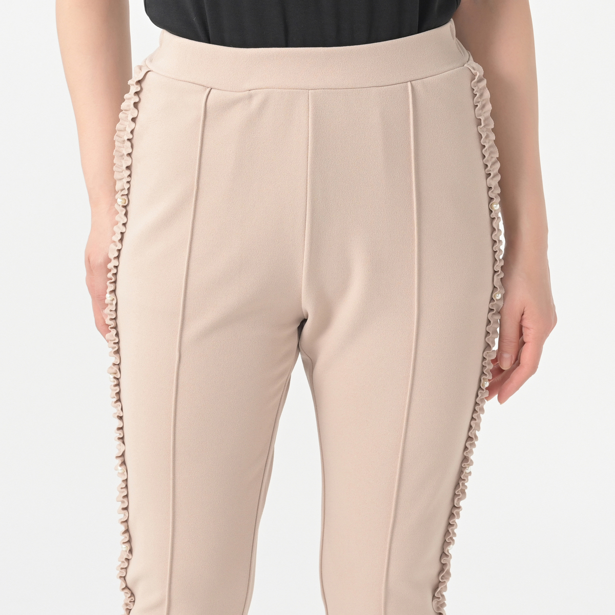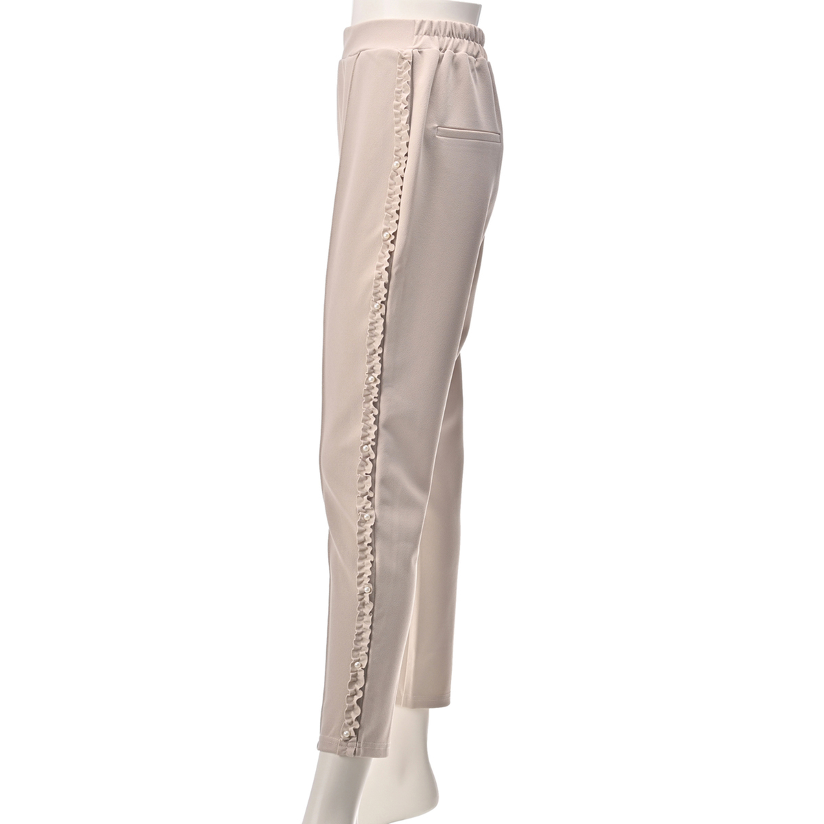 両サイドにフリルとパールをあしらった華やかなパンツ。クラシカルでエレガントな雰囲気溢れるアイテムです