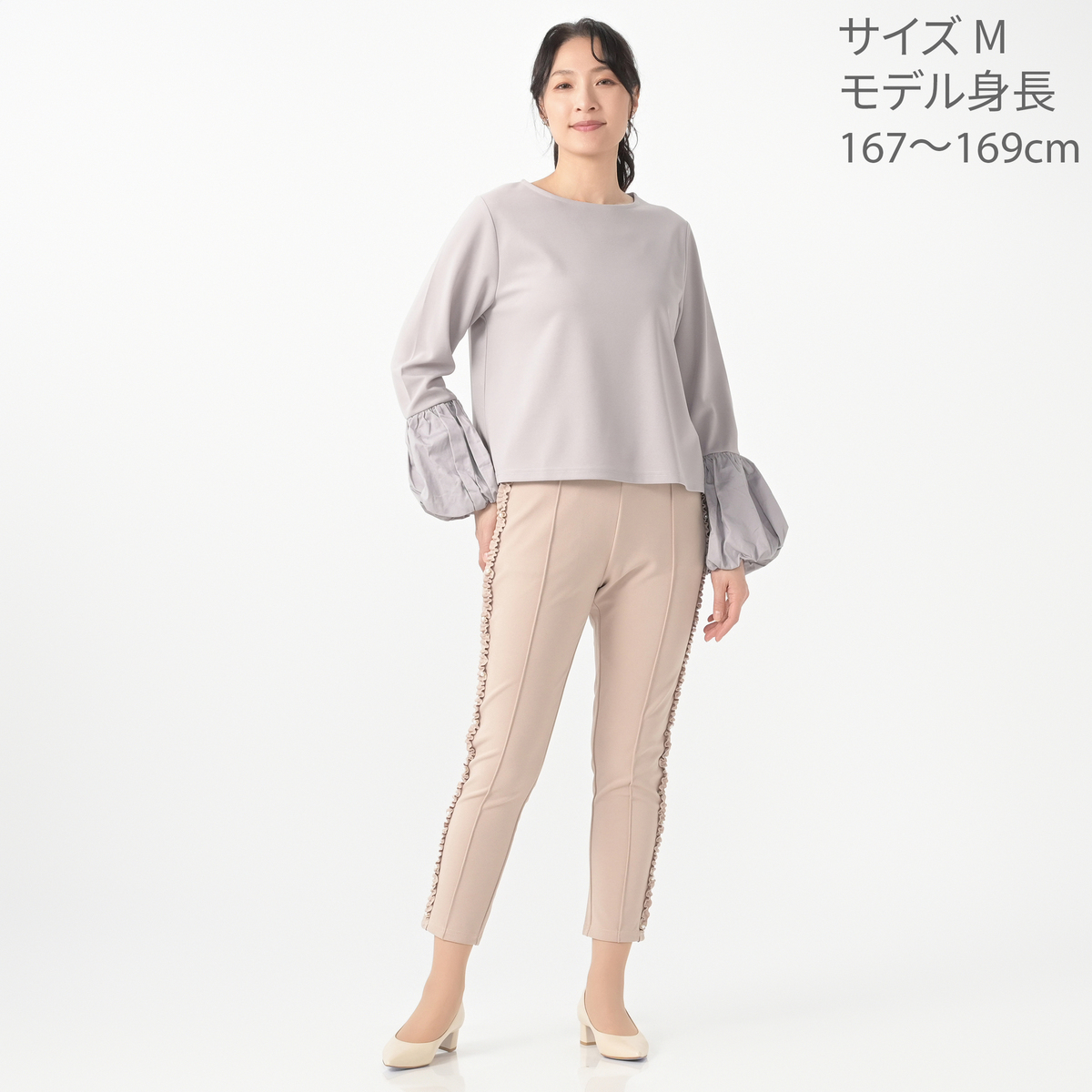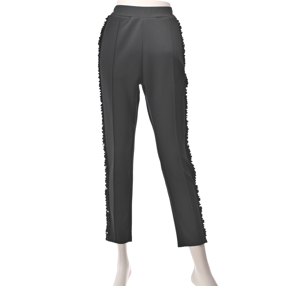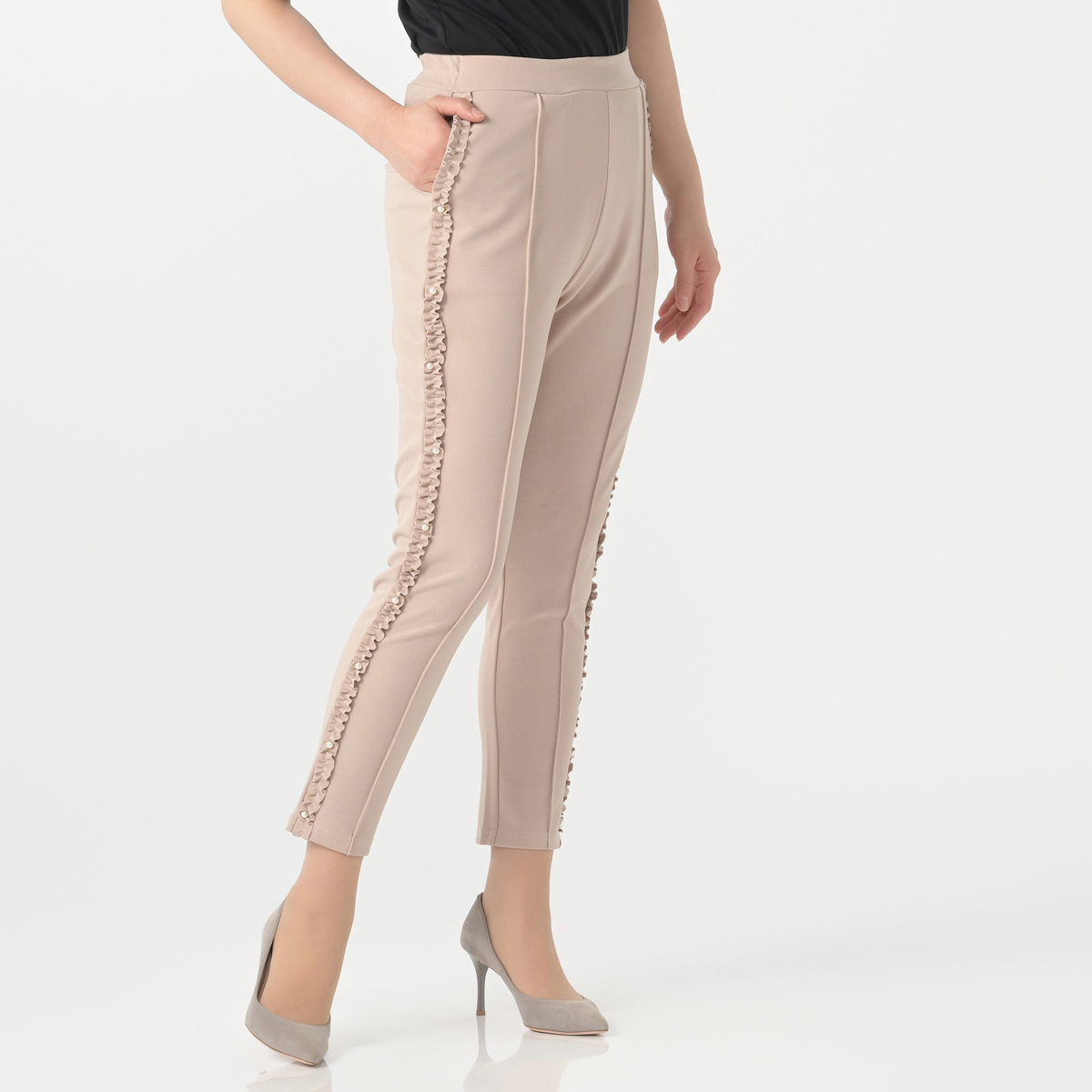 両サイドにフリルとパールをあしらった華やかなパンツ。クラシカルでエレガントな雰囲気溢れるアイテムです