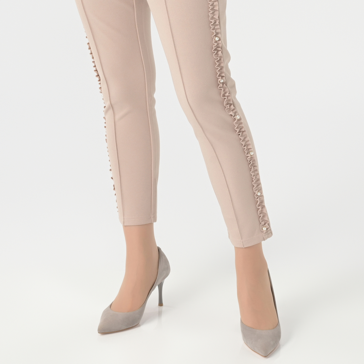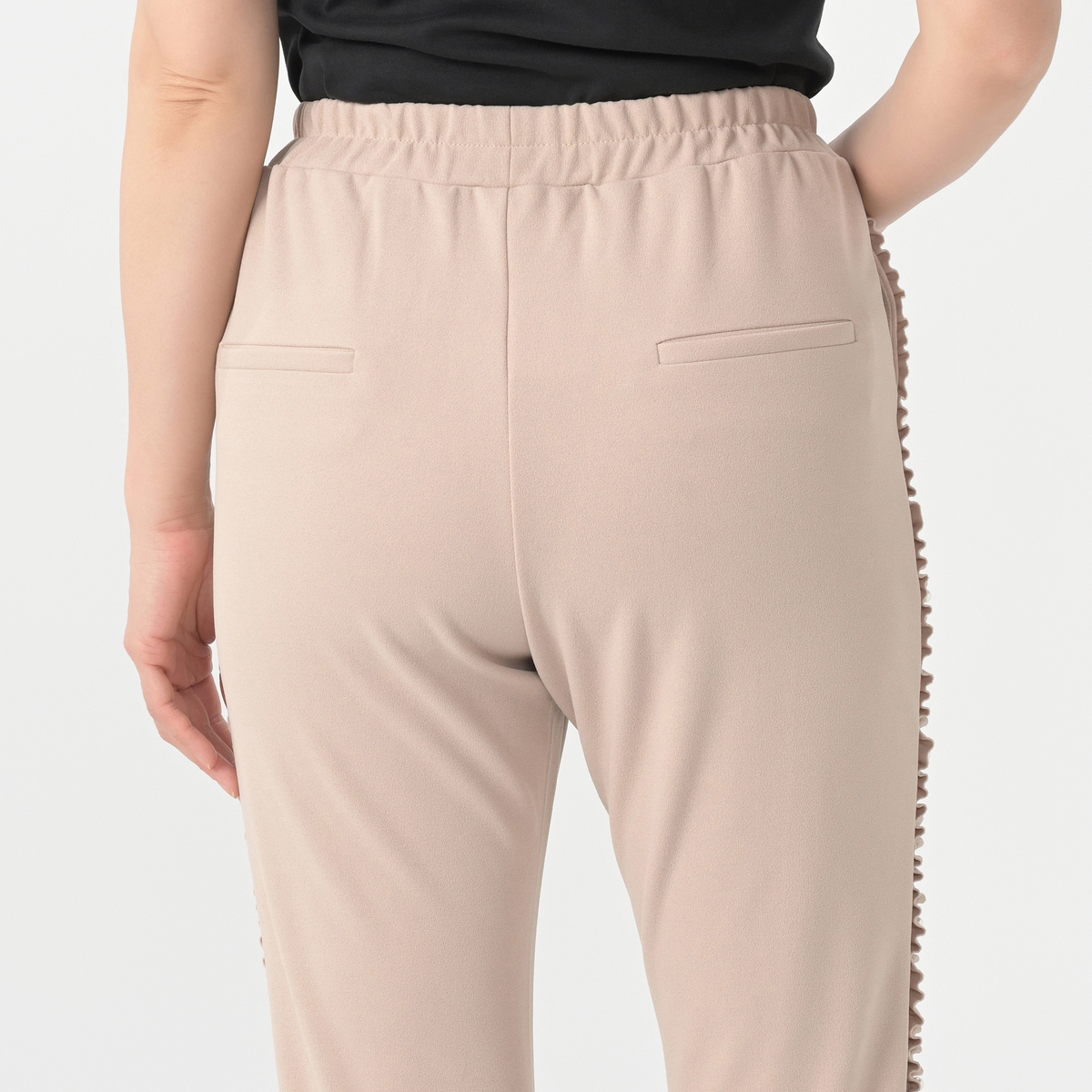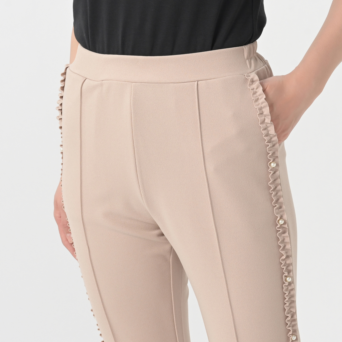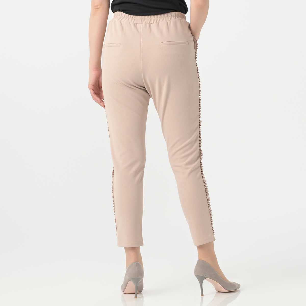 両サイドにフリルとパールをあしらった華やかなパンツ。クラシカルでエレガントな雰囲気溢れるアイテムです