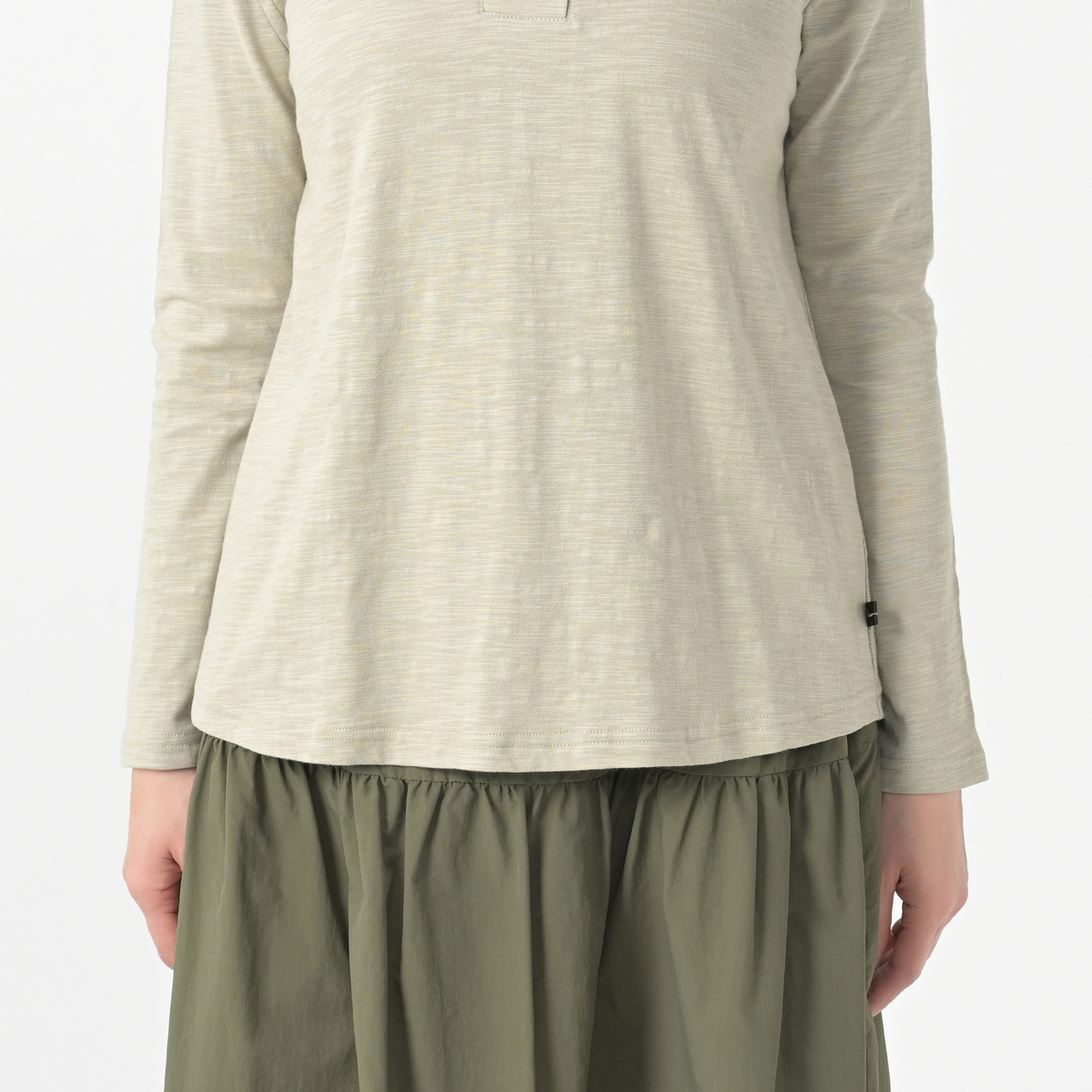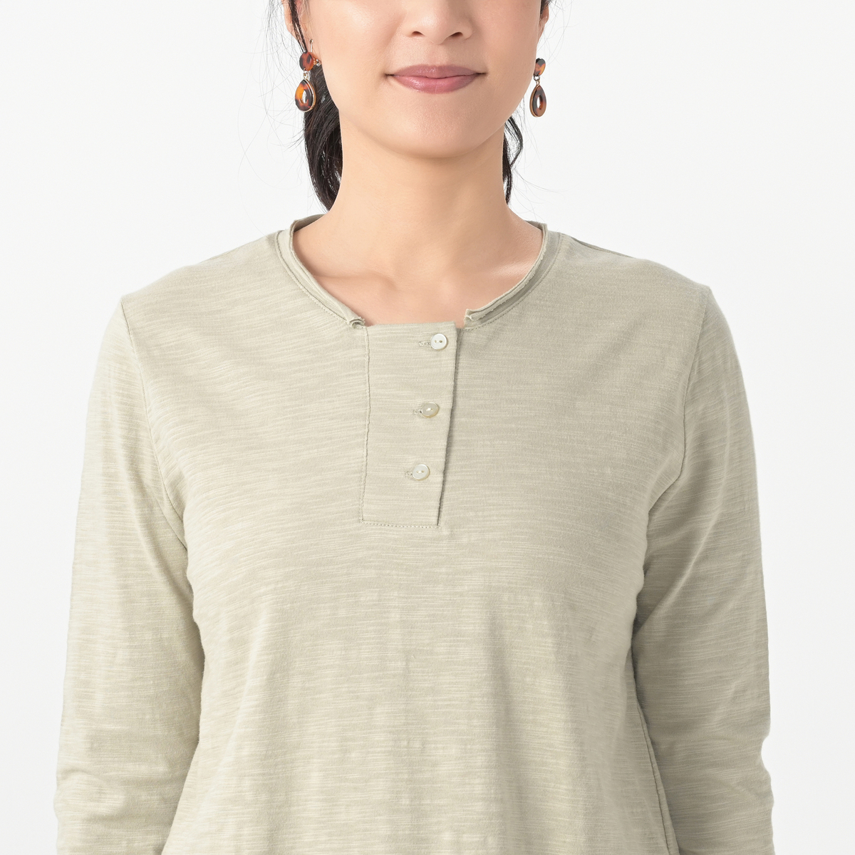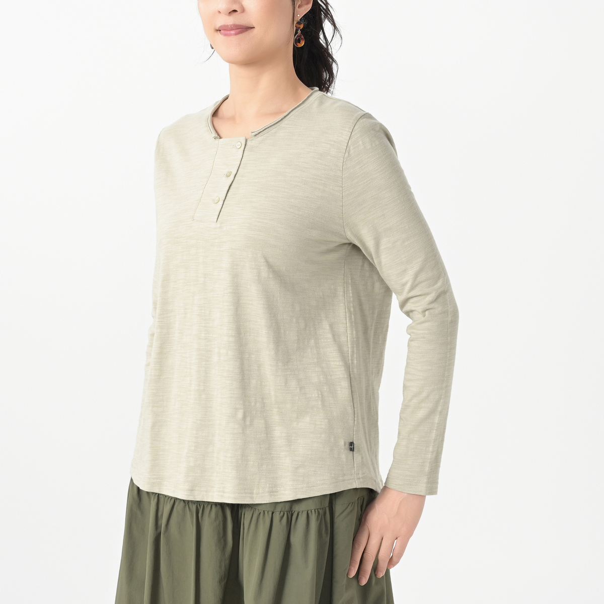 コットンスラブのカットソー素材を使用したヘンリーネックプルオーバー。ベーシックなデザインで着回しに活躍してくれます