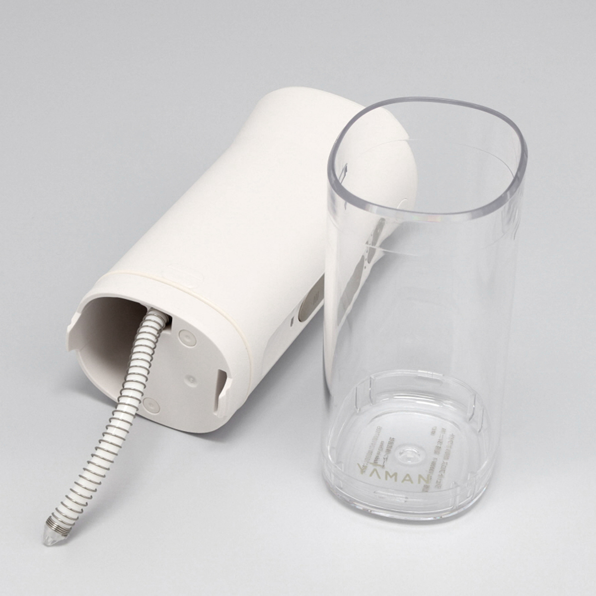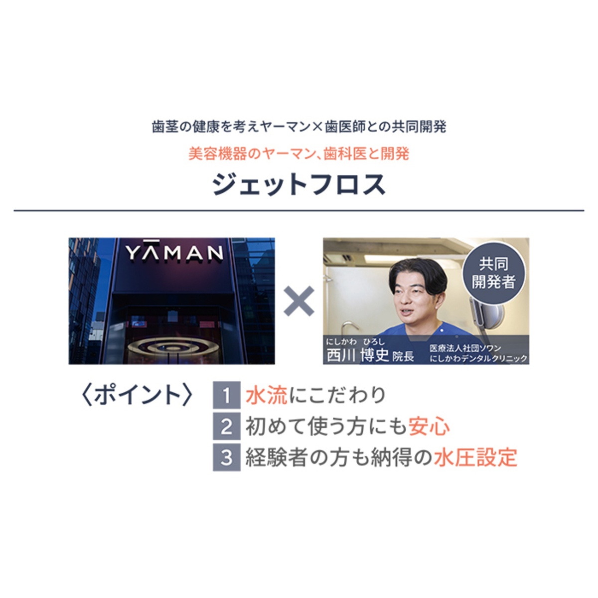 ヤーマンと歯科医西川博史氏が共同開発した口腔洗浄器です。トルネード水流で落としにくい歯垢の汚れをすっきりと除去。防水仕様(IPX-7)です(*1)
