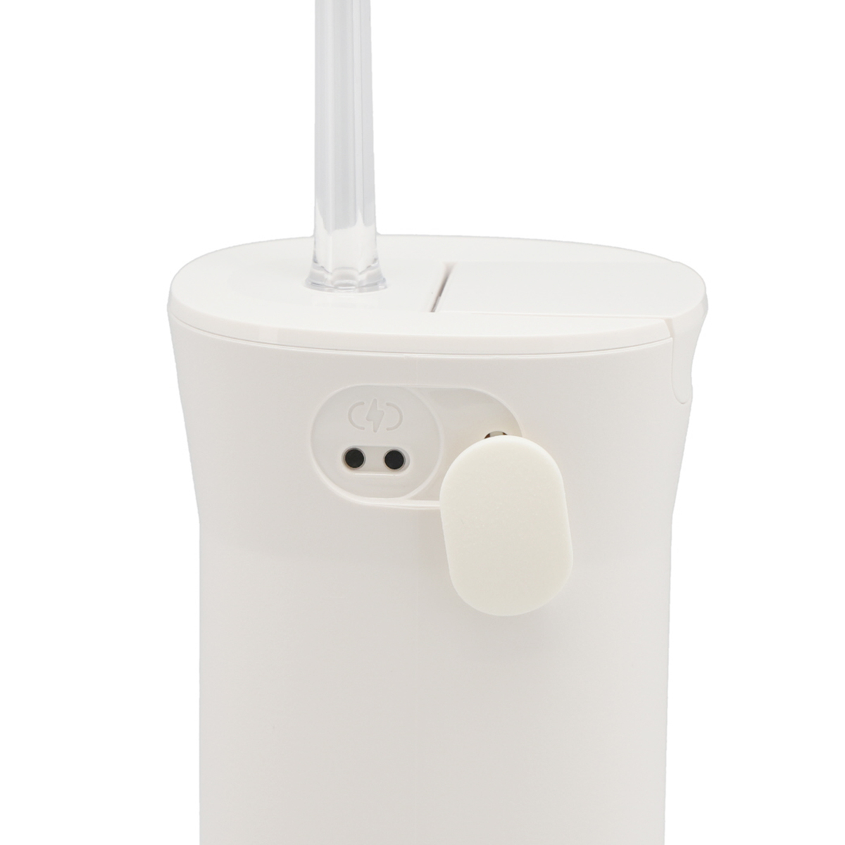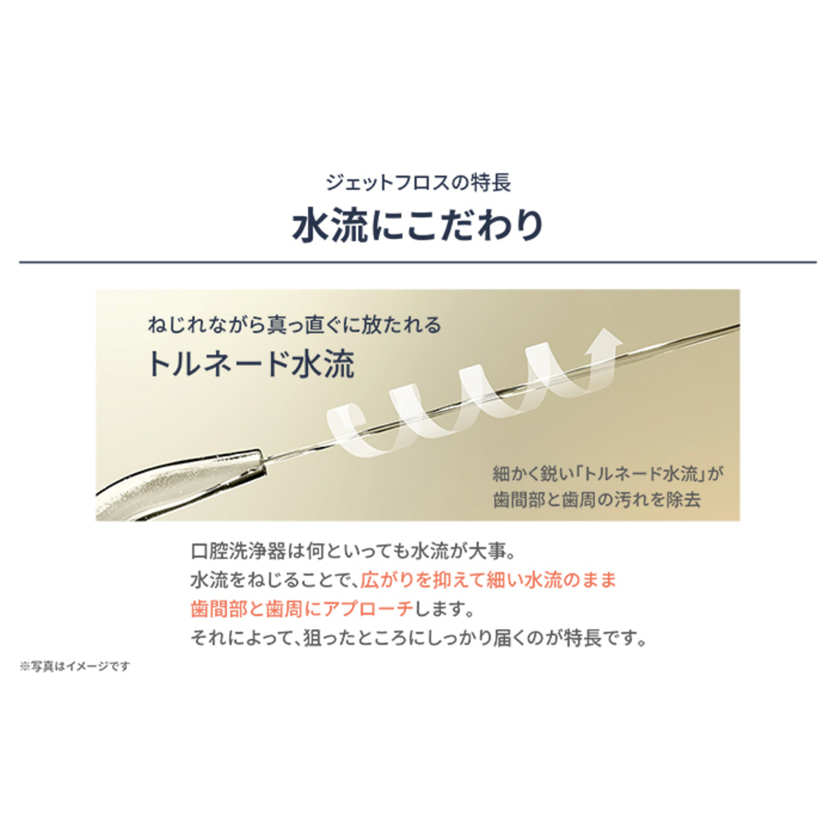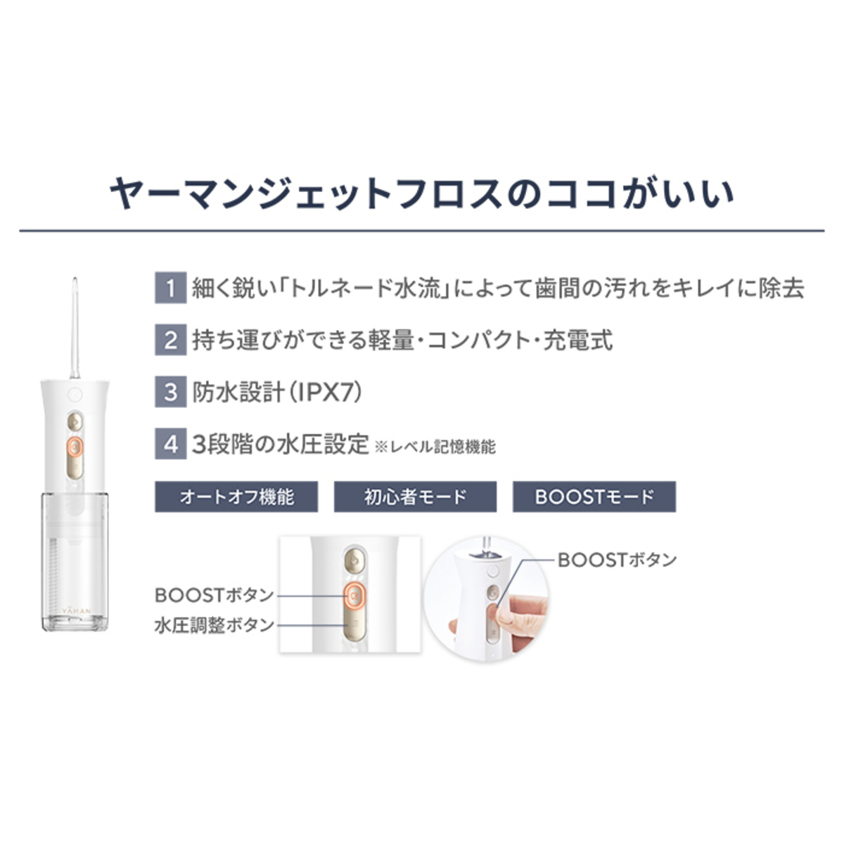 [商品内容] ・本体 ・ジェットノズル ・ソフト回転ノズル ・充電用USBケーブル ※ACアダプターは付属していません [サイズ] 約12.5×5×5.9cm [重量] 約210g [材質] 本体:ABS樹脂 タンク:トライタン ジェットノズル:トライタン ソフト回転ノズル:トライタン、ABS樹脂、TPU [充電時間] 約2〜3時間充電で約20分使用可能 [使用方法] ・ノズルをノズル差し込み穴に差し込む ・本体を引き出し位置マークまで引き出す ・タンクに水、またはぬるま湯を入れる ・水圧のレベル(弱・中・強)を選択する ・ノズルを口腔内に入れる ・電源ボタンを押して電源をオンにする ・噴射した水が歯の間や、歯と歯茎の境目にあたるように口腔内でノズル先端を動かす ・電源ボタンを押して電源をオフにする ※オートオフ:約90秒間使用し続けると自動的に電源がオフになります [お手入れ] ・タンクに残った水を捨てる ・ノズルを取り外す ・タンクを洗う ・本体とノズルを拭く ・水気を拭き取り乾燥させる ■取り扱い説明を充分にご確認の上、ご使用下さい 【中国製】 [注意事項] ※次に該当する人は使用しない ※本製品を使用される前に必ず医師にご相談下さい 医用電気機器を使用している人 ・ペースメーカーなど体内植込式医用電気機器 ・人工心肺など生命維持用医用電気機器 ・心電計などの装着型医用電気機器 ※次のような人は使用しない ・心臓疾患、障害及びその疑いのある人 ・幼児や自分で意思表示できない人 ・温度や刺激の感覚が自覚できない人 ・自己免疫疾患のある人 ※子供や身体の不自由な人だけでの使用は避ける ※次のような人は歯科医師に相談のうえ、使用する ・歯周病の疑いがある人、治療中の歯や口腔内に気になる症状がある人は歯科医師に相談して下さい ・歯科医師から抗生物質の投薬を受けている場合は、本製品またはその他の口腔衛生補助器具を使用する前に、歯科医師に相談して下さい ※指定の部位以外や次のような部位には使用しない ・目や鼻、耳、舌の裏、のどなどのデリケートな部位 。本製品は強い水圧で噴射するため、これらのデリケートな部位に深刻な傷害を与える可能性があります ※ご自身で判断ができない場合は、使用前に医師にご相談下さい ※口腔内に傷などの異常を起こしている場合は使用しない ※1日2回、1回1分(最大5分)までの使用目安を守って下さい。連続して使用する場合は2時間以上間隔をあけて下さい ※初めて使用する場合や慣れるまでは、健康な歯ぐきでもかゆみや出血が生じる場合があります。通常1〜2週間以内に出血は止まりますが、2週間以上続く場合は使用を中止し、歯科医師に相談して下さい