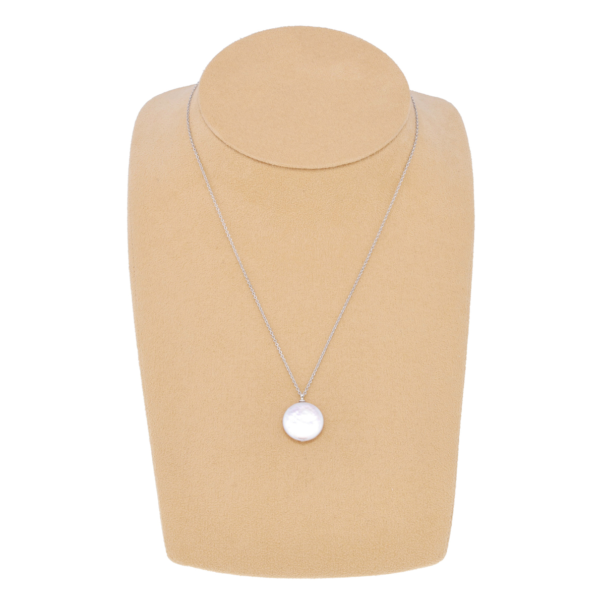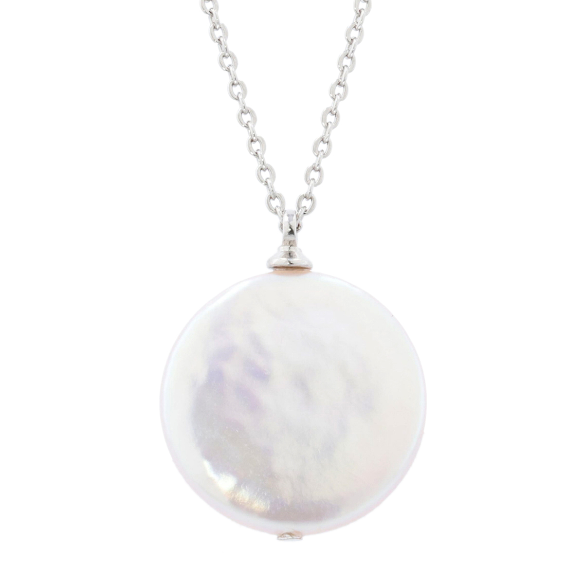 シンプルな淡水コインパールのペンダント。様々な装いにデイリーで合わせやすく、胸元をさりげなく上品に演出してくれます